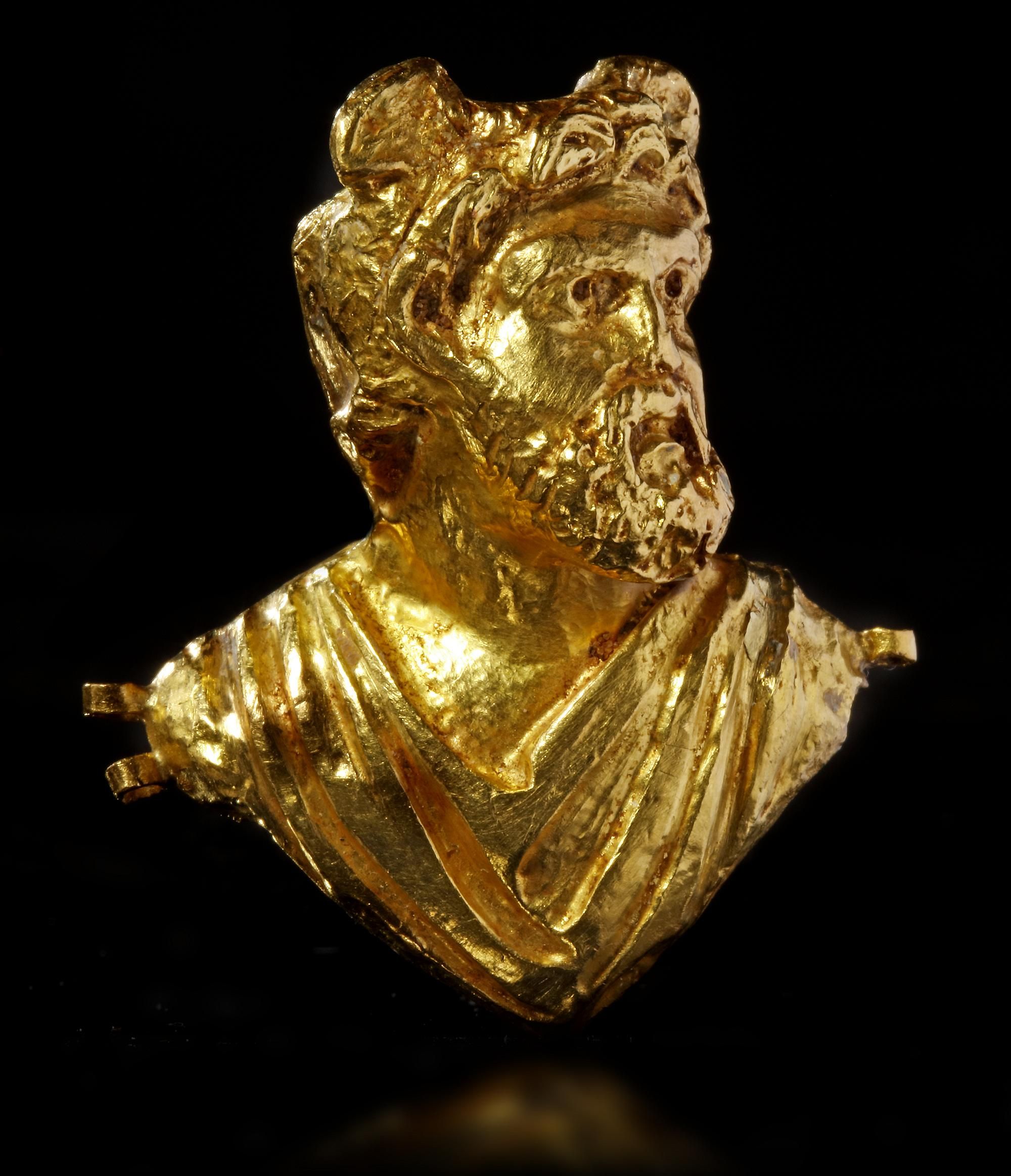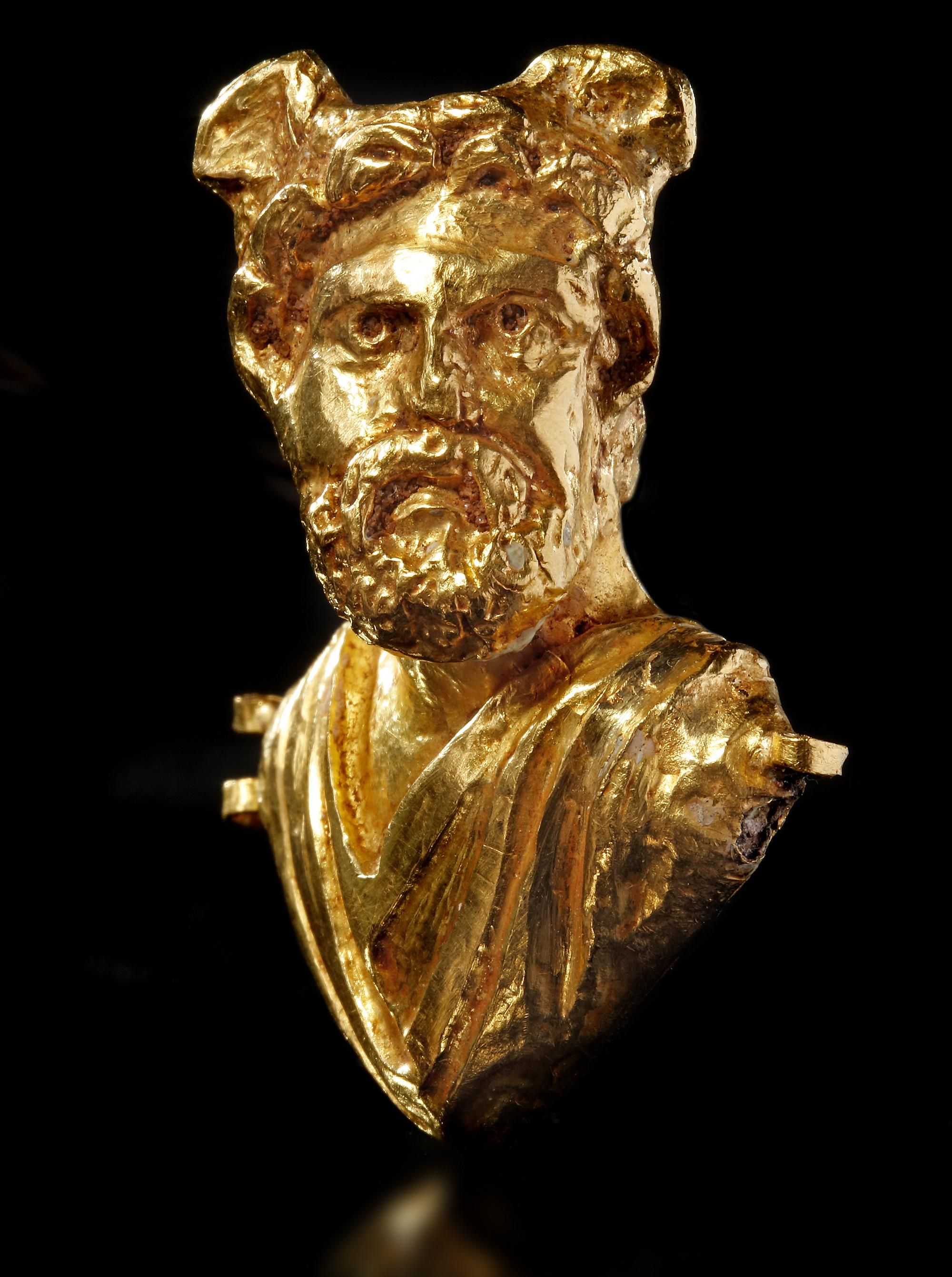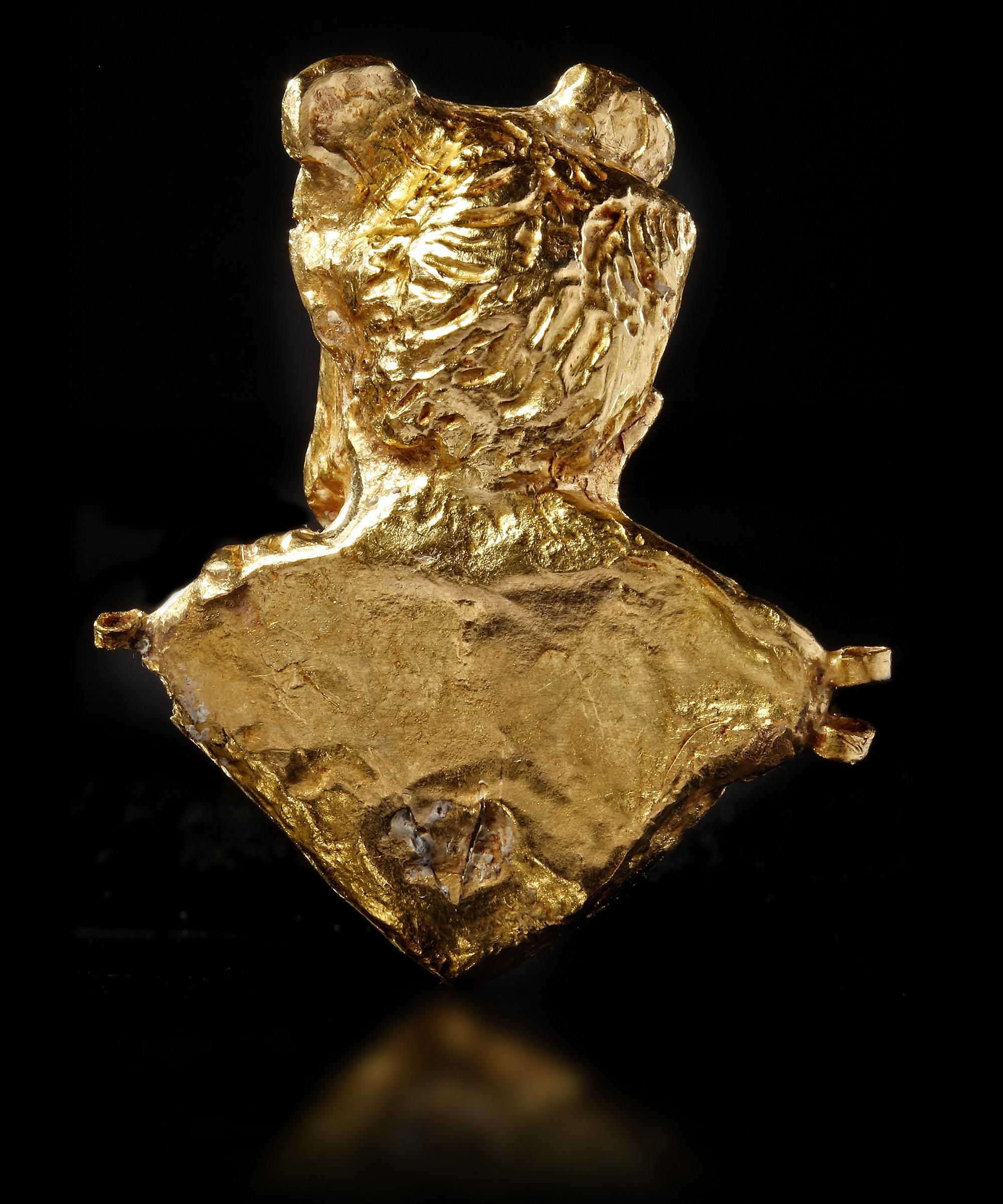 The bust has been fashioned from gold sheet which has been probably made with a two sided mould and soldered at the seams. With two loops on the right shoulder and one on the left. This suggests that the bust was a central element of a bracelet.