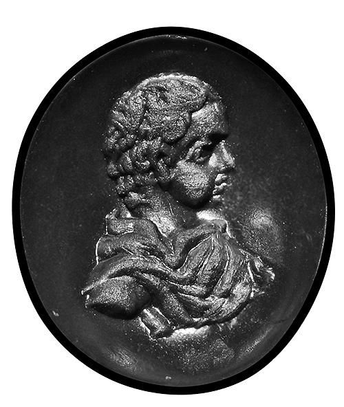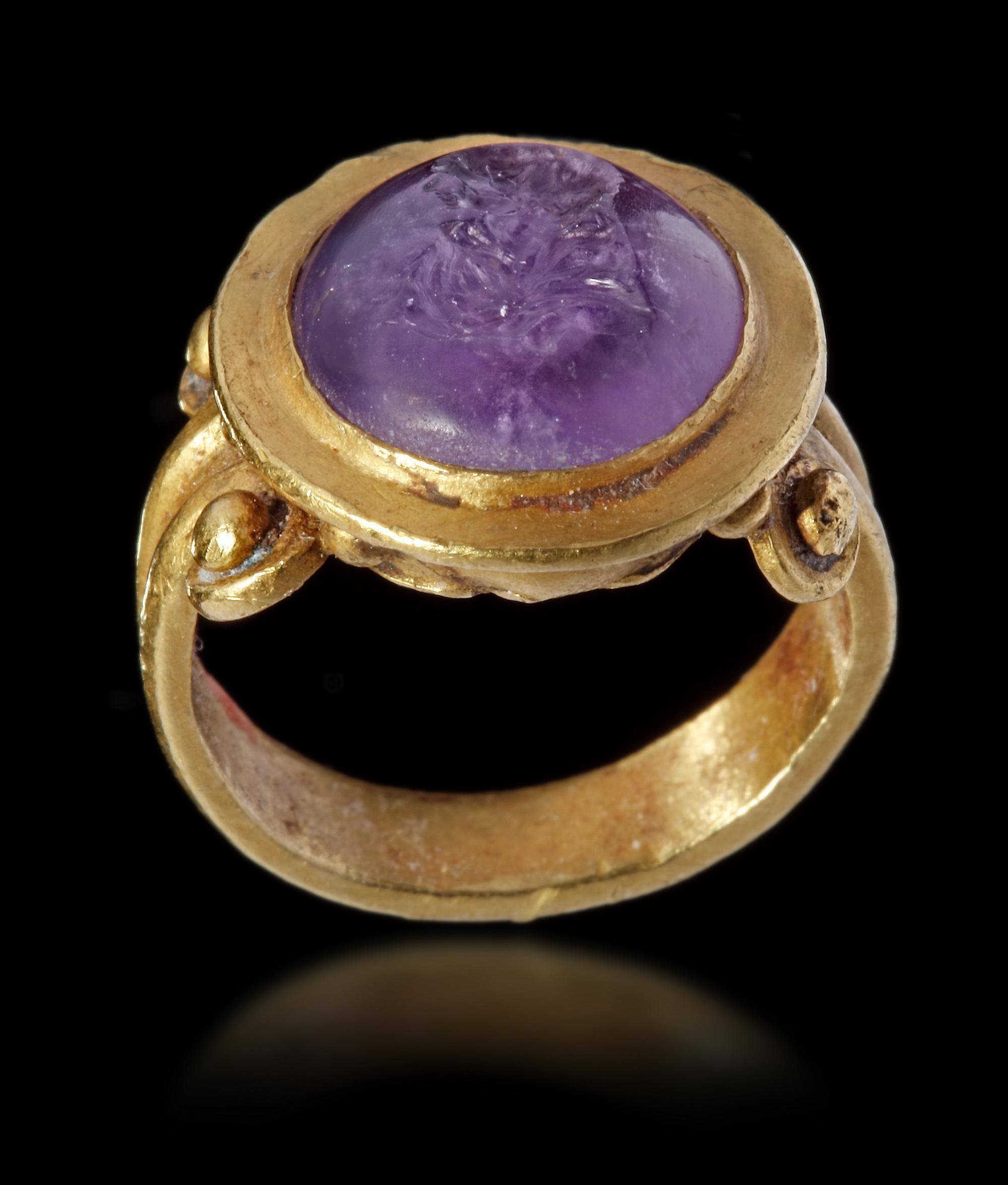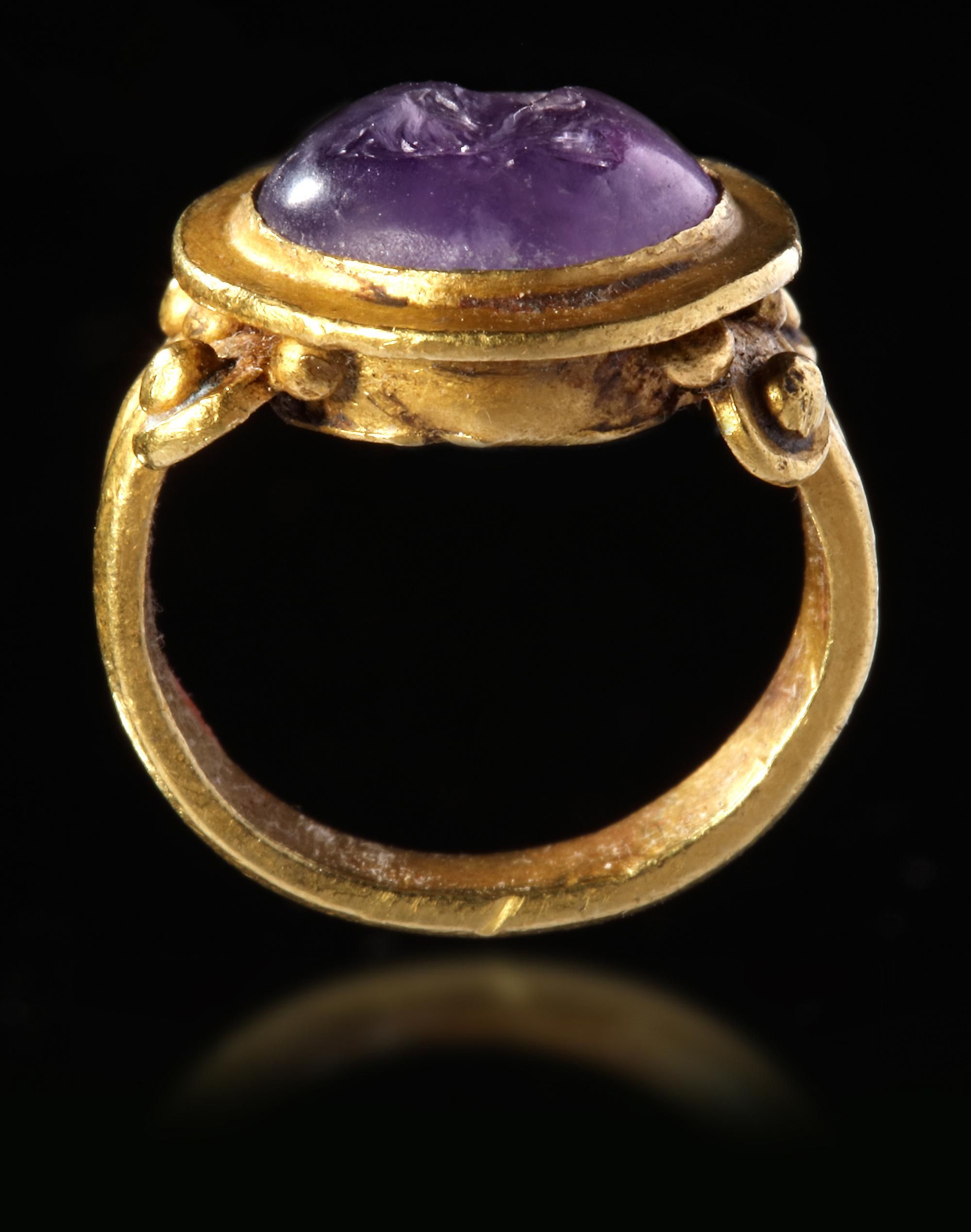 The oval amethyst cabochon intaglio engraved with a portrait bust facing right, wearing draped clothing, likely to be the portrait of the young Caracalla. Ring shoulders with scroll to each side of gold band.