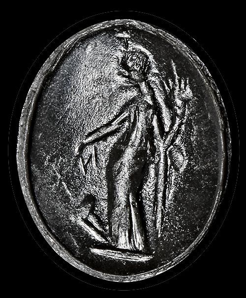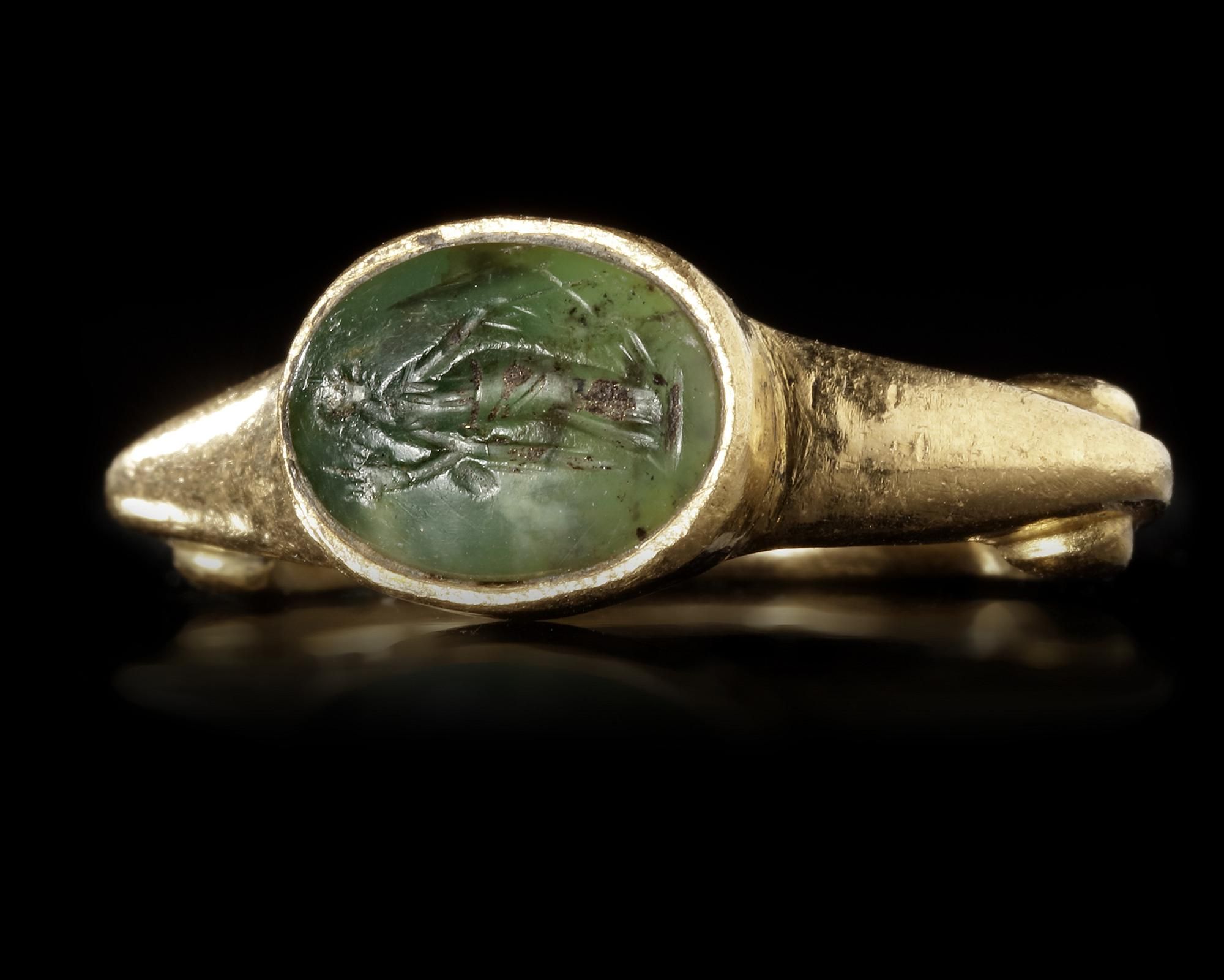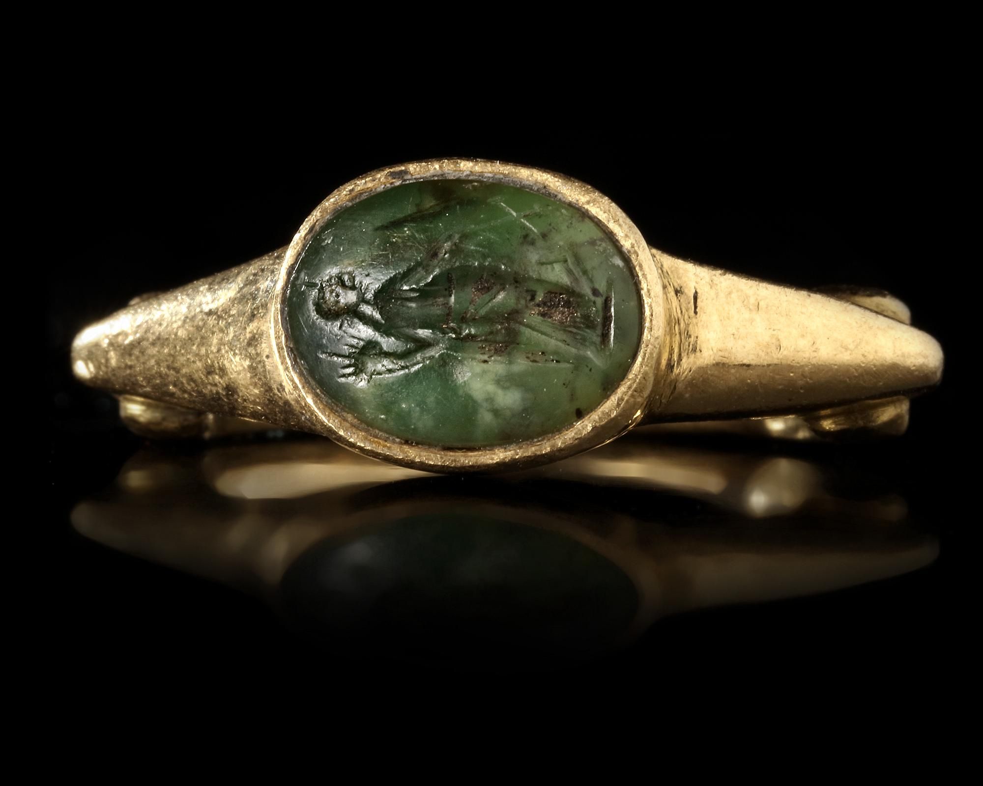A Roman gold ring with a chrome chalcedony intaglio showing standing figure of Fortuna, holding a cornucopia and rudder.