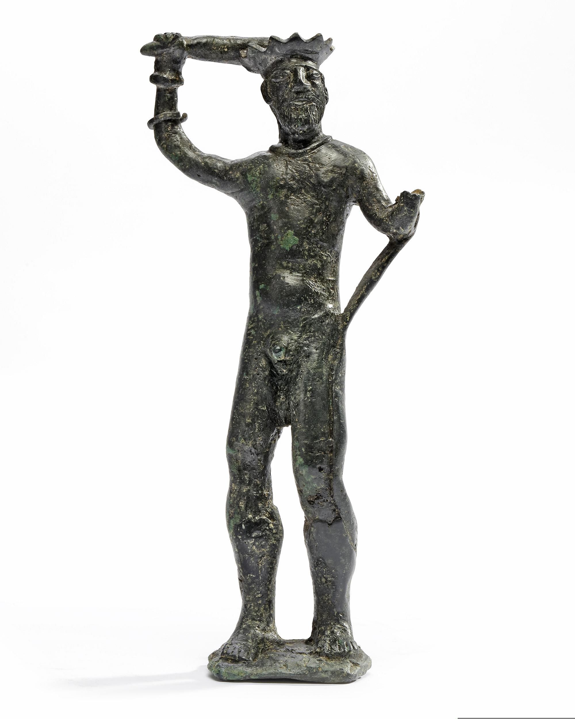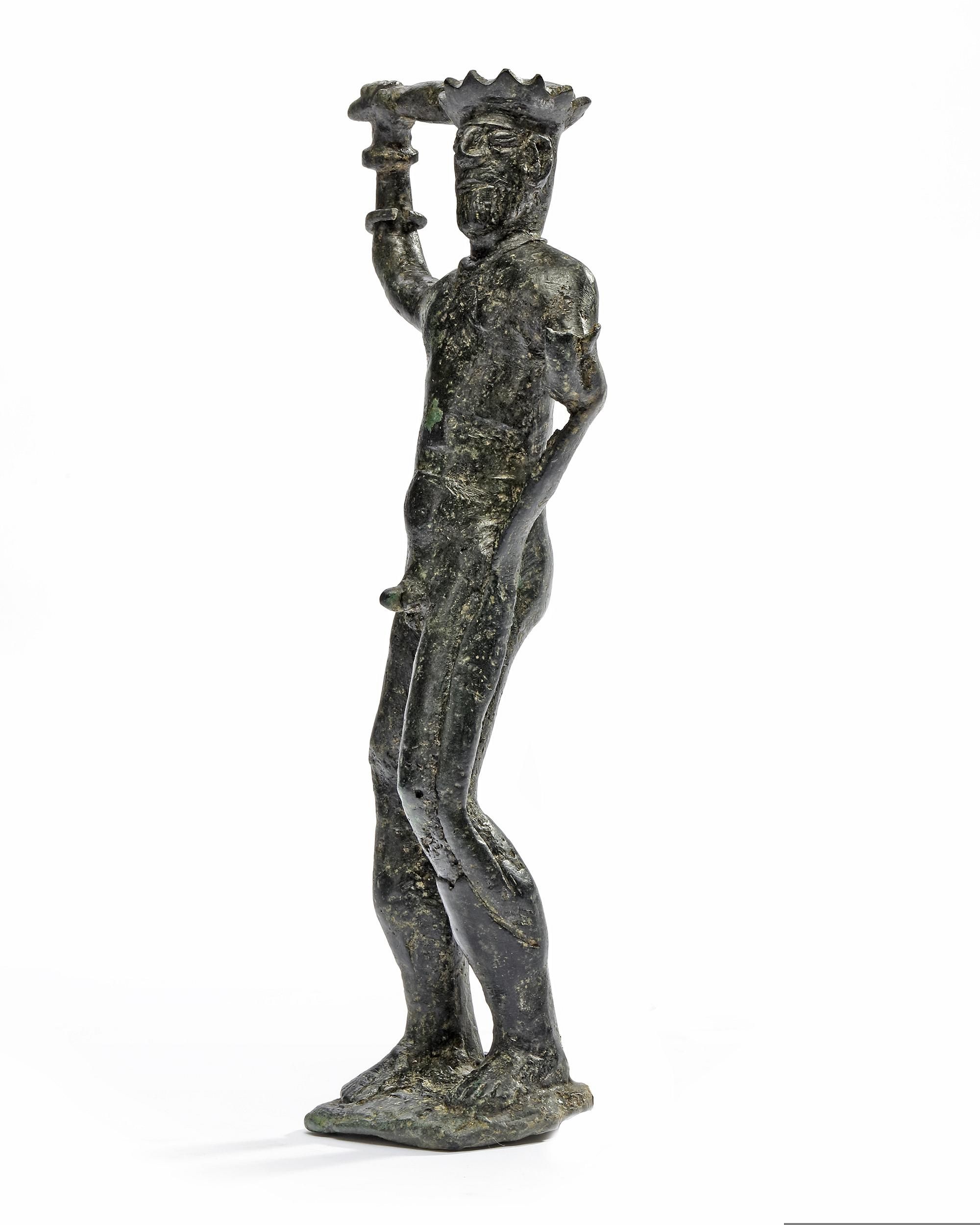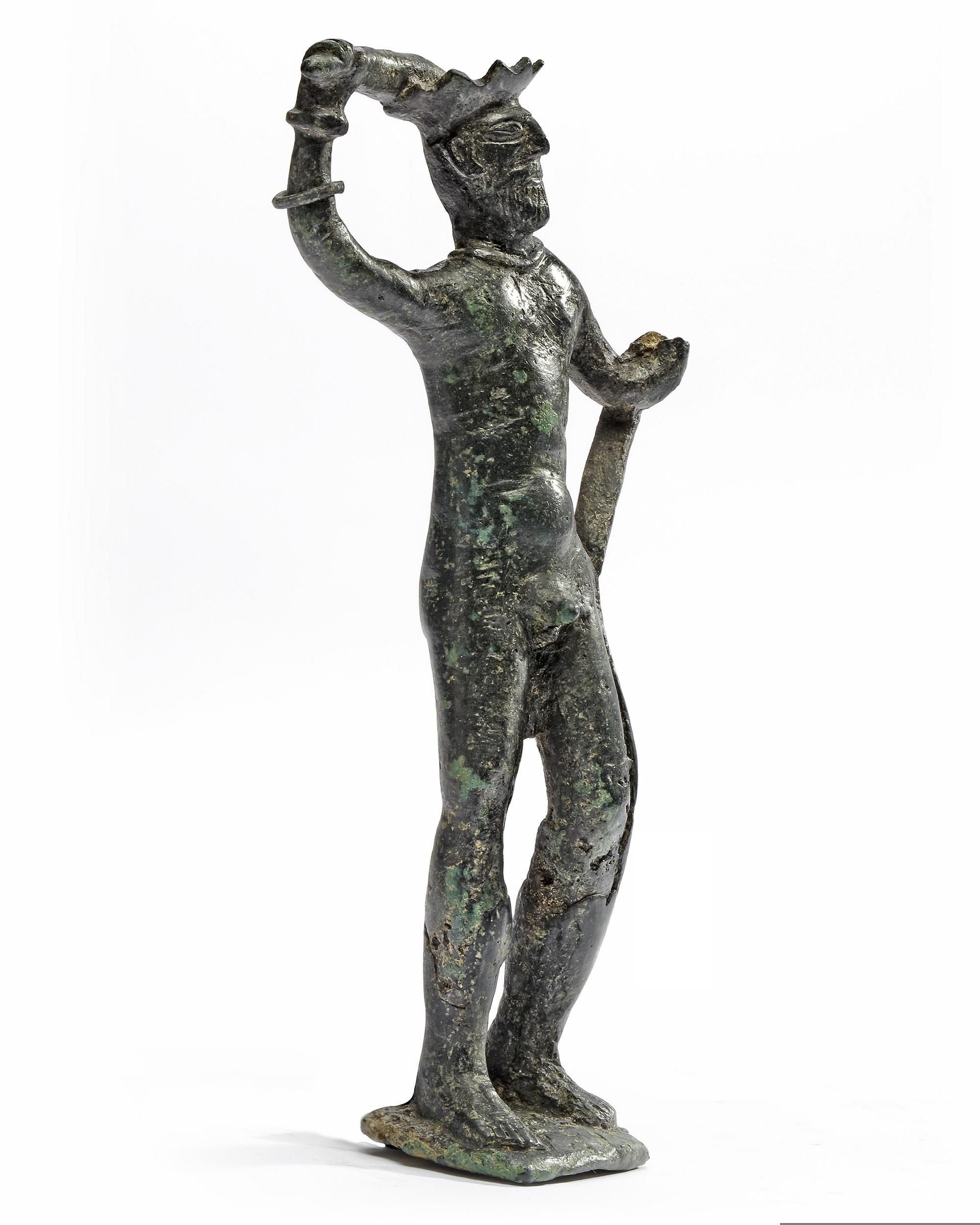 Bronze male figure/deity holding a club in one hand and a snake in the other hand. Serpents have different symbolisms in ancient cultures, from sovereignty, fertility, eternity and courage. The iconography of this object would suggest the expression of bravery and courage. The form of the crown is similar to the headdresses of the figures from Susiana in southwest Persia in the Elam region during the early 3rd millennium B.C., so it could be attributed to Early Elamite period. The artifacts from this civilization are extremely rare.