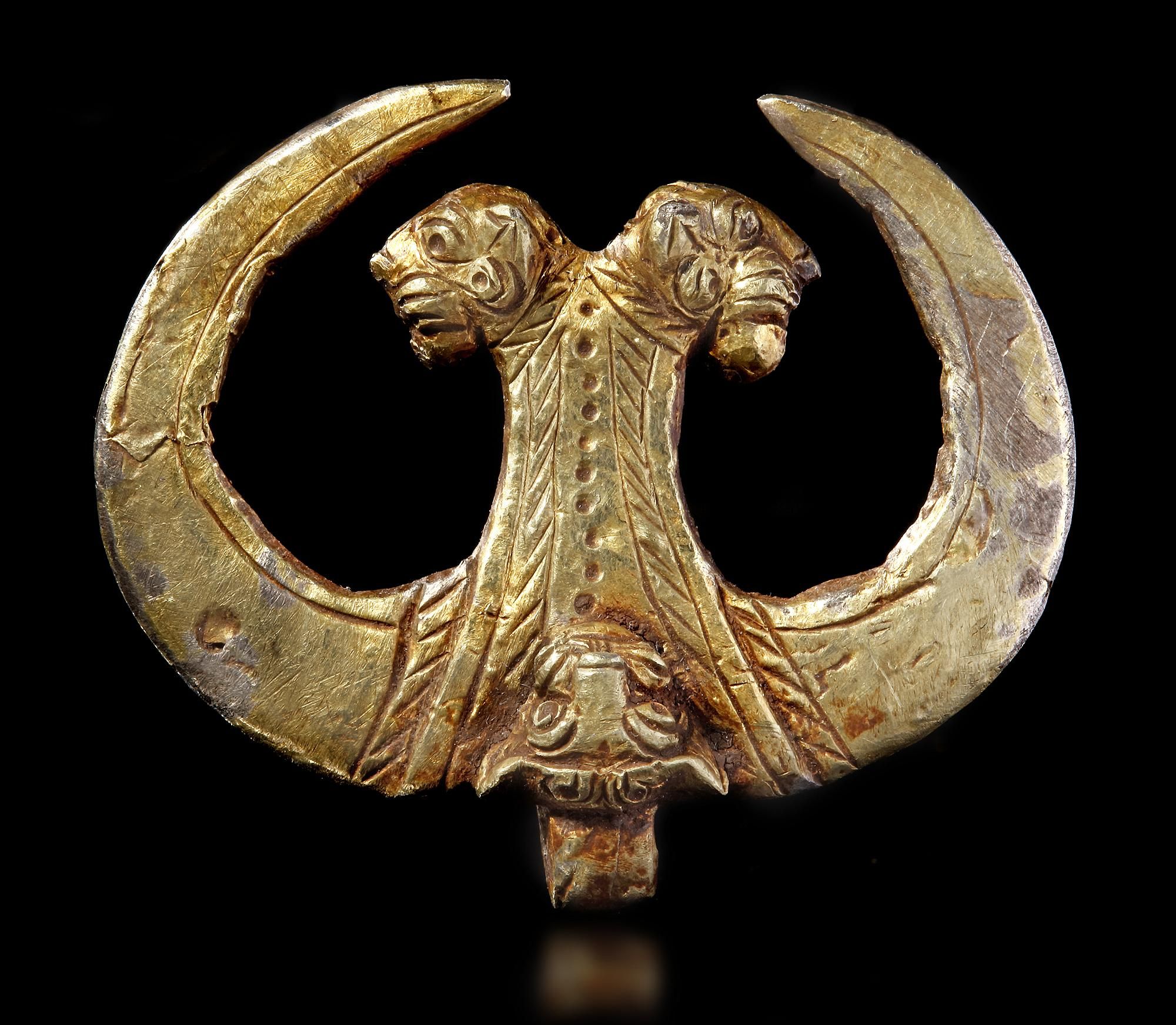 The pendant ends in two lion heads facing opposite directions. The gold covering seems to be a gold sheet which has been brazened to the surface. The decoration has been applied after the chisels and punches.