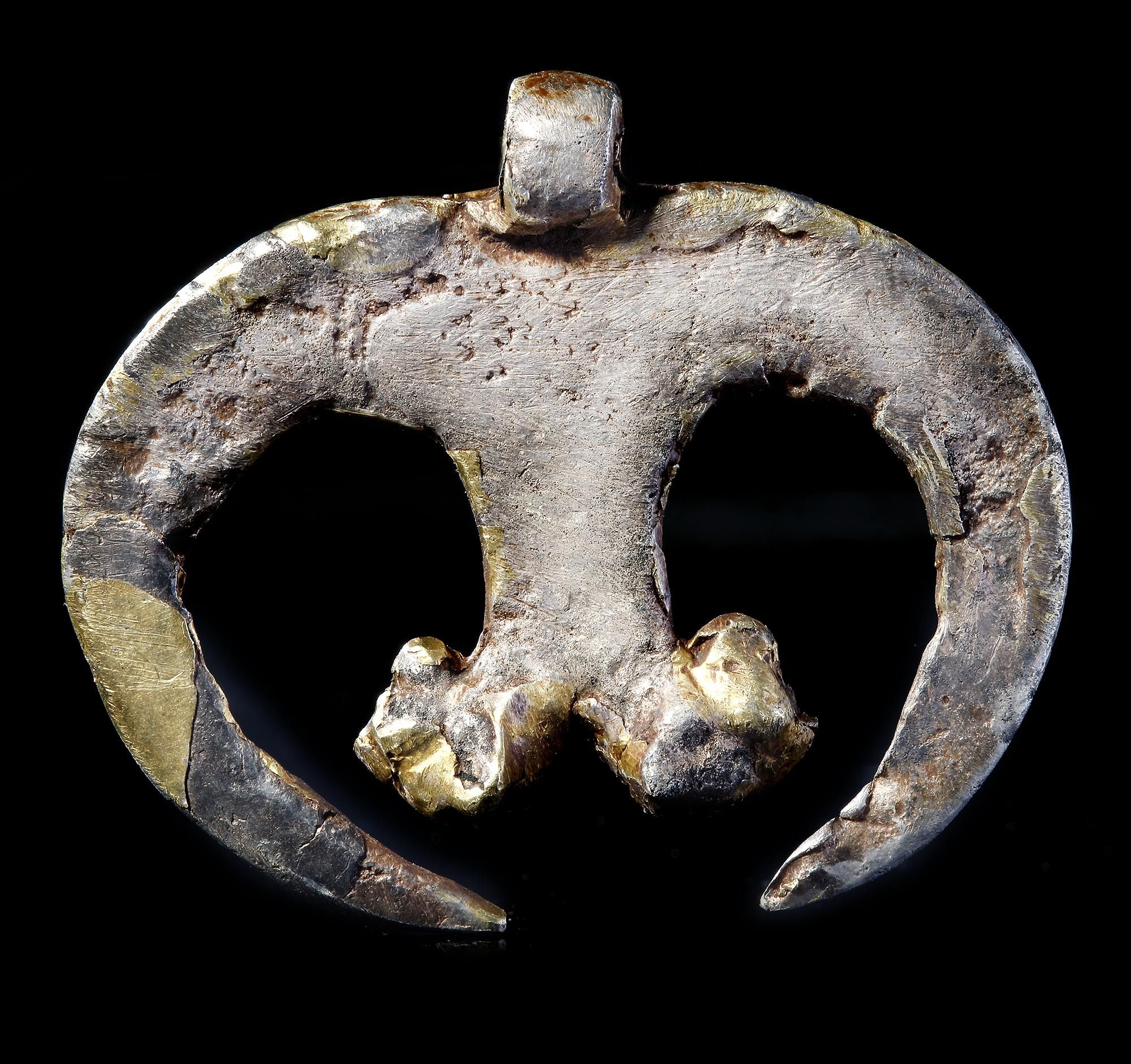 An Anatolian cast silver lunate pendant with the front covered in gold. The pendant has a loop for suspension with the facing head of a lioness below.