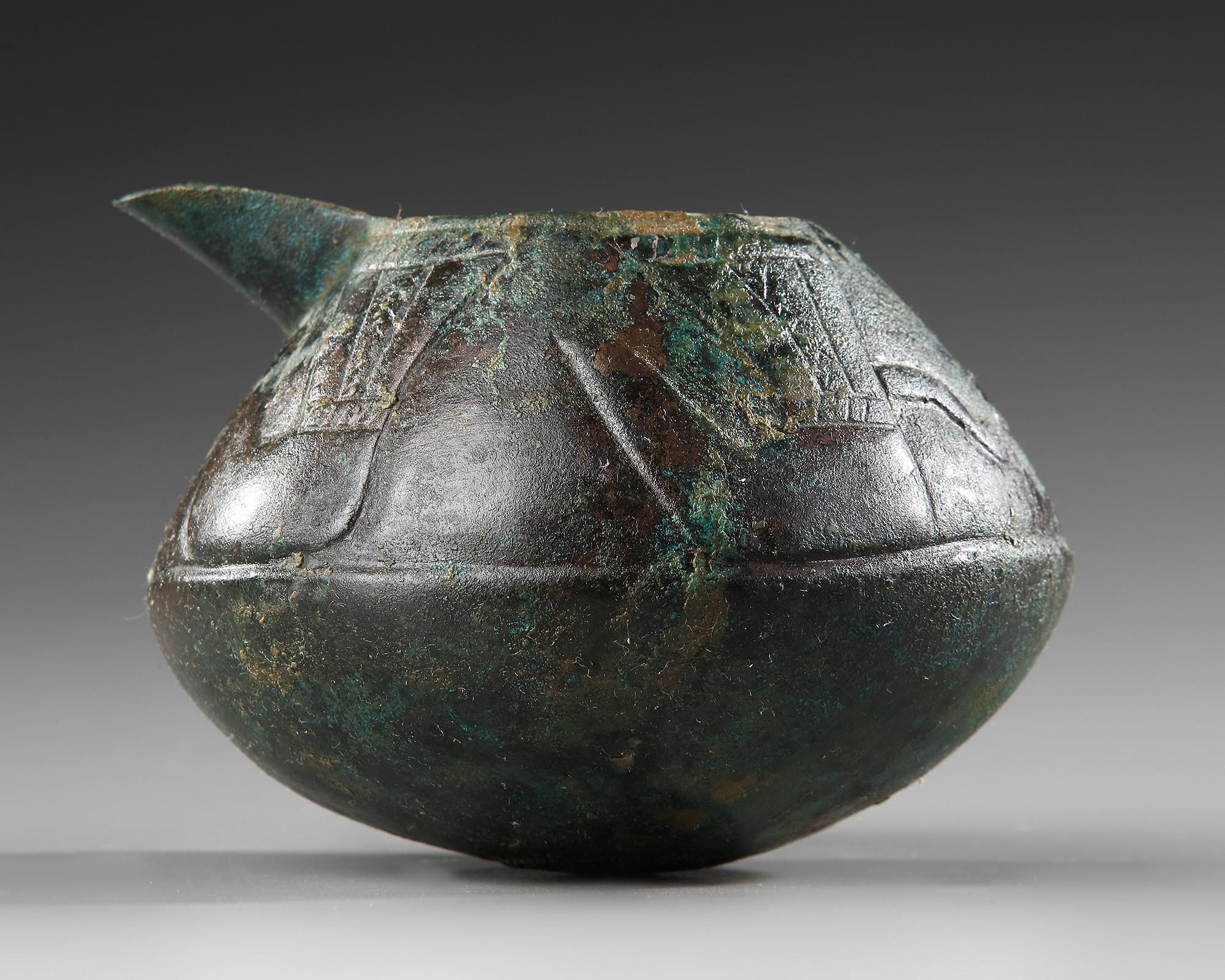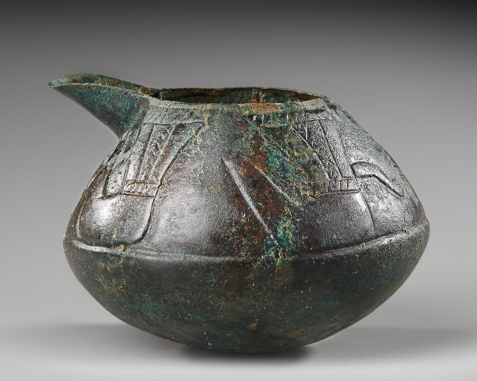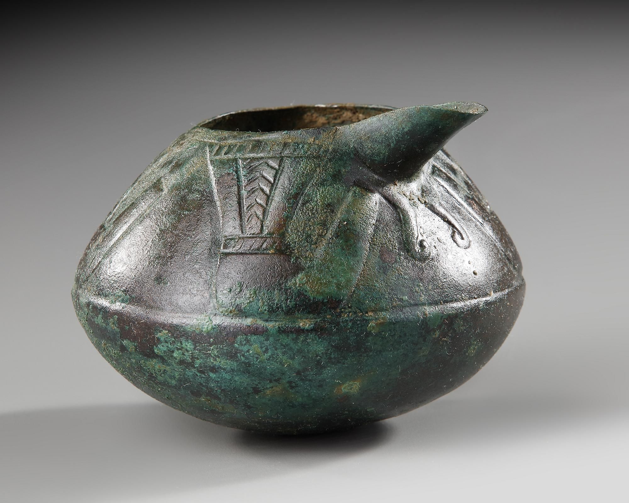 A Phoenician squat lentoid shaped spouted vessel decorated with boots in repoussé with flared uppers and an upturned toe. Protruding from the boots are scrolled appendages which on two are seen attached to the heel and on two attached to the toe. A simple single lipped spout is fashioned from the rim.