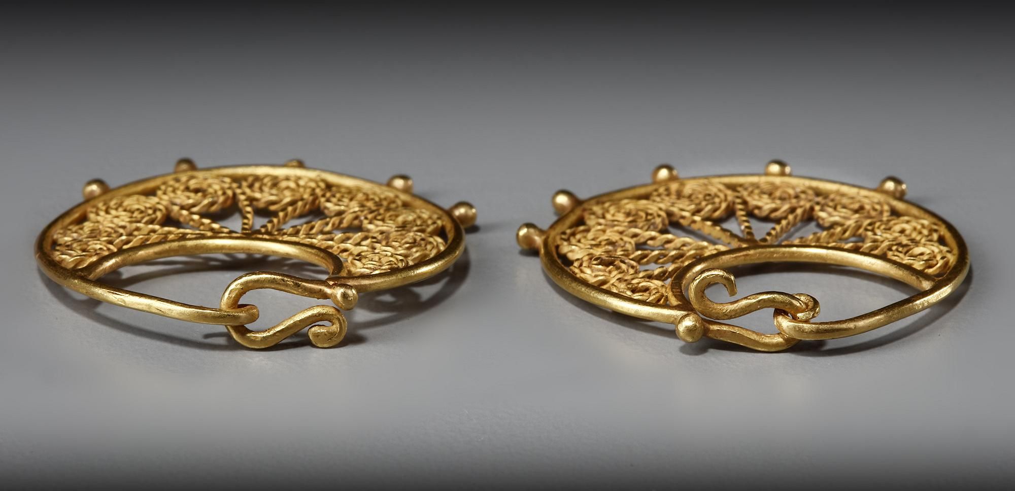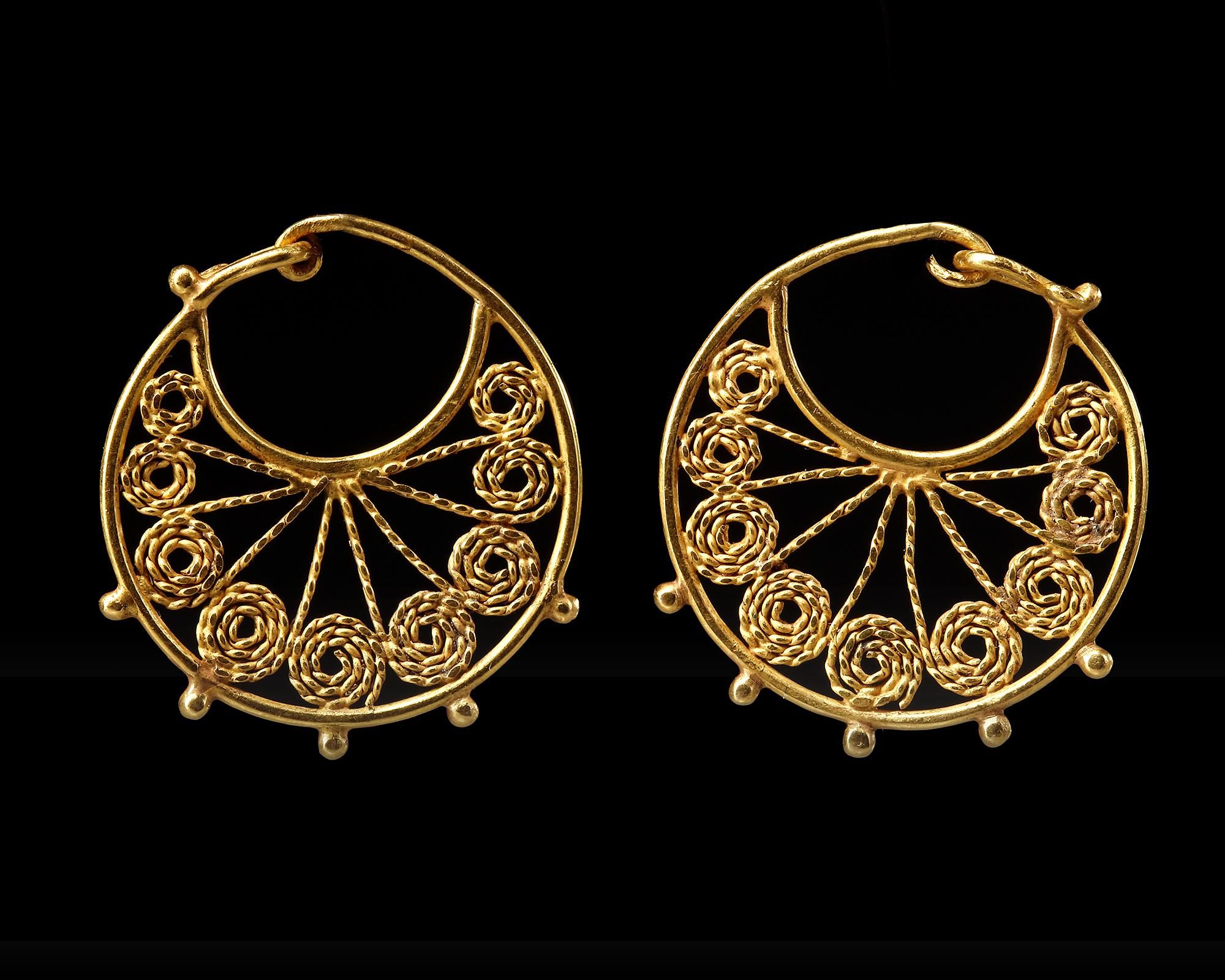 A pair of gold earrings made from a circular thick wire which forms a circular loop closed with two hooks. The outside wire is decorated with five shouldered globules and the lunate panels created by another curved wire, with nine twisted gold spiral elements soldered together and flattened, radiating outwards from the central point. While the general shape reminds one of earlier prototypes the use of the hammered twisted wire is a technique used in later times.