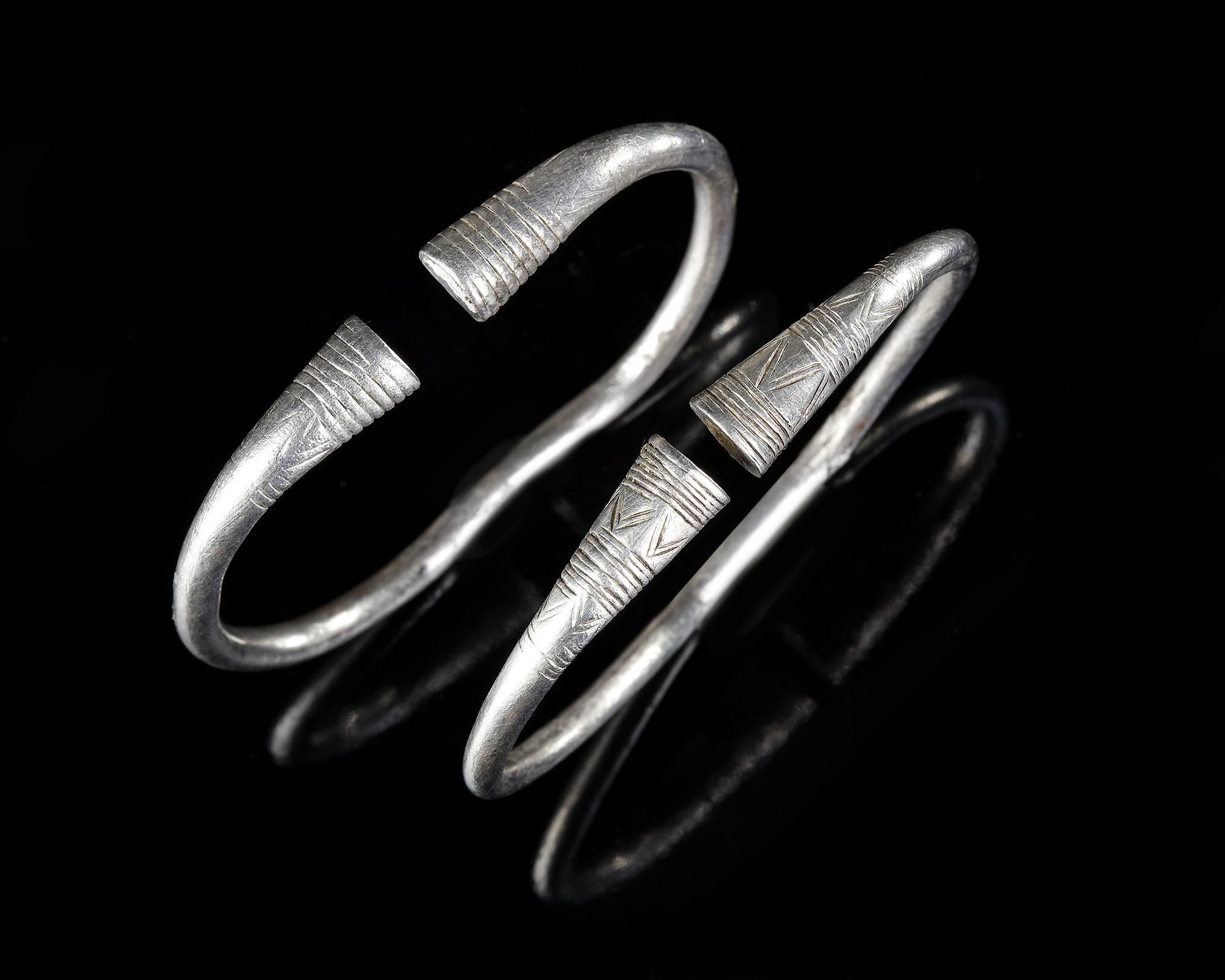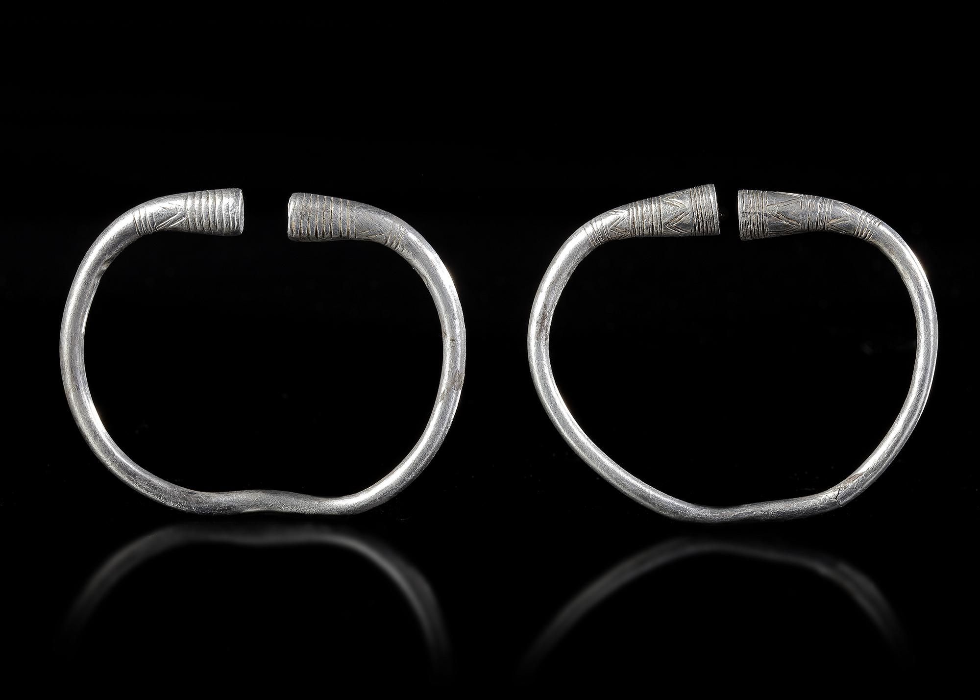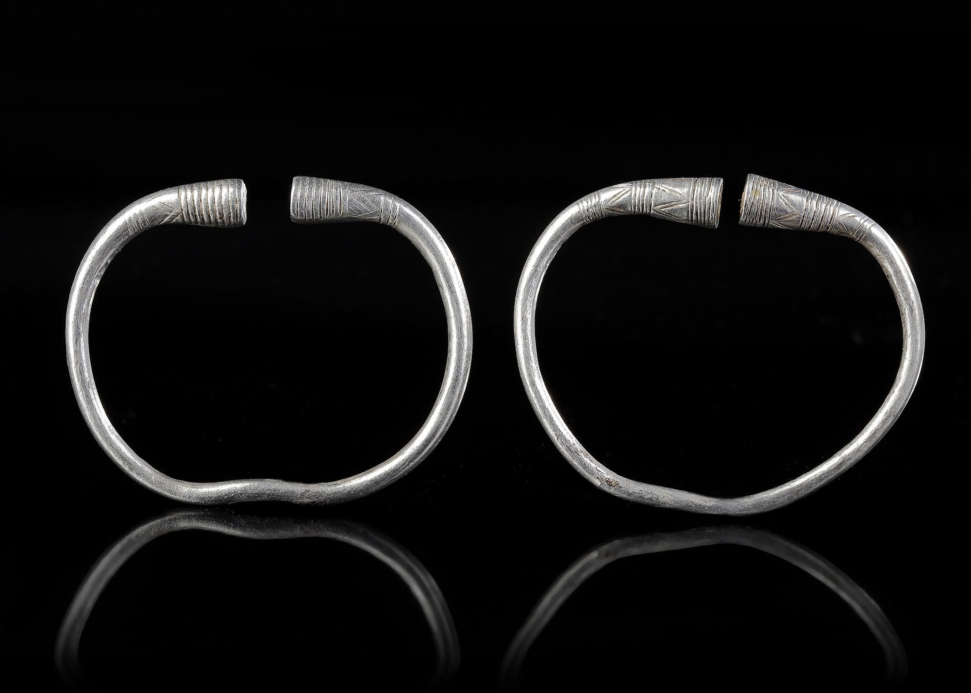 A pair of penannular silver bracelets of a type which existed in the Middle East for a very long period from the early first millennium to the end of the Achaemenid period. The finals are flared and have an incised geometric design.