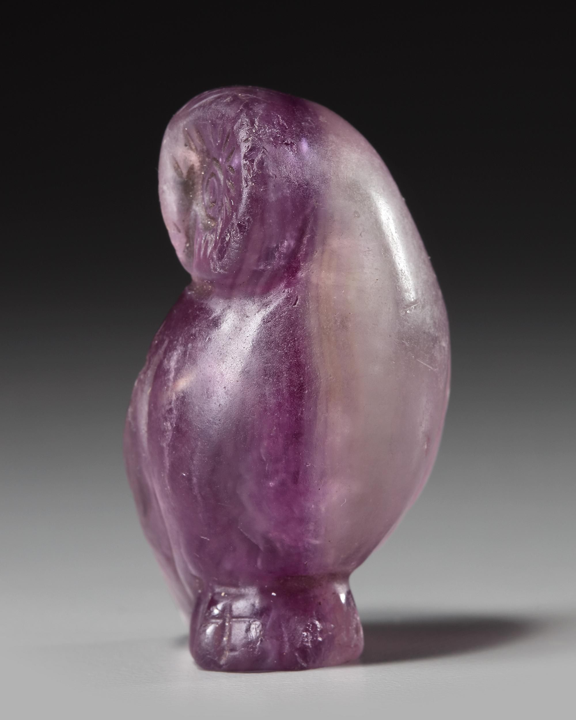 The tridimensional carved amethyst in form of the famous owl of Athens. This mythological sculpture is characterised by a horizontal elongated head and big rounded open-eyes. The head feathers and the pupils are deeply carved. The face is frontal meanwhile the body is turned to the left. The wings, and some other feathers are represented by the same carved-lines. The posture of the bird and the general appearance are referring to the mythological owl of the goddess Athena, symbol of the city of Athens (see coinage production). This sculpture can be seen as a votive idol or a very precious protective amulet empowered by the image linked to the goddess of wisdom and strategy. This unique specimen is a beautiful example of the ancient craftsmanship from the choice of the bicolor fluorite and its artistic treatment, combining both the stone and the mythic animal characteristics to emphasize the power of the symbolic hence the protective function of the sculpture.