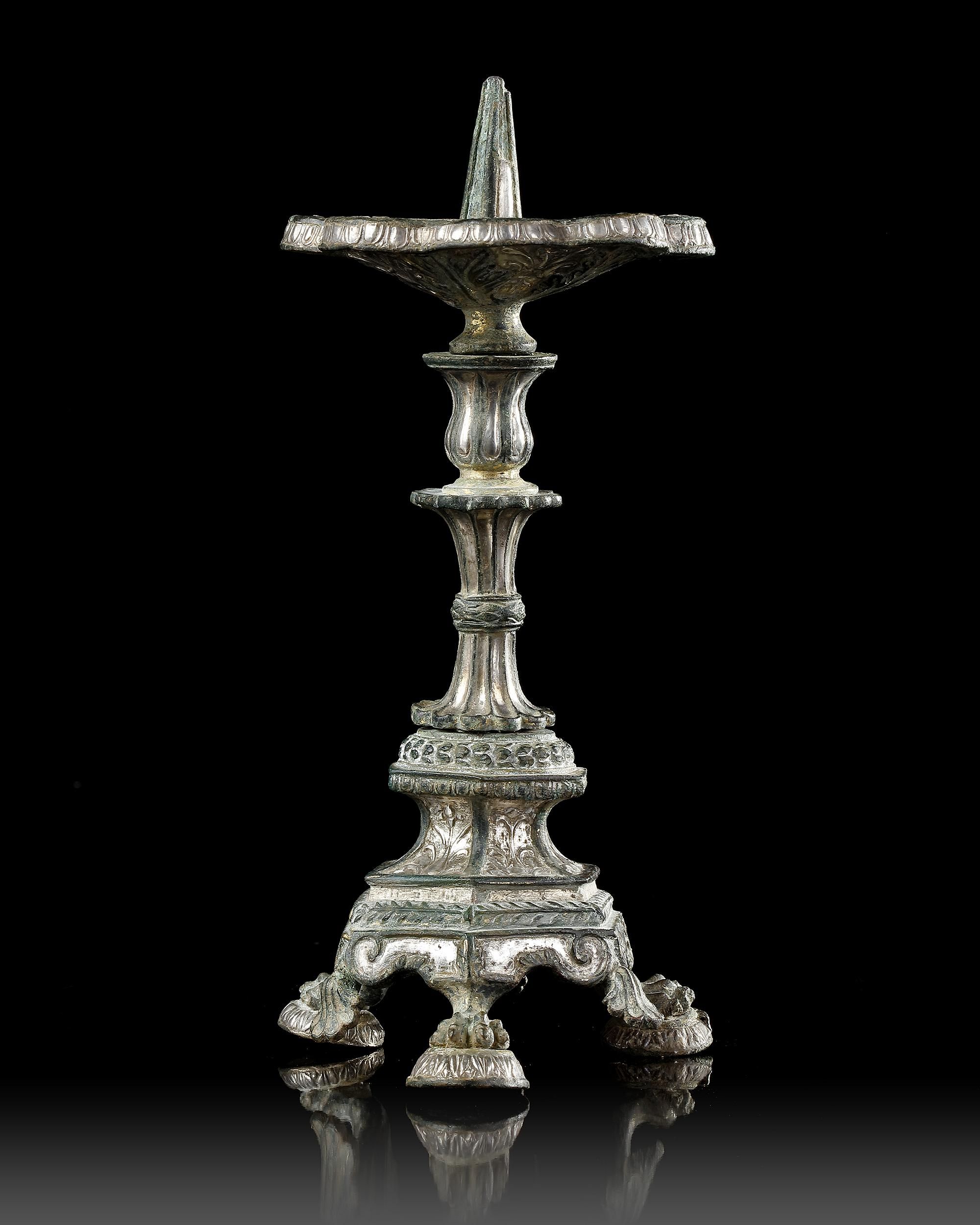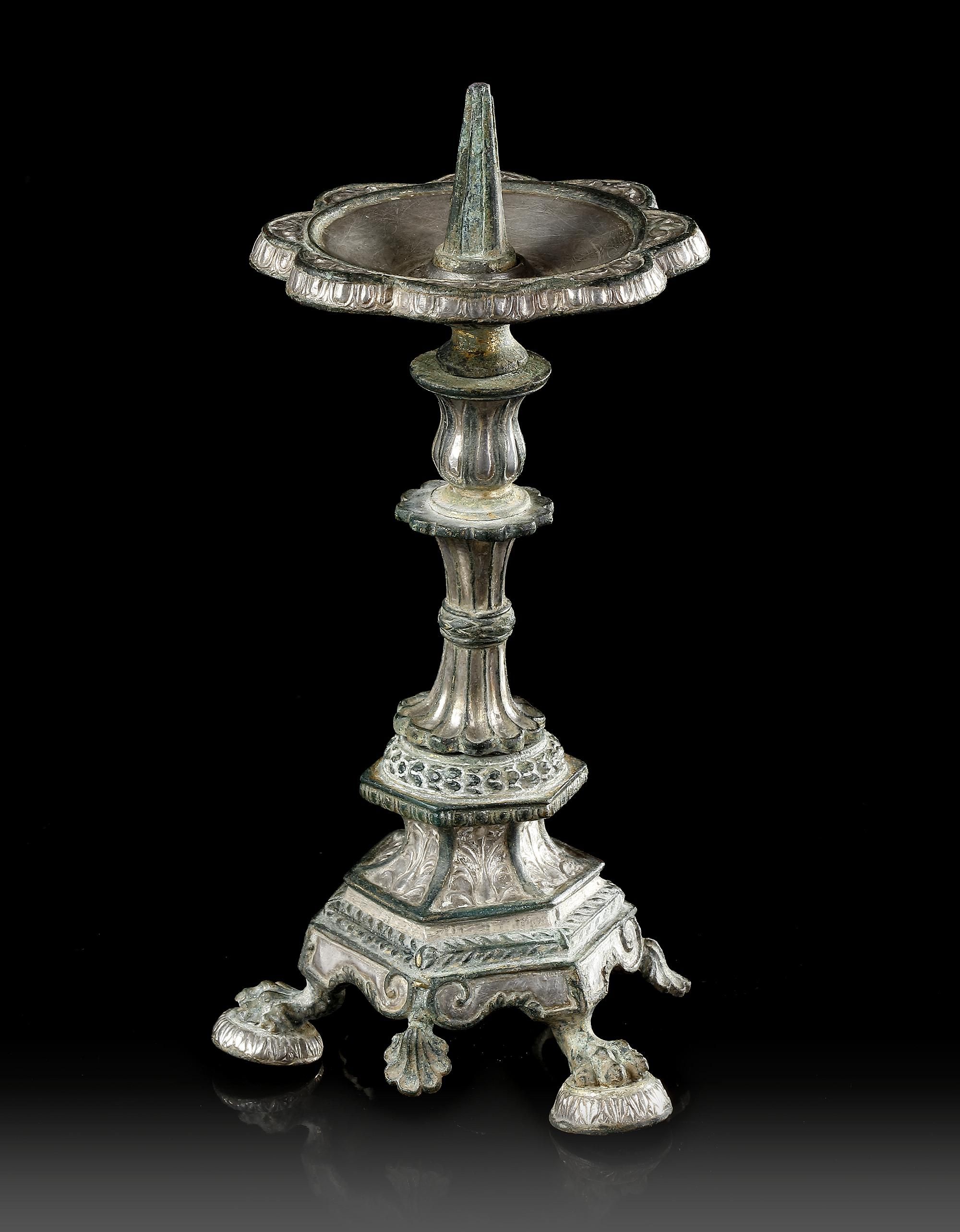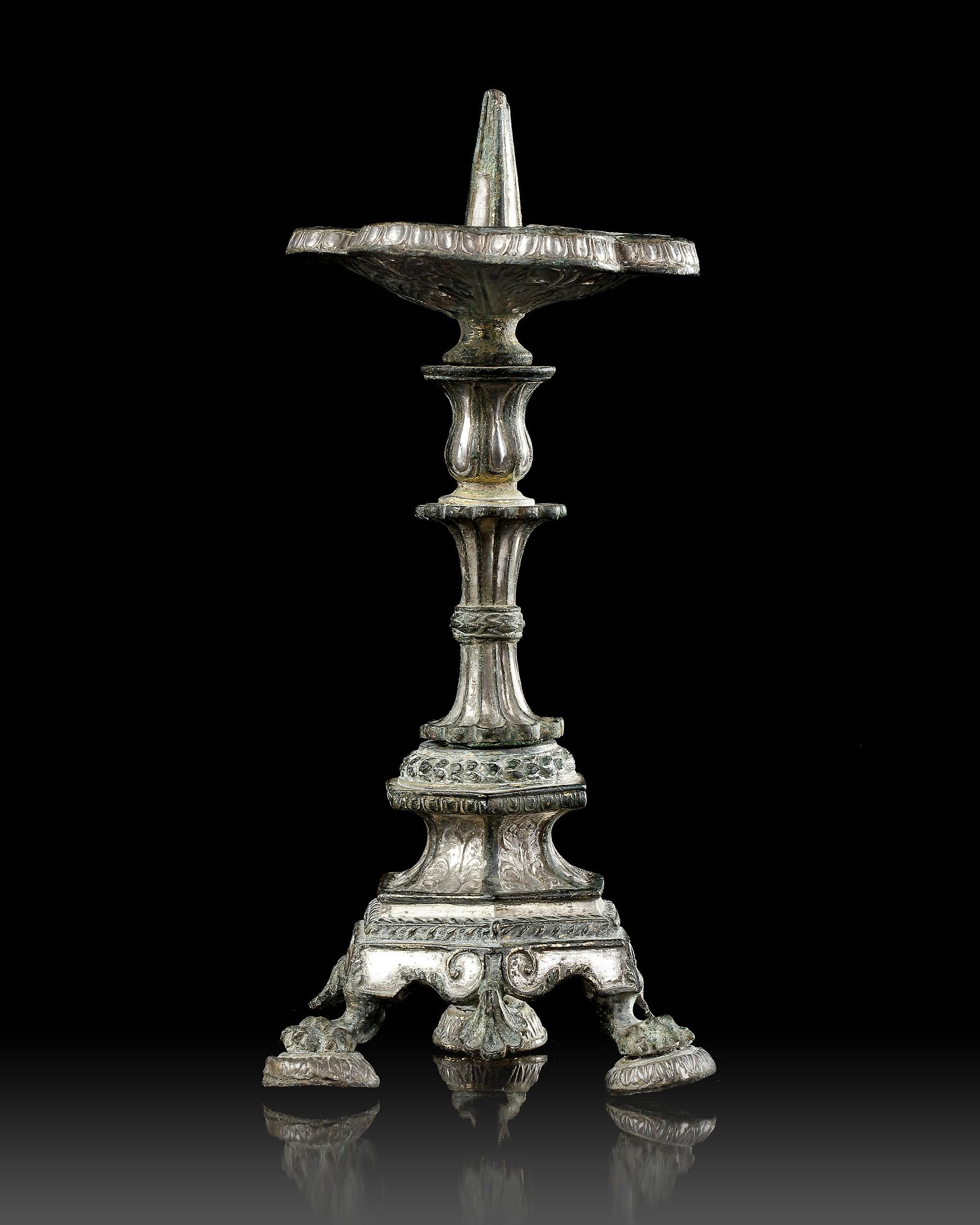 A byzantine bronze candlestick with gilding and silver inlays. It is a very elaborate support for a candle or lamp. The composite nature of the stand has virtually no parallels among similar known objects. The use of intricate decorated inlays and gilding, meant that each element had to be individually manufactured separately and then joined to each other meaning that the object is put together from eight separate pieces. Such a work must have been produced in Constantinople or another large metropolitan centre.