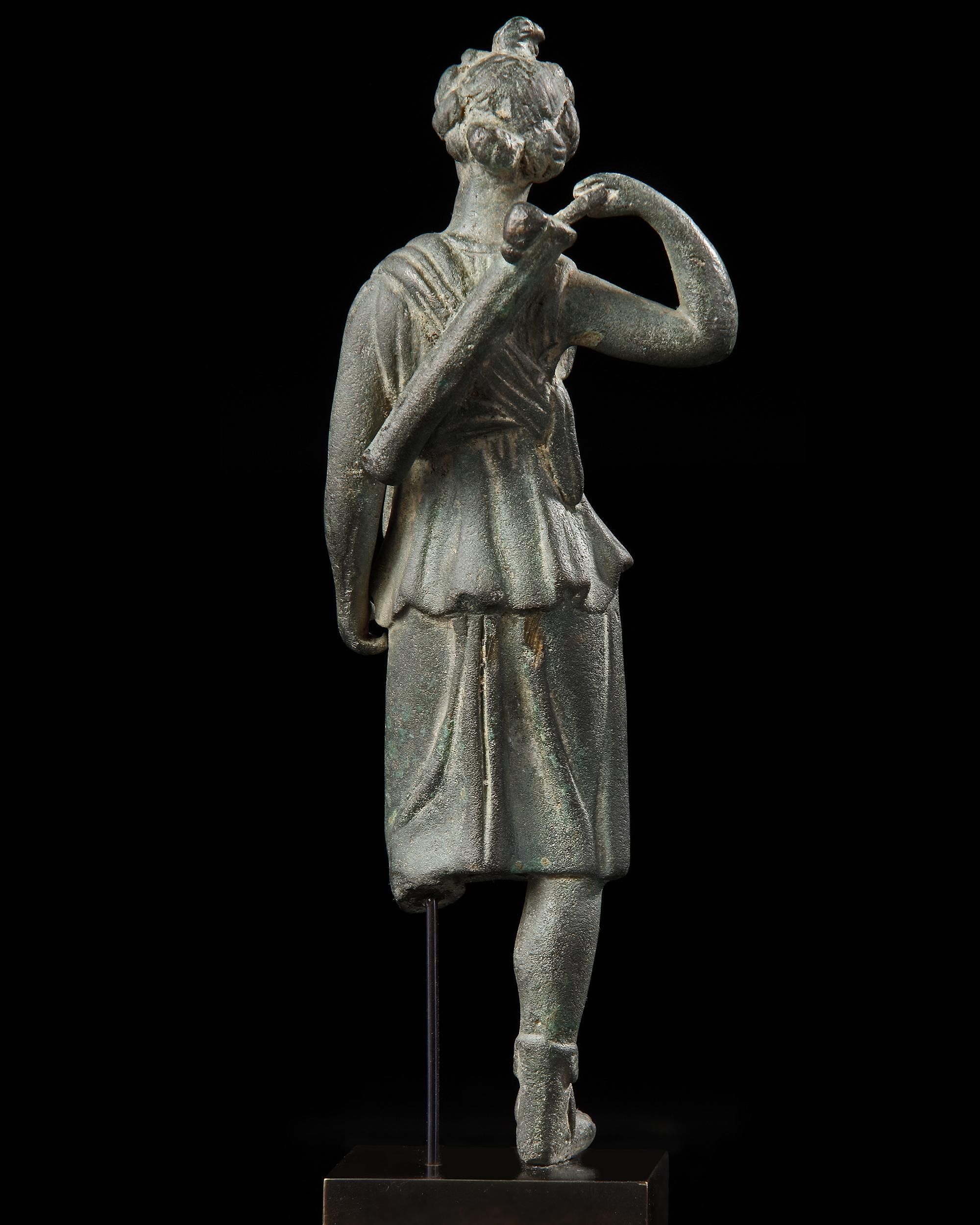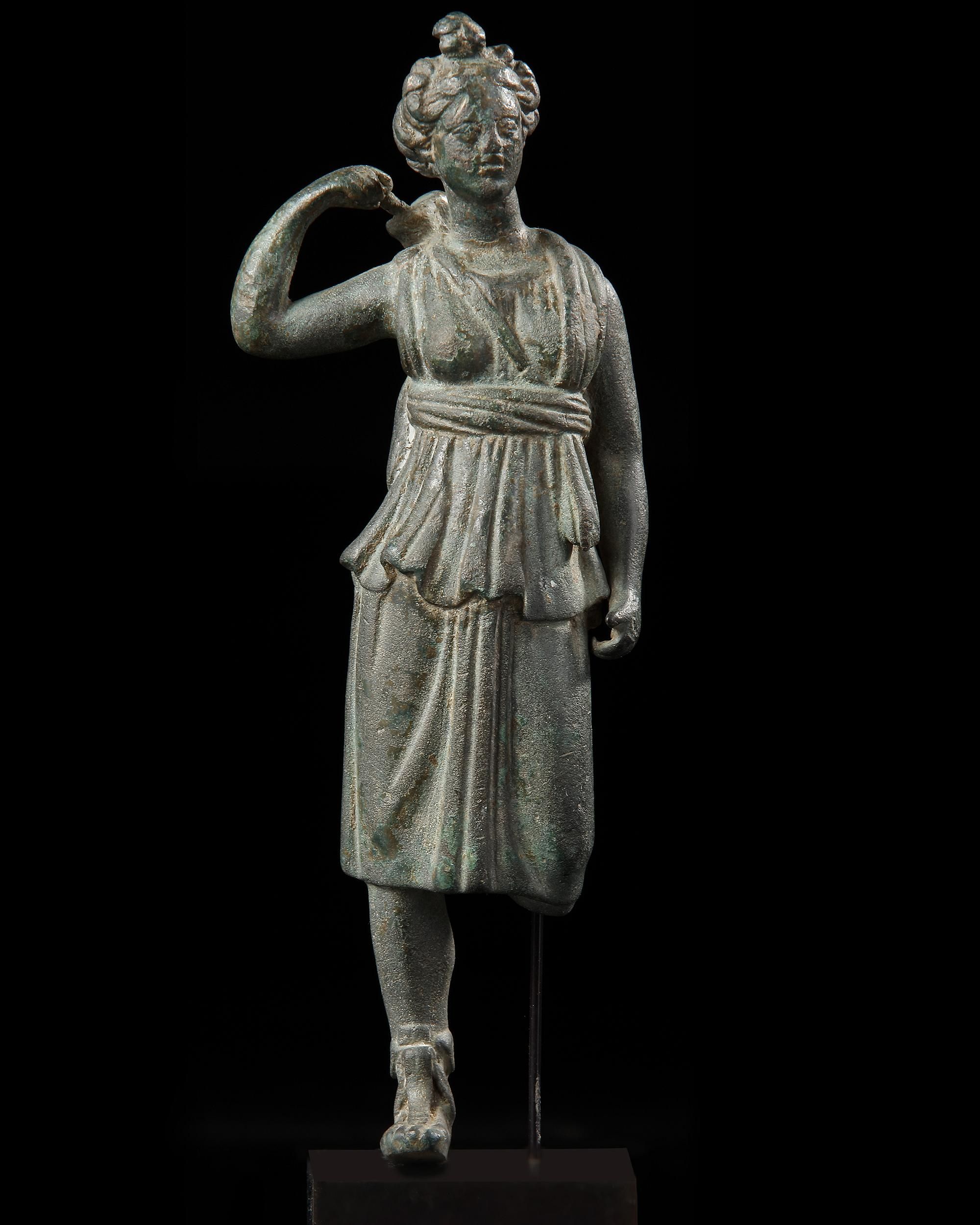 A finely detailed bronze statue of Diana (Greek Artemis), the goddess of hunting, depicted in a relaxed attitude, standing with the weight on her right leg, her right arm bent back, reaching to take out an arrow from her quiver, left arm resting on the side. The goddess dressed in chiton pinned at the right shoulder, sandals at her feet, with a rounded face with youthful features, hair pulled back in a chignon, small top-knot above. Mounted on a custom-made stand.