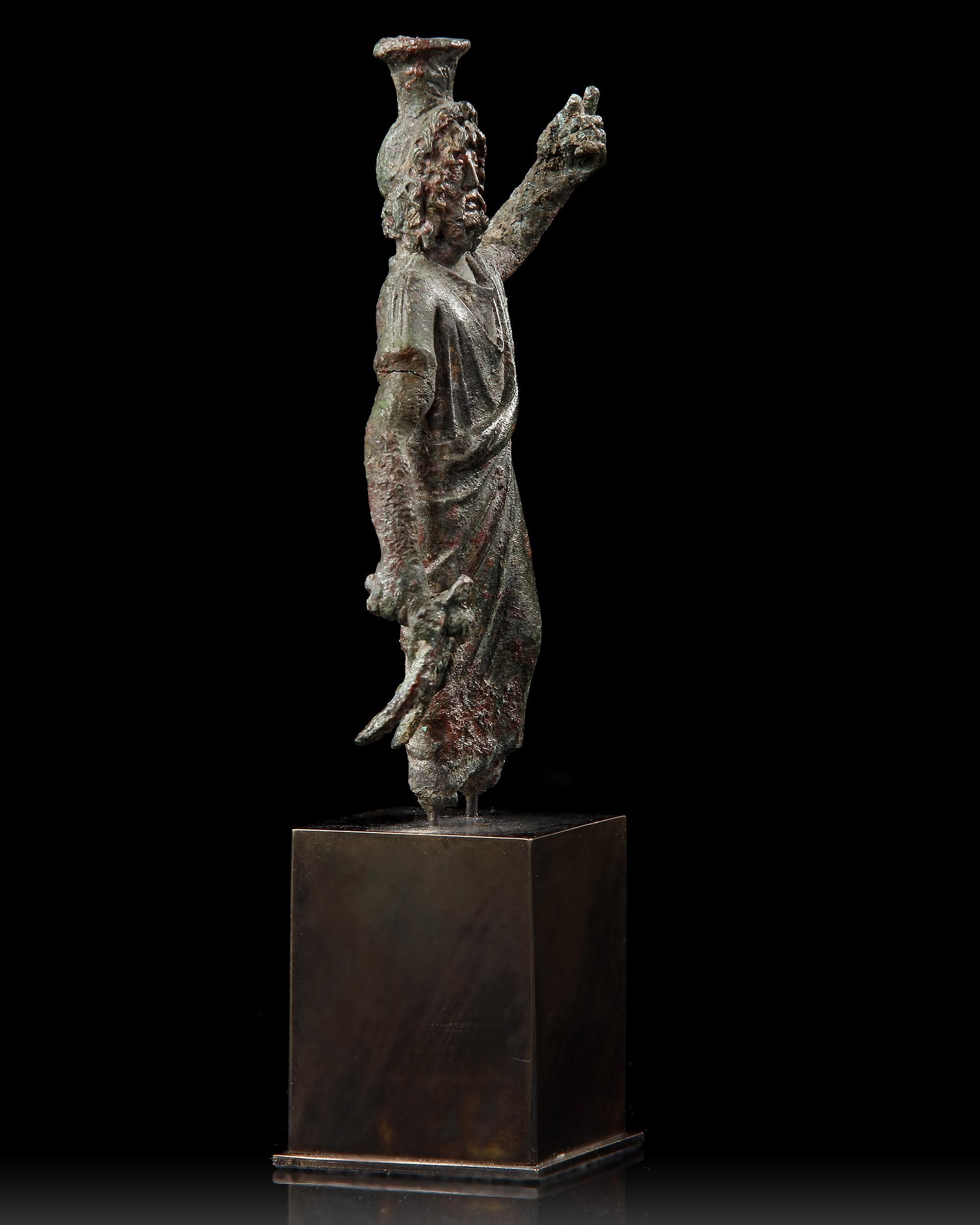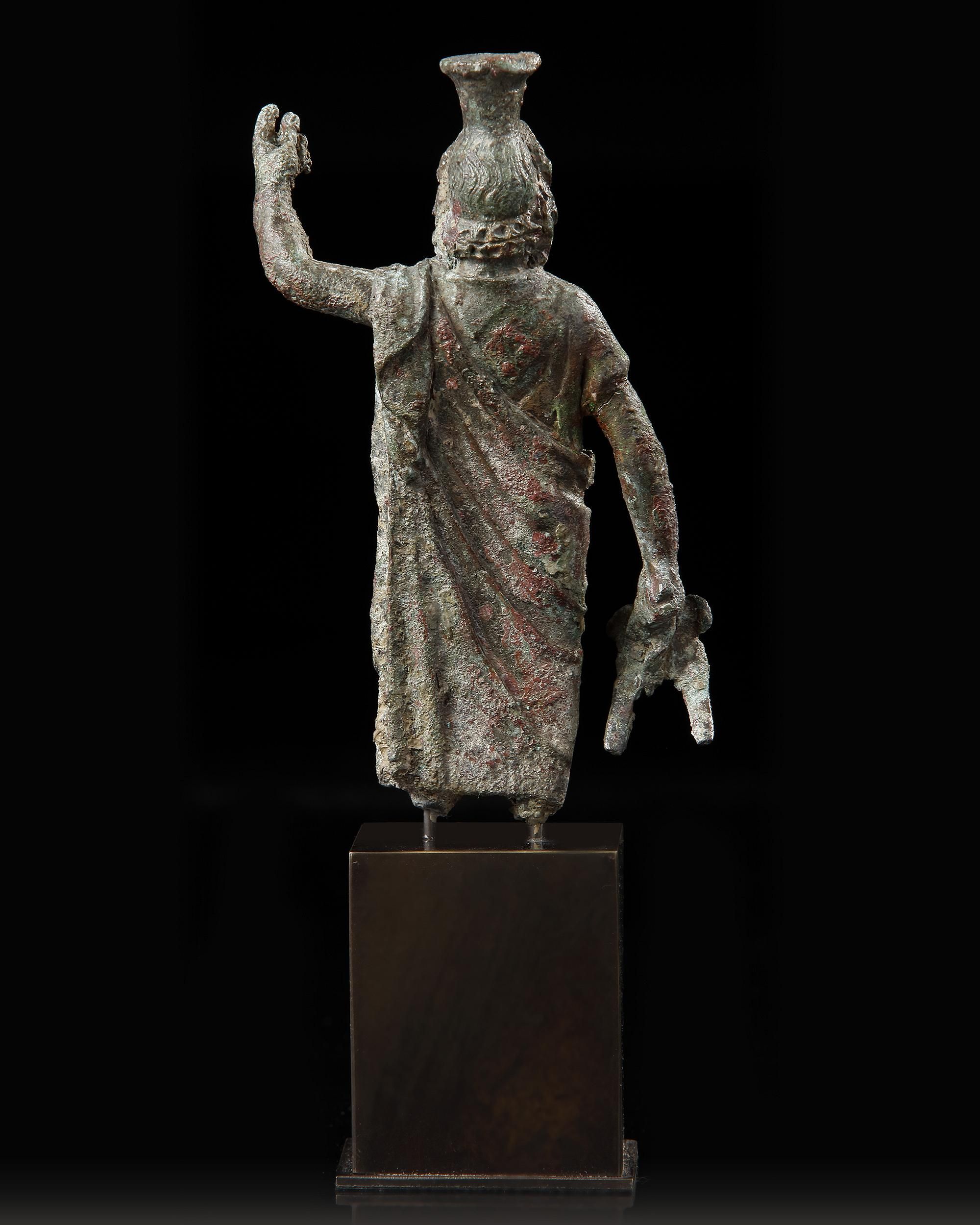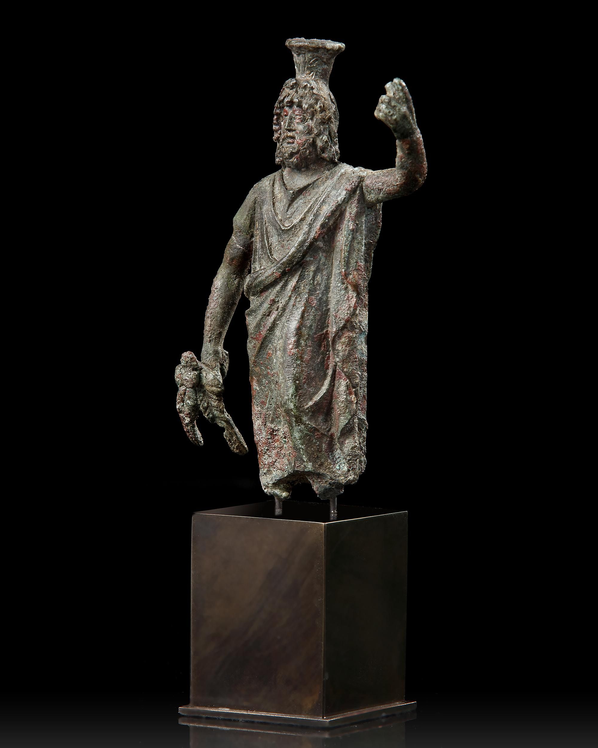 A bronze statue of Serapis, the god of fertility, robed and wearing a modius crown with engraved leaf design, full beard and curly hair, aquiline nose and pursed lips; left arm raised, originally holding a long sceptre, the symbol of his power; right arm resting on the side holding a large flower(?), re-attached, not belonging. Mounted on a custom-made display stand.