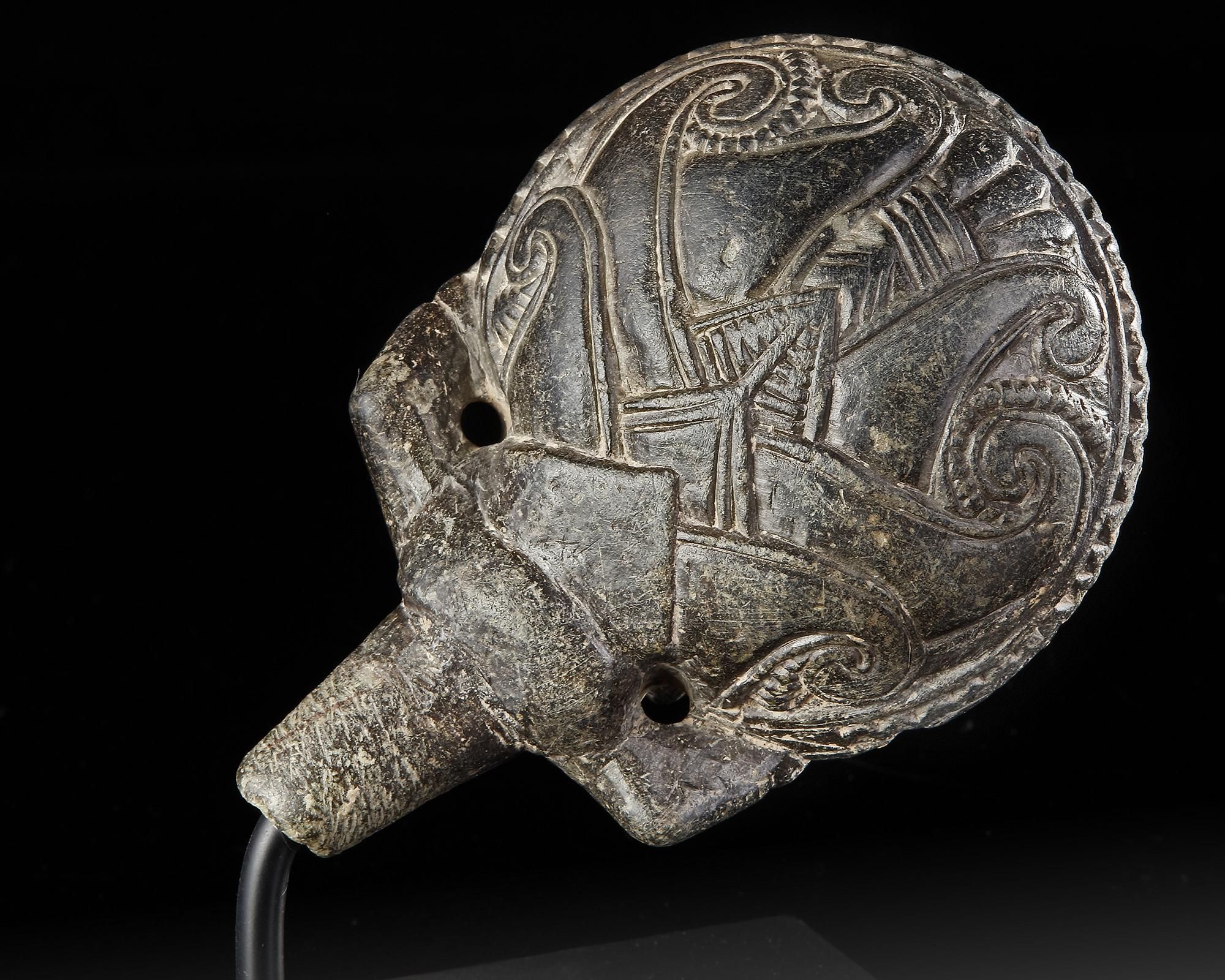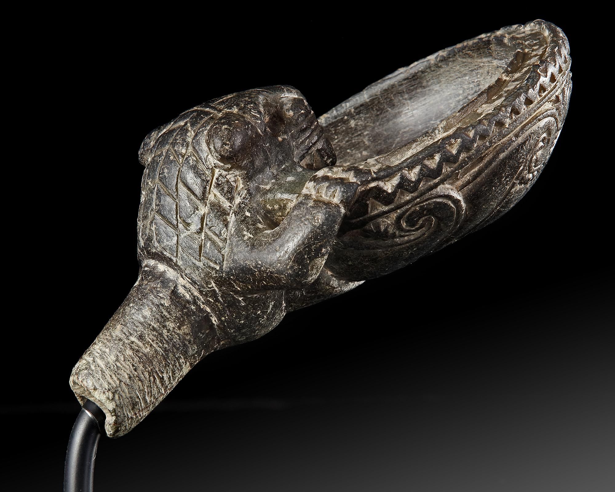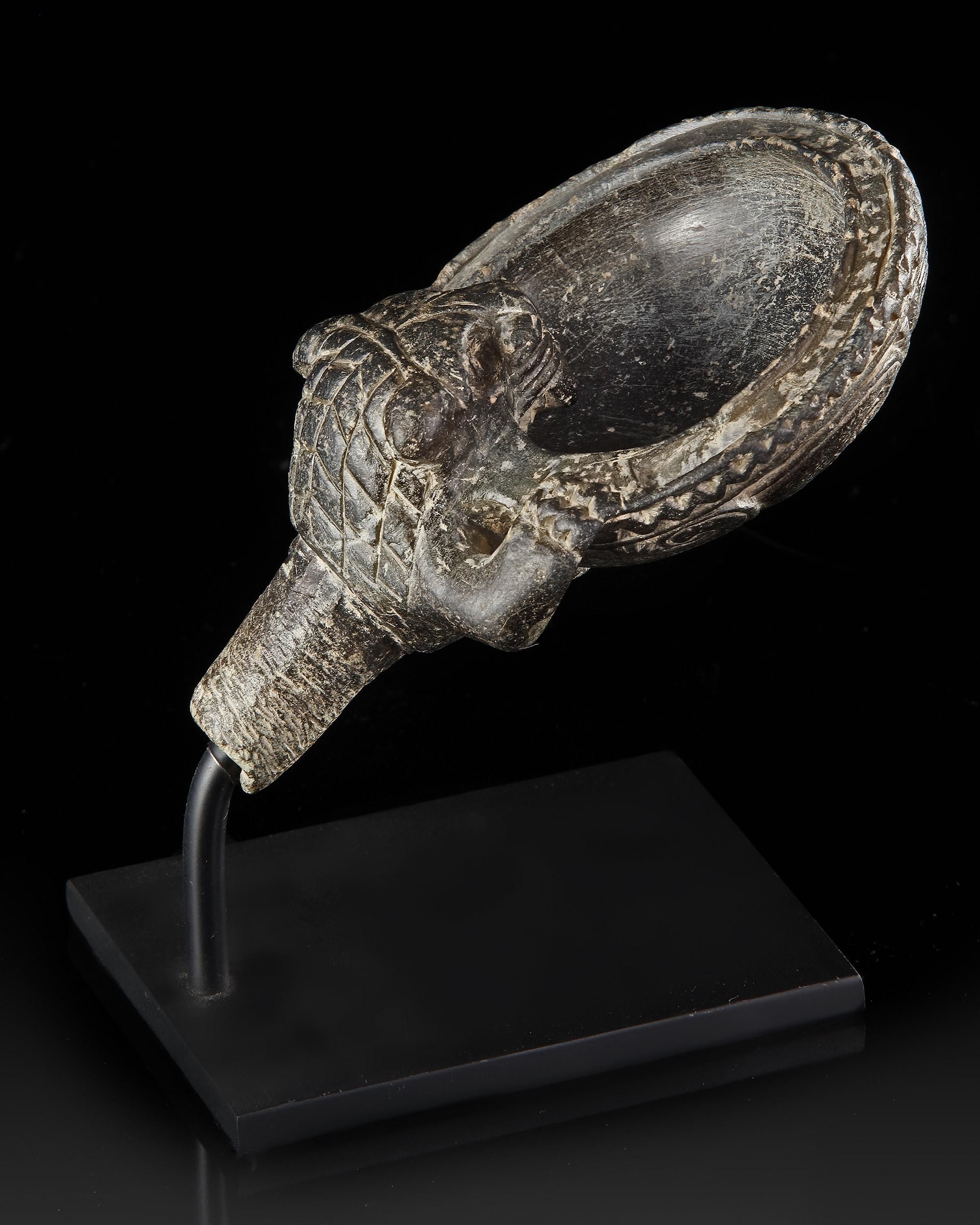 The bowl with a handle in the form of a lion grasping the rim of the shallow bowl, its open mouth serving as a tube, biting through the basin with the teeth emerging, the tongue lolling, its mane a series of layered triangles, its head with pulled back ears and deeply-set almond-shaped eyes once inlaid, with a hollow projection at the end of the body for attachment, the reverse with a stylized palmette tree. Mounted on a custom-made display stand.