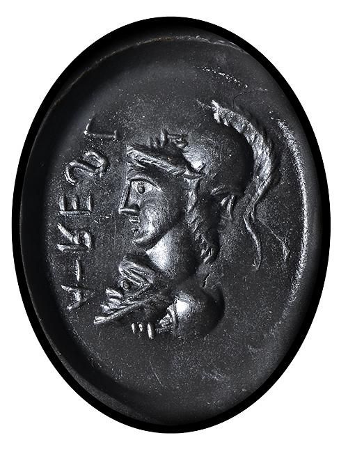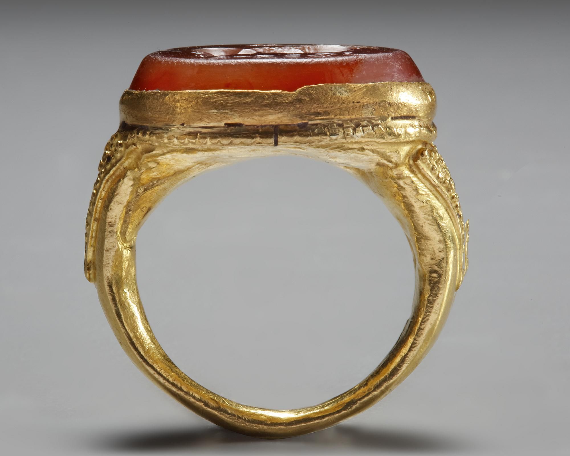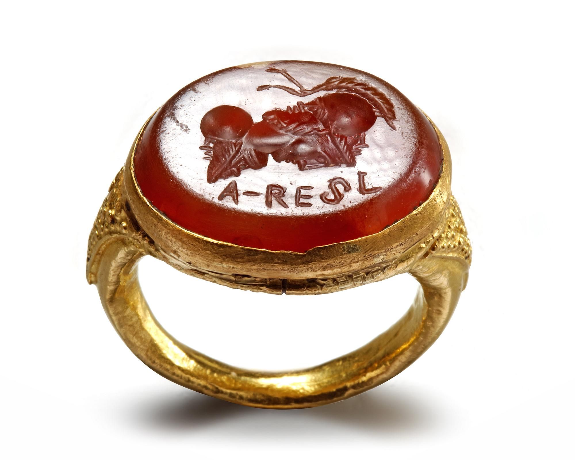 A large carnelian intaglio showing a bust of Minerva in which are incorporated four heads of Silenus. In front of the face of Minerva there is inscribed in Latin letters 'A-RESL' probably representing the owner's name. Mounted in the gold ring which dates from the 12th-13th century A.D. the style of the ring suggest eastern Mediterranean. The ring has two filigreed triangles panels on each shoulder of the shank.