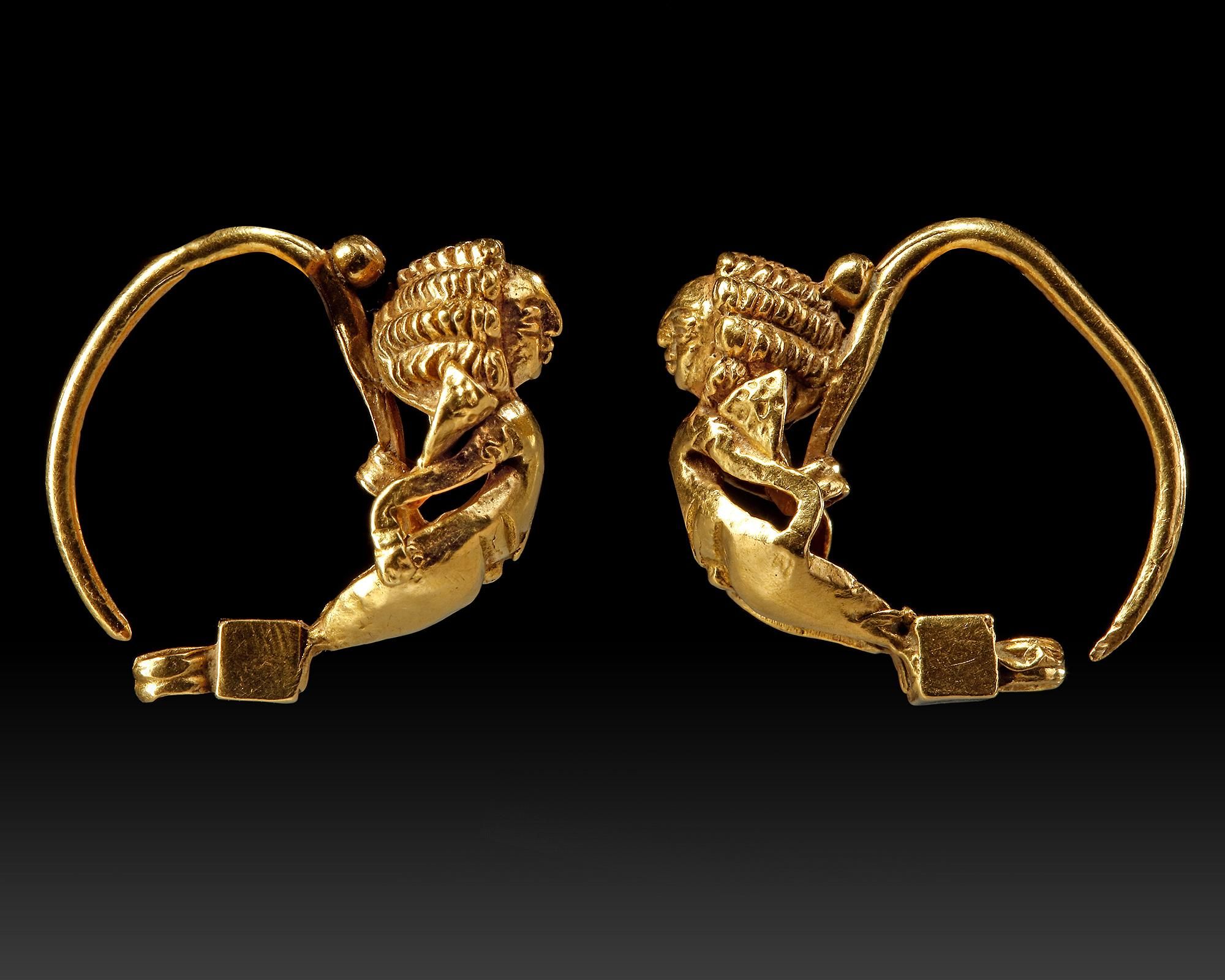 A matched pair of gold earrings, each a thick hoop with pellet, nude figure of Eros with wide hips and bands of curly hair standing on a cube. Their hands rest on the hips and small wings are attached to the shoulders.