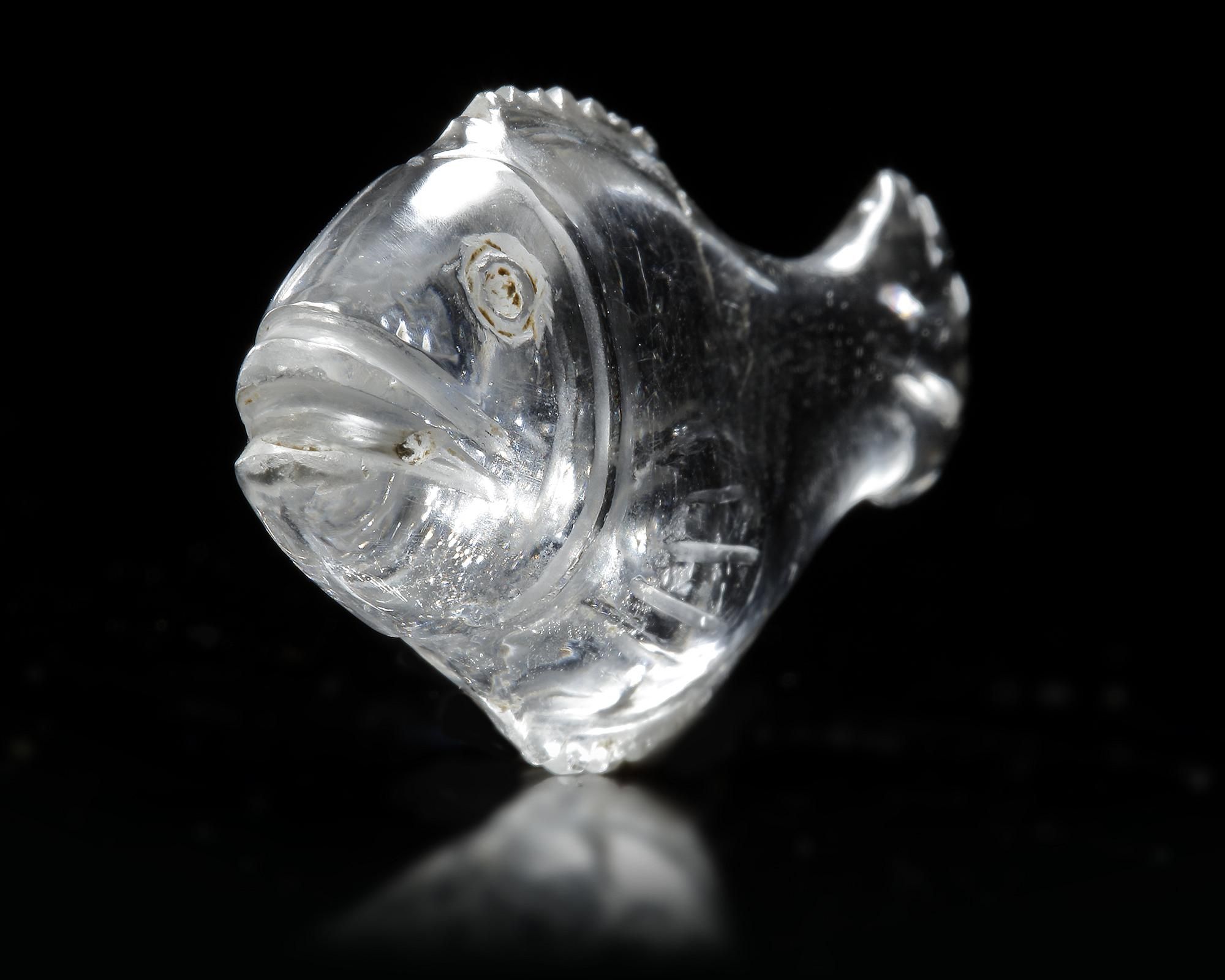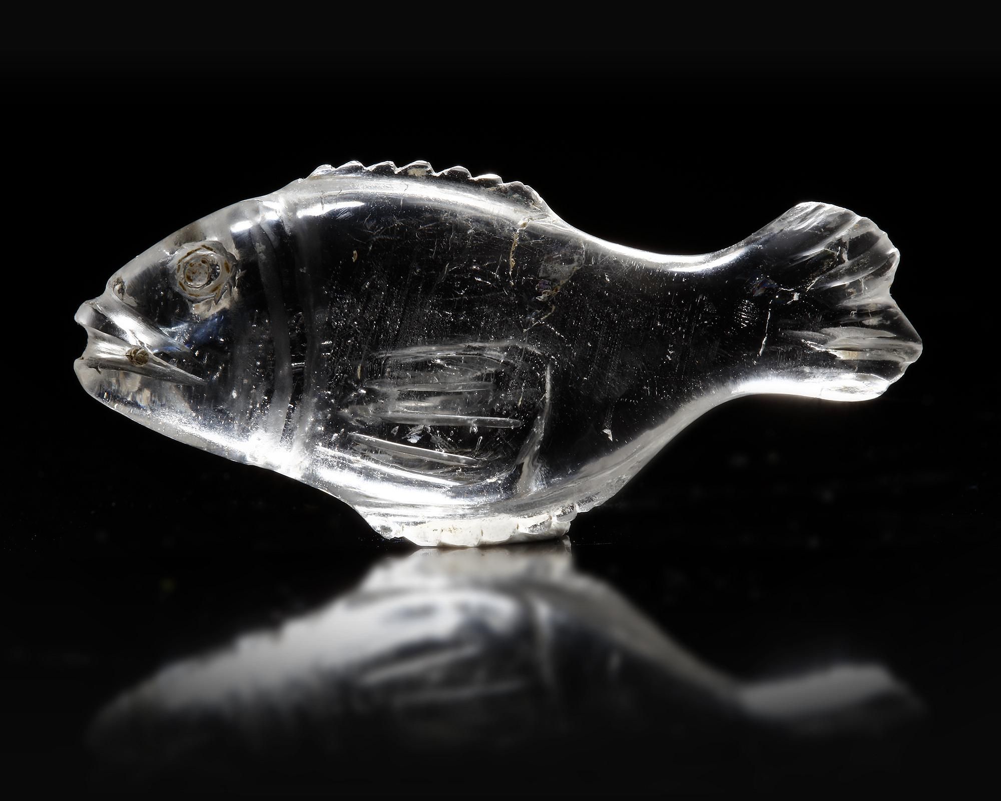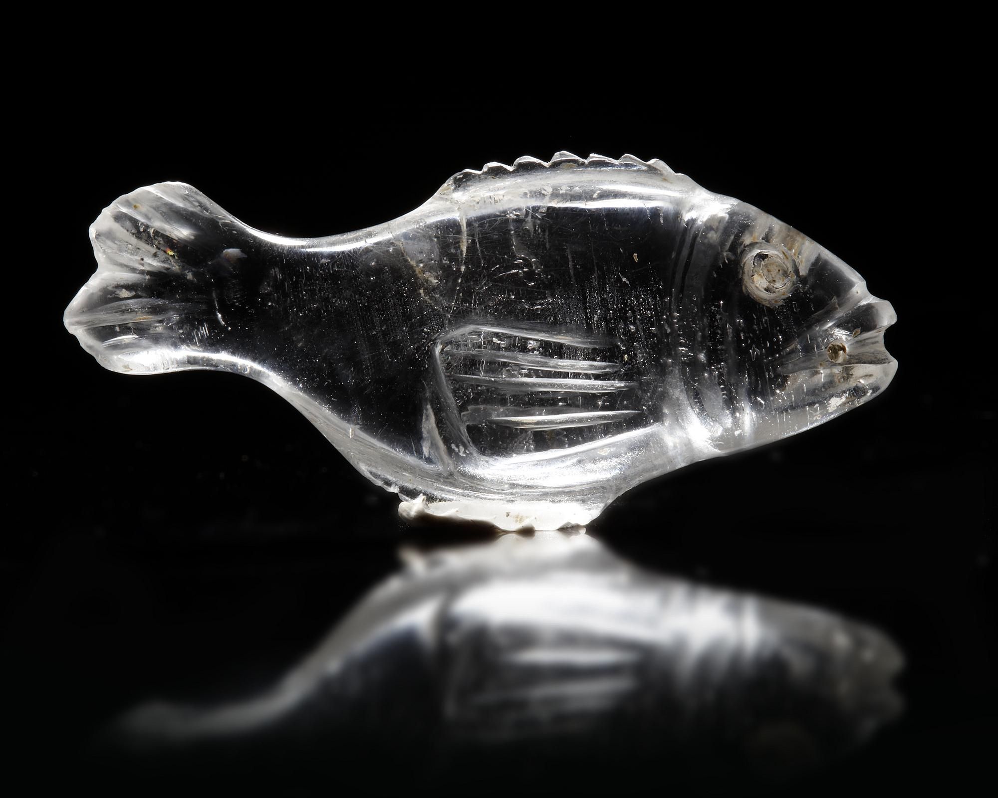 A rock crystal representation of a fish with flat back, elongated body, a short serrated tail, and engraved fin; large drilled eyes and slit mouth with a little through hole. Colourless crystal, with internal inclusions and patina deposits on the surface. A curved groove marking the gills, incised pectoral, dorsal and pelvic fins which are serrated raised ridges. Probably a game-counter or an amulet.