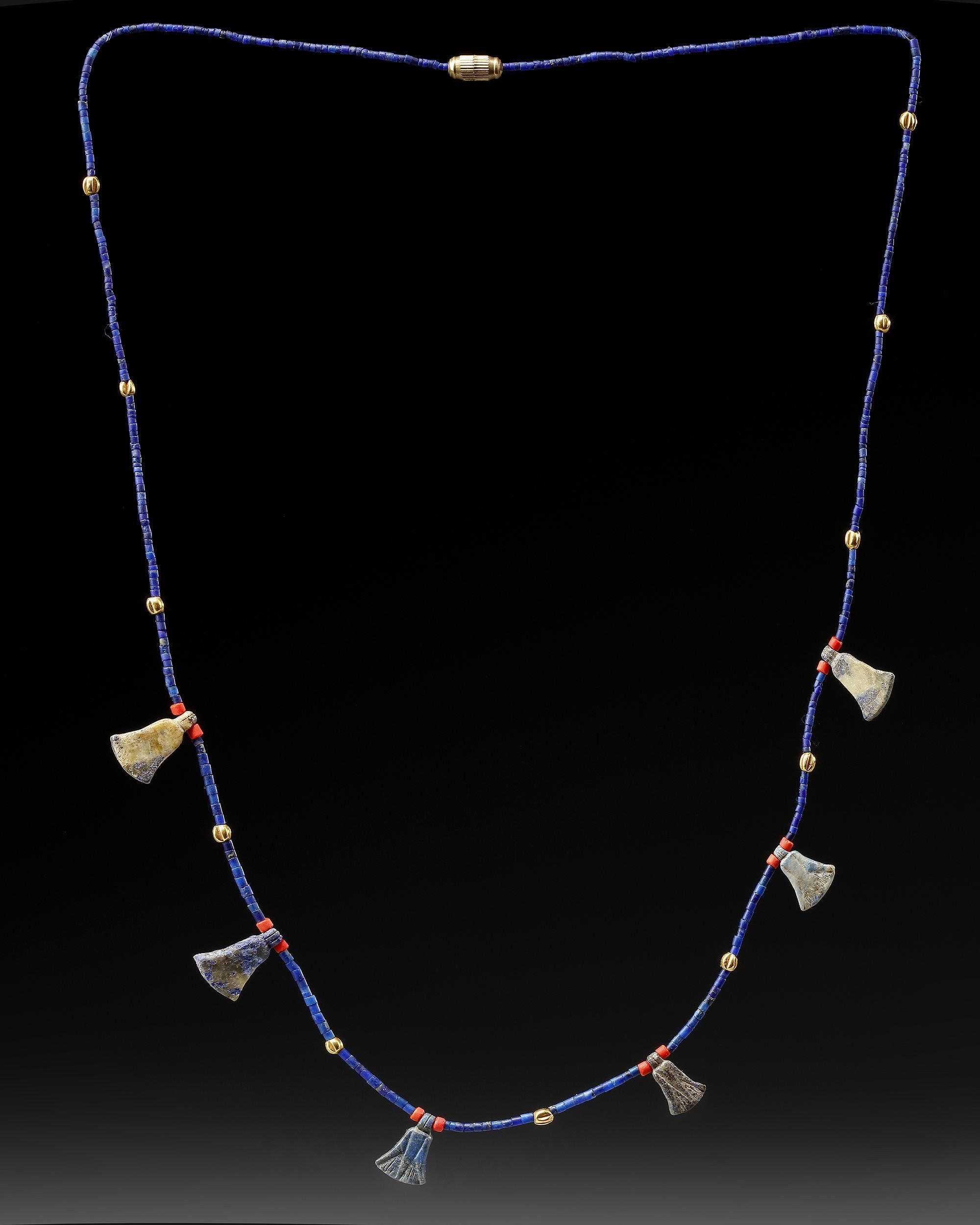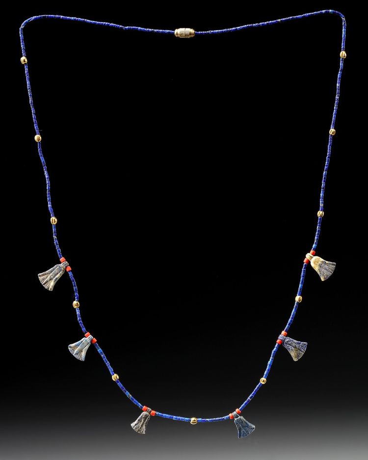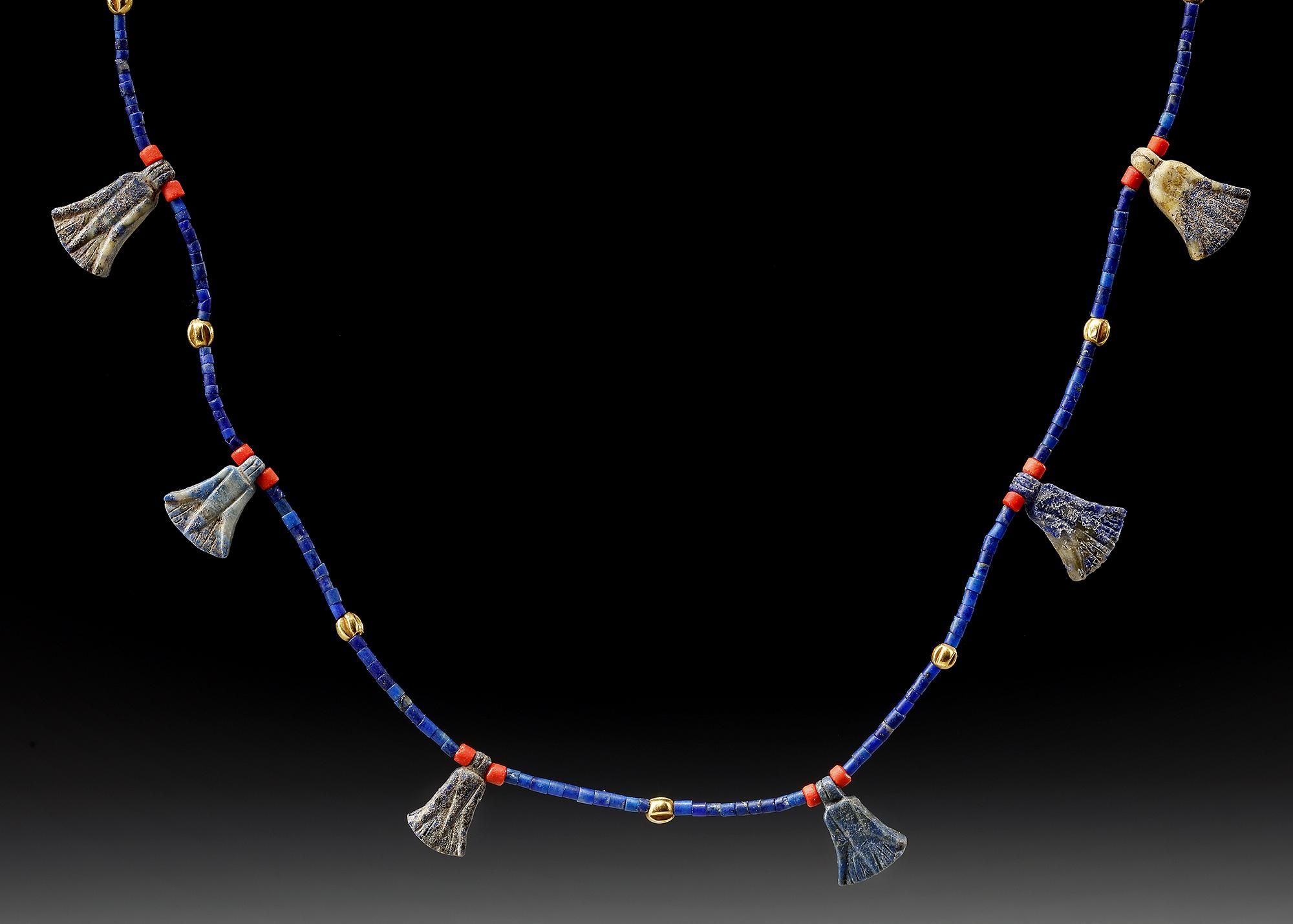 An Egyptian Lotus Flower Lapis Lazuli Amulet Necklace. Late New Kingdom, 1550-1070 BC and later. A restrung necklace composed of oblate lapis lazuli beads interspersed with small fluted gold beads (11 beads). The six bifacial lotus flower pendants and coral beads; antique clasp.
