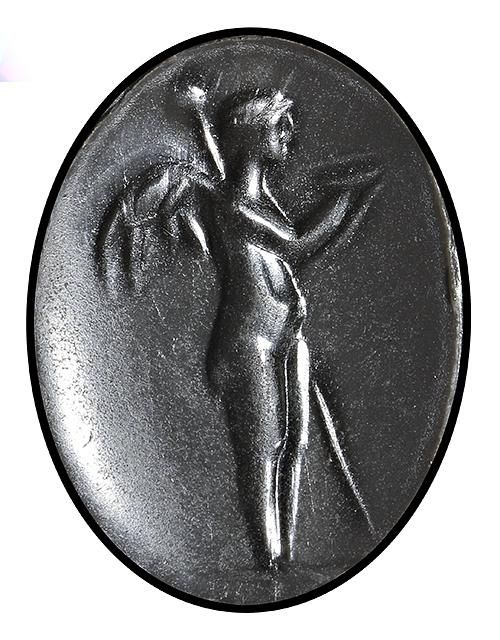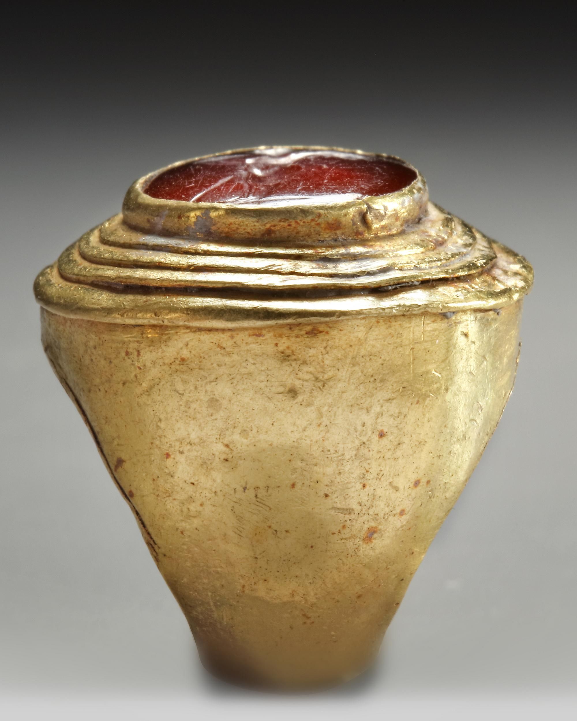 This gold setting is characteristic of the Hellenistic period with its broad hoop, flat on the interior, slightly rounded on the exterior, expanding to the oval bezel. The sloping bezel has a raised band where it meets the flat, overhanging flange. The pointed convex oval carnelian set within the bezel is engraved with the goddess Cupid standing to the left. He has wings with his both hands he holds a libation bowl or cup. He has a thyrsus at his side.