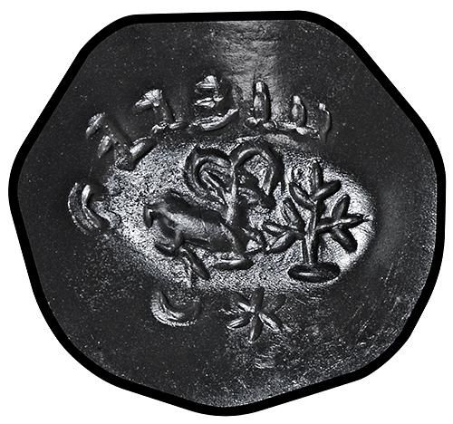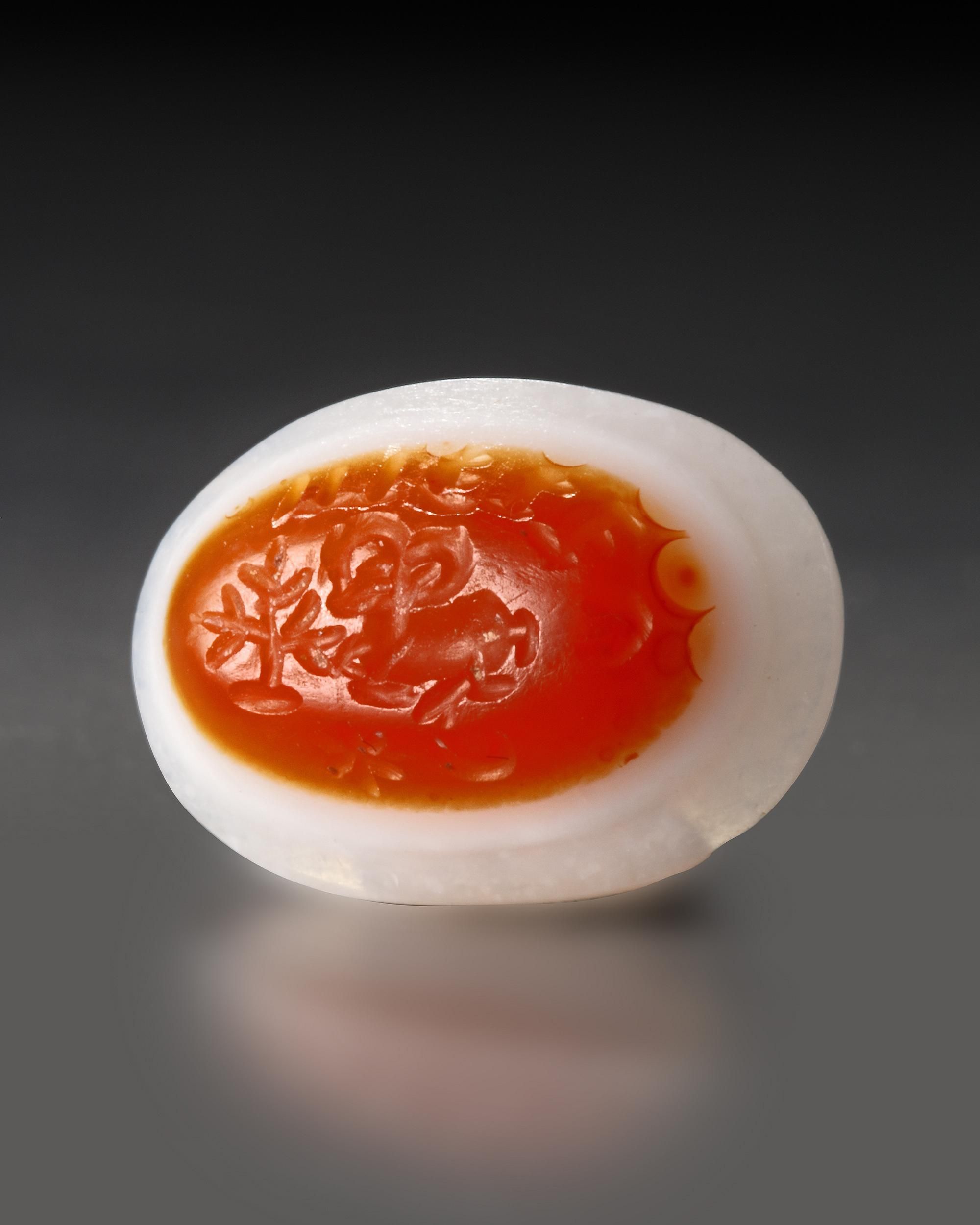 A Sassanian two layered agate stamp seal with domed flat top. Intaglio with stag and stylised tree with a Pahlavi inscription. Size: 19 by 12 mm.