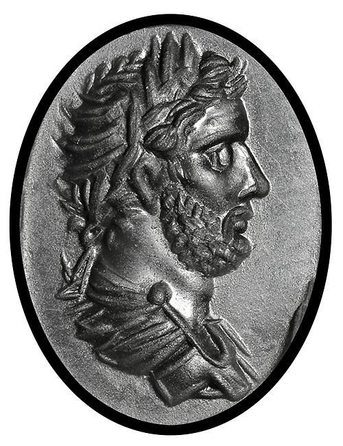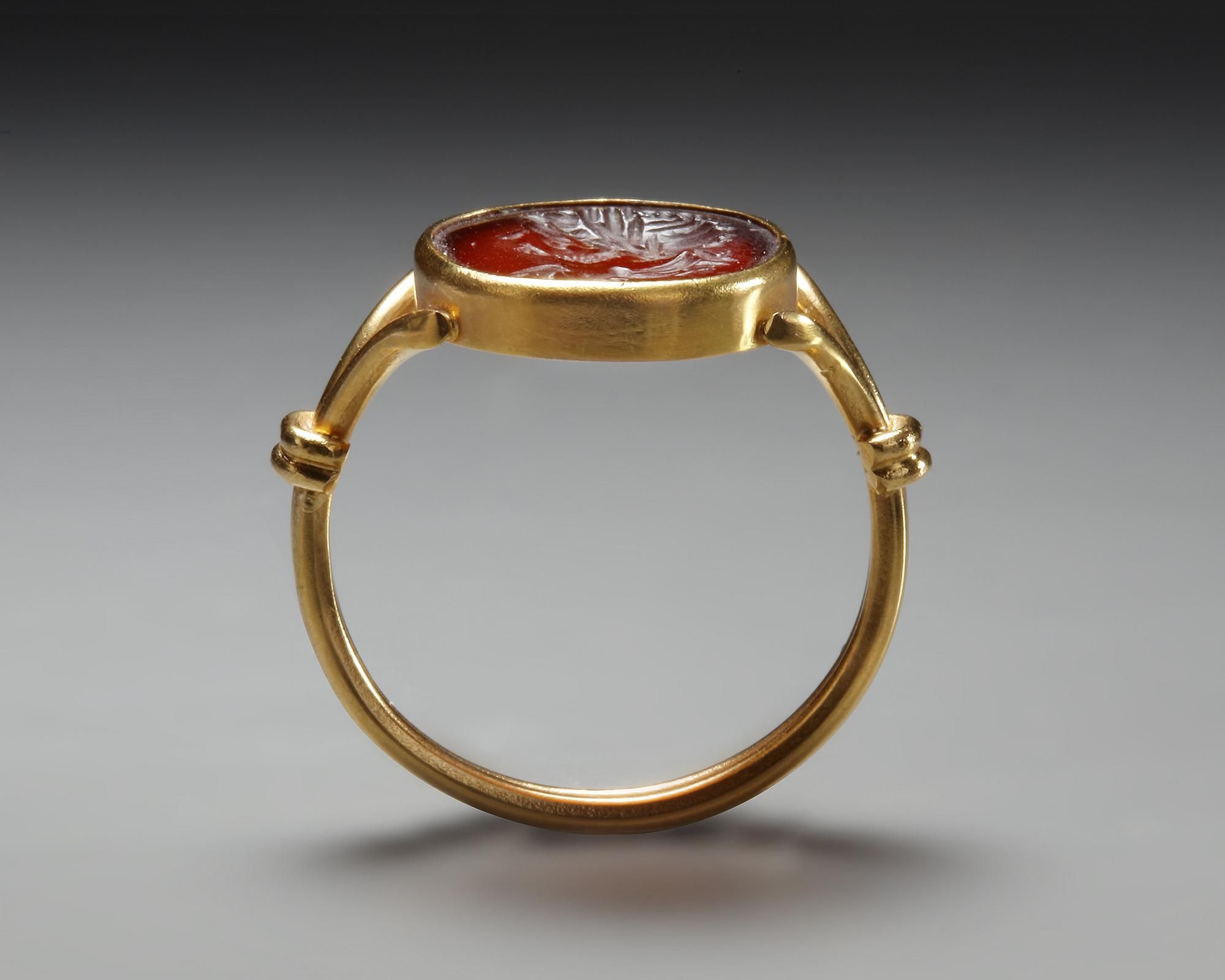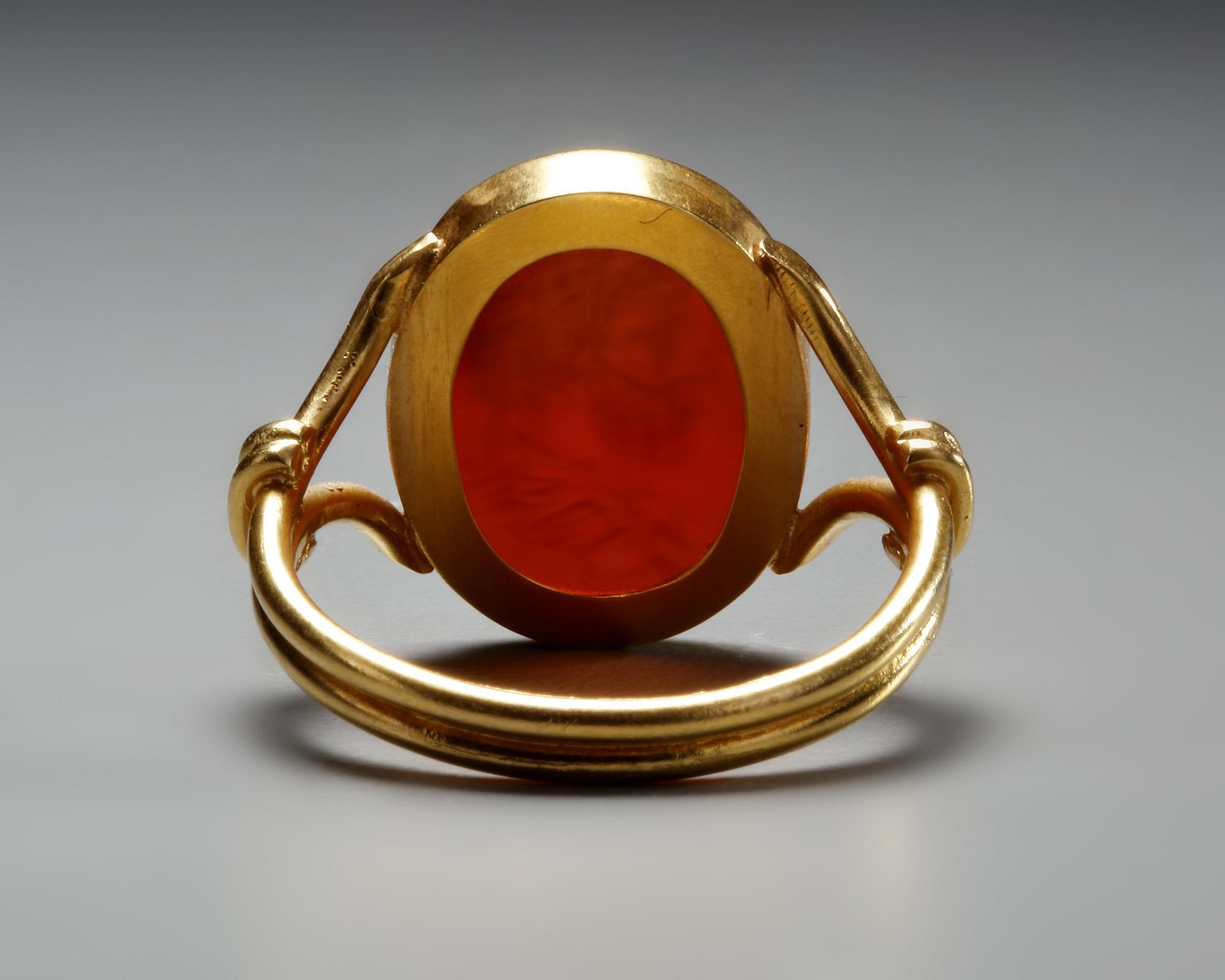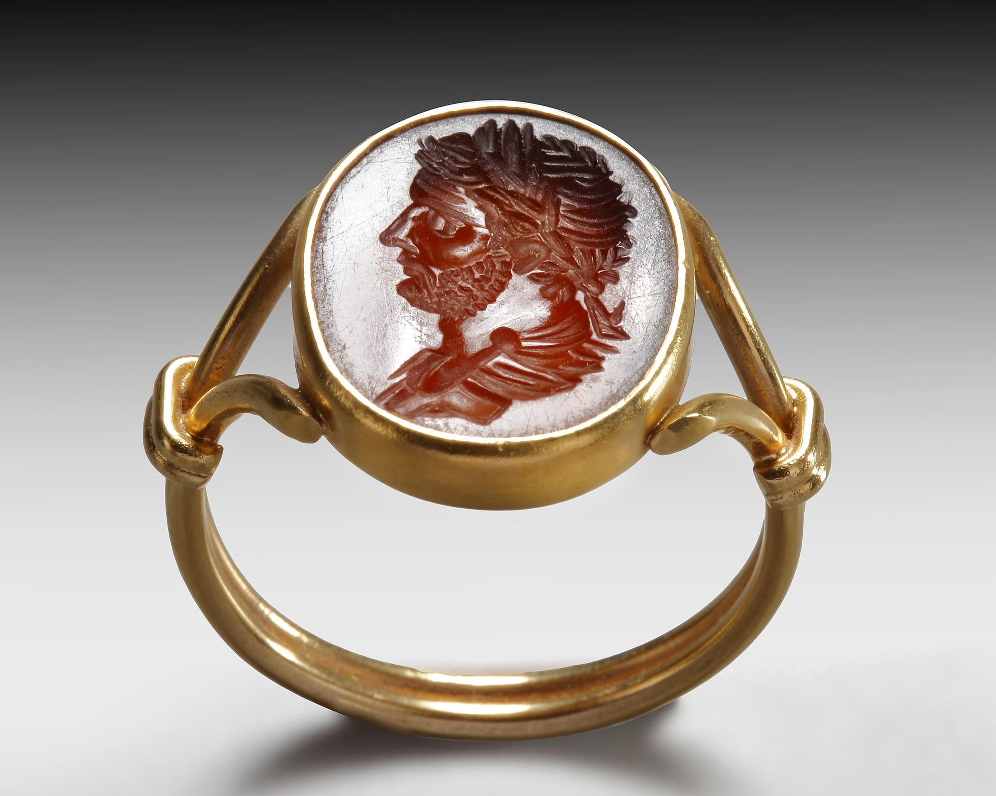 A Renaissance intaglio in carnelian, engraved with a portrait of the emperor Hadrian shown to the left. The ring is with open design ring shoulders and double band shank.