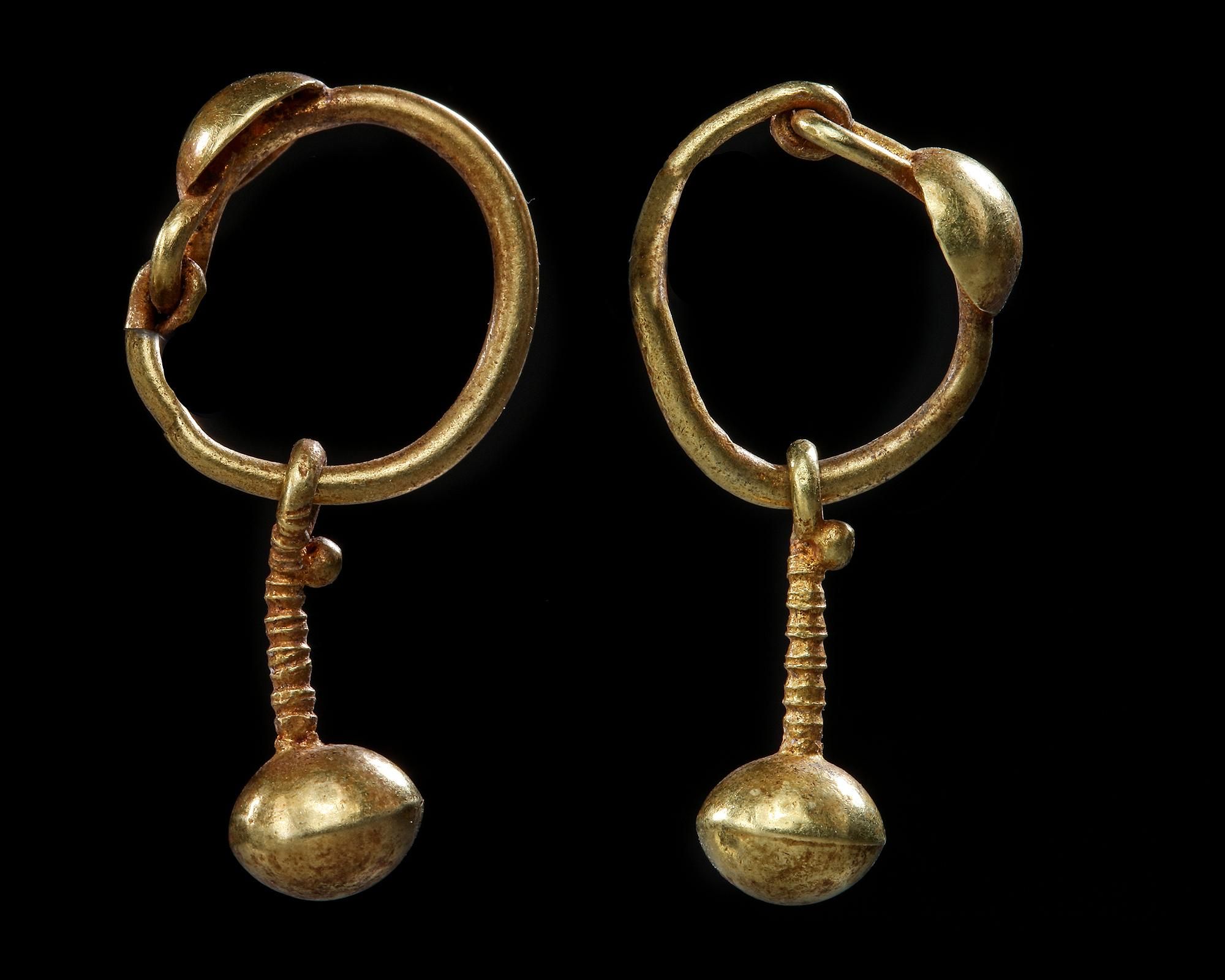 A pair of Roman gold earrings made of a hooped wire decorated with a semi-spherical gold element and a pendant with a spherical terminal.