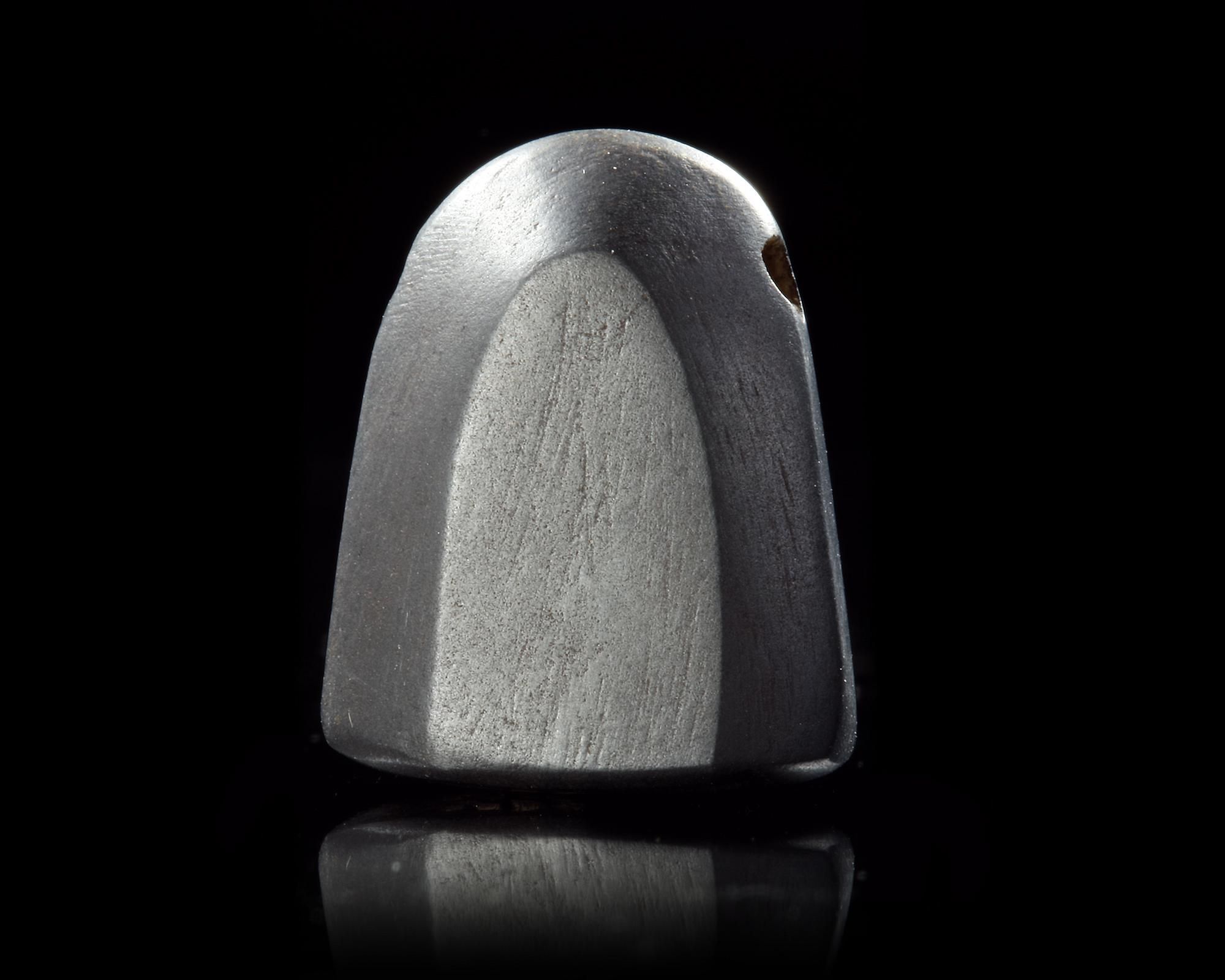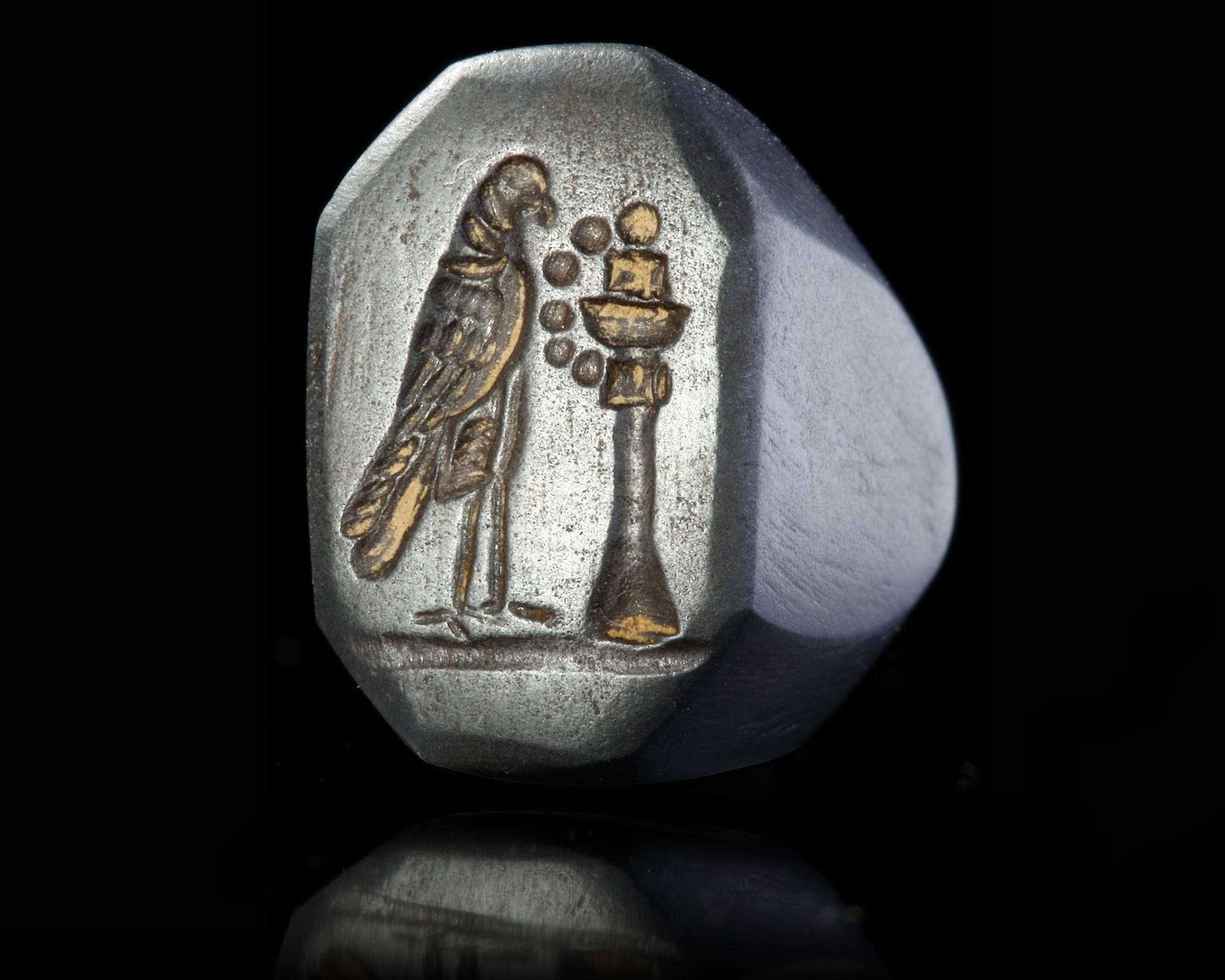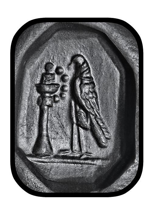 Incised design depicting a falcon facing a pedestal altar with square on top, and a band of six circles in the shape of a crescent. Possibly with some Egyptian influence.