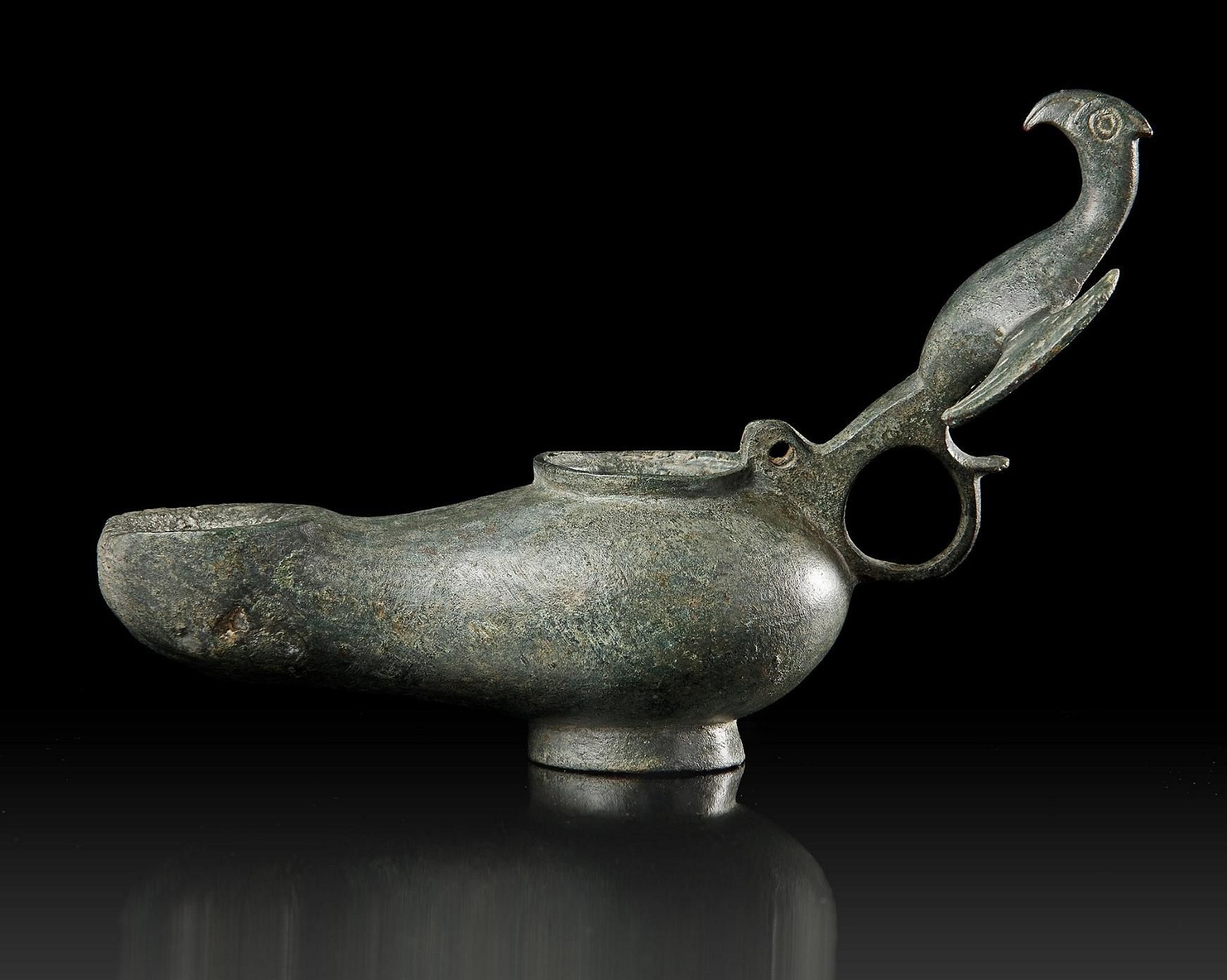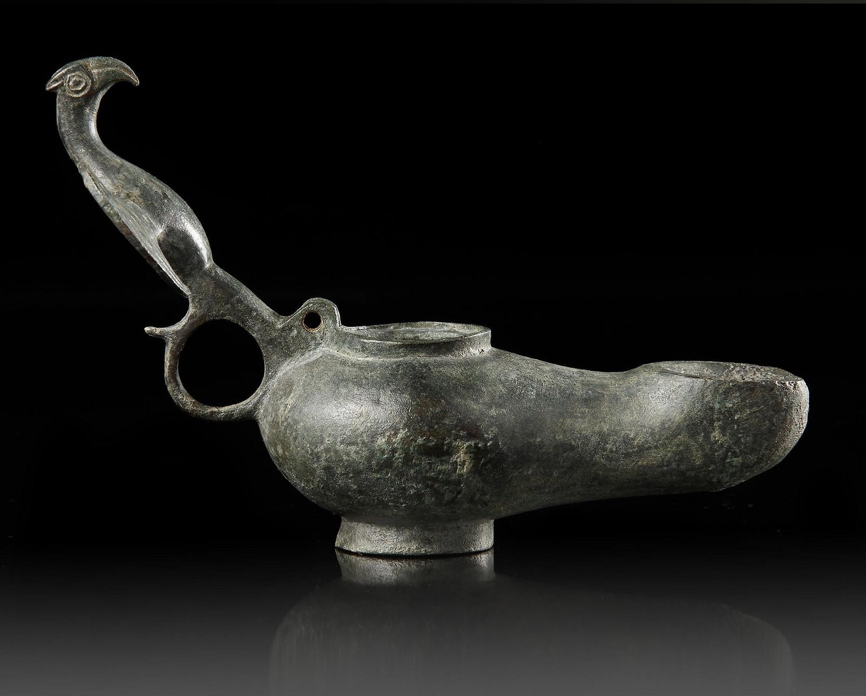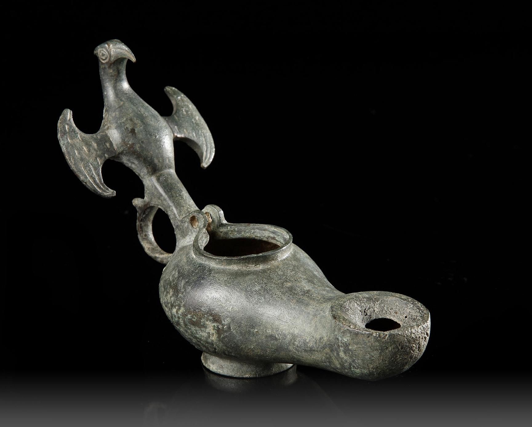 A Byzantine bronze oil lamp from a single casting, lid missing. The handle is adorned with facing eagle with its wings spread.