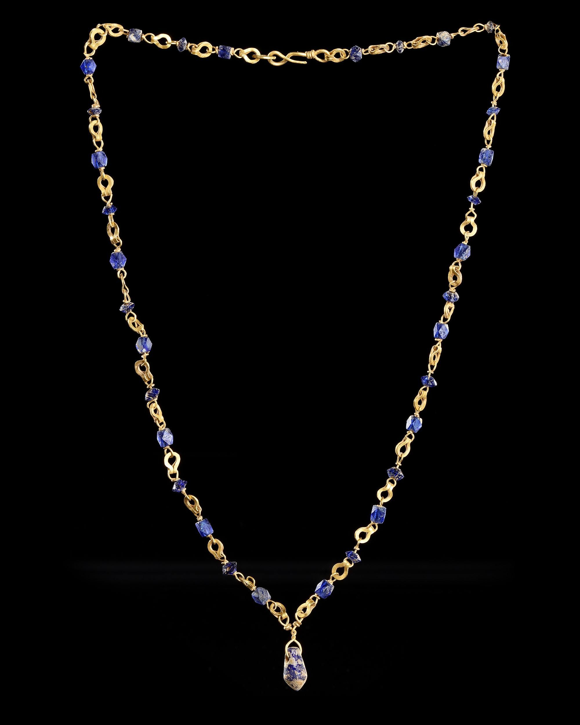The chain is made from two type of elements, one is gold wire with blue glass polyhedral beads and linked by sheet gold elements which have been folded. The clasp is made with hook and loop.