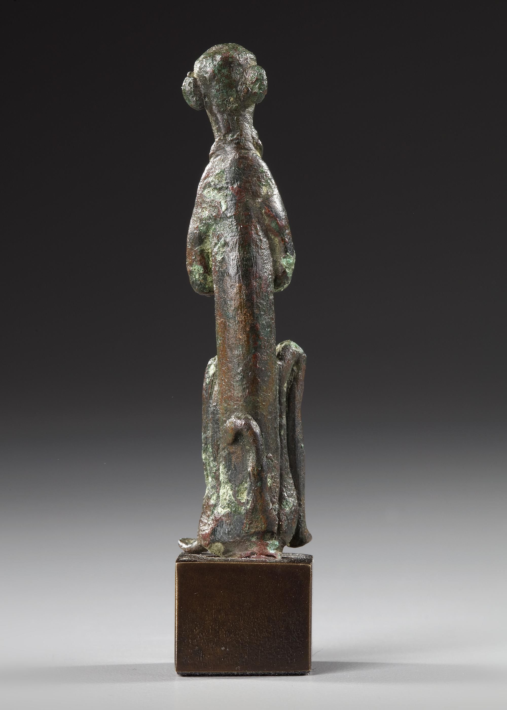 A cast bronze figure, probably representing Bactrian(?), modelled as a seated figure with legs, arms held out from the body and bent upwards at the elbow, small monkey with its tail on its back.