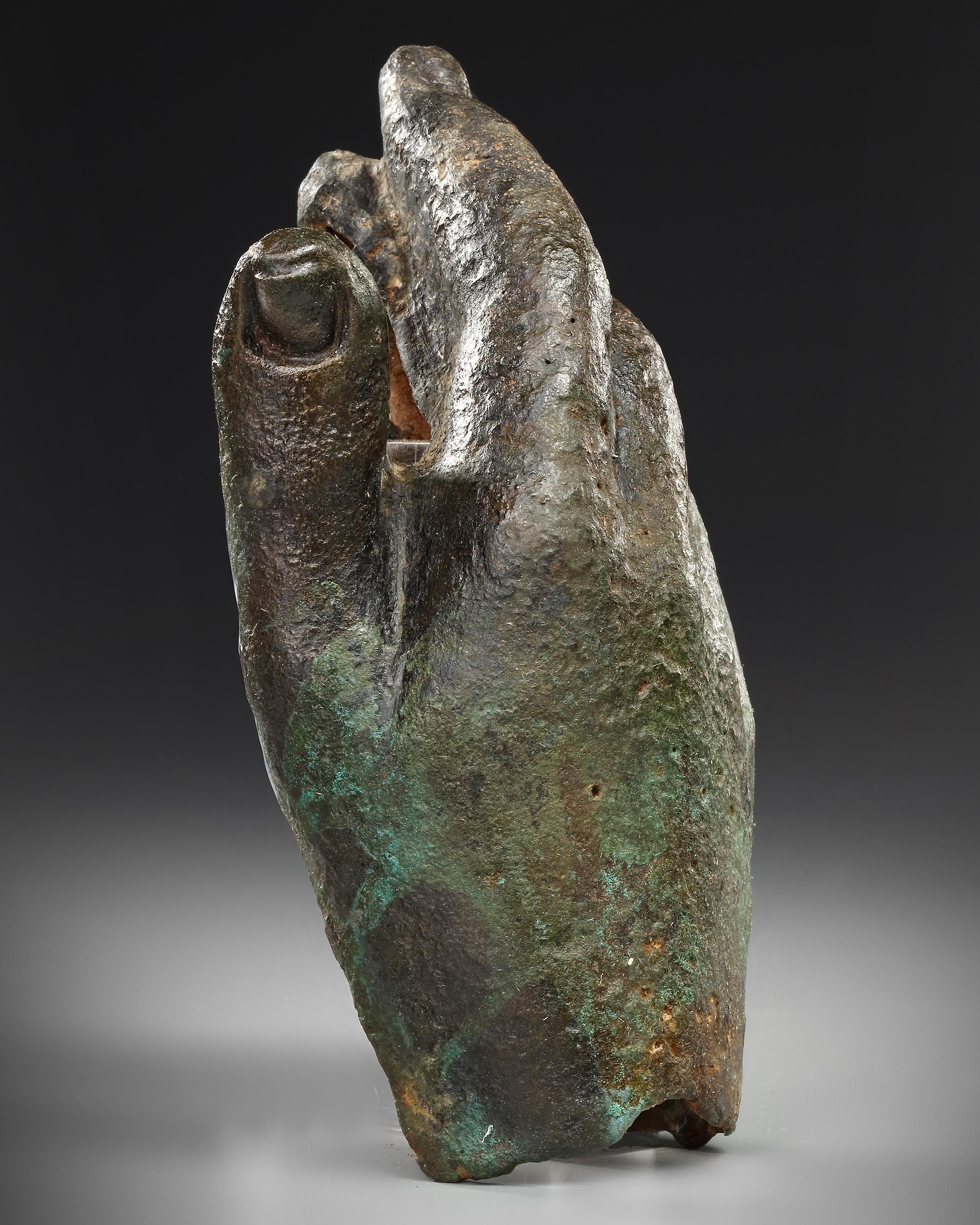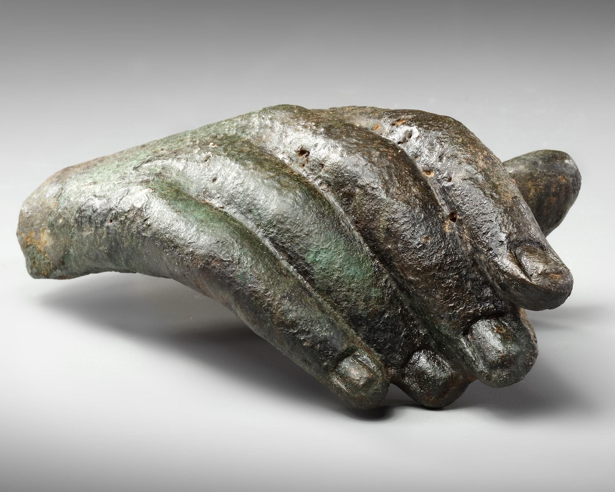 A life-size right hand cast and chased, broken off at the wrist. The back is open suggesting that the hand was up against the body of a togate statue and touching a fold of the garment.
