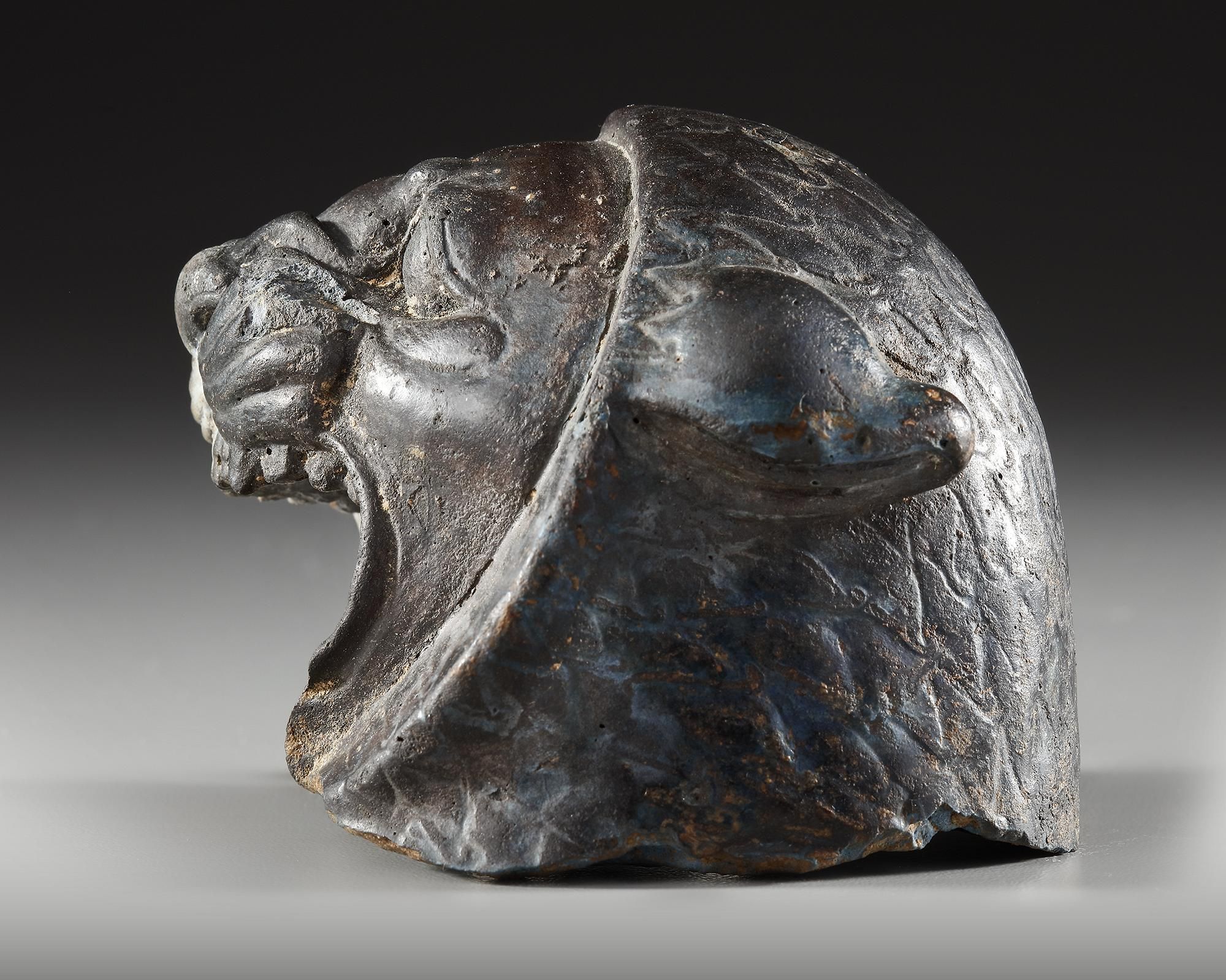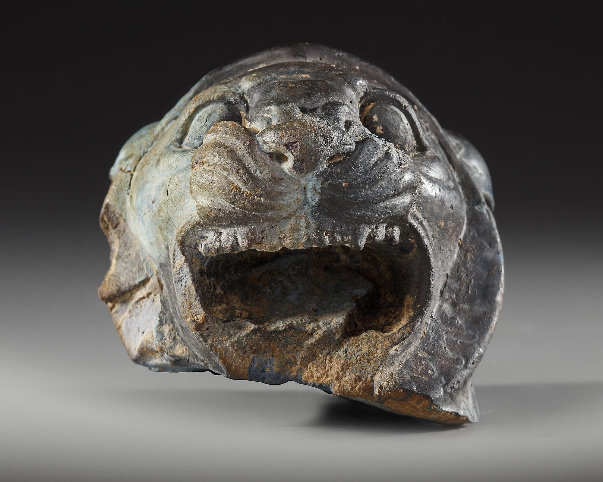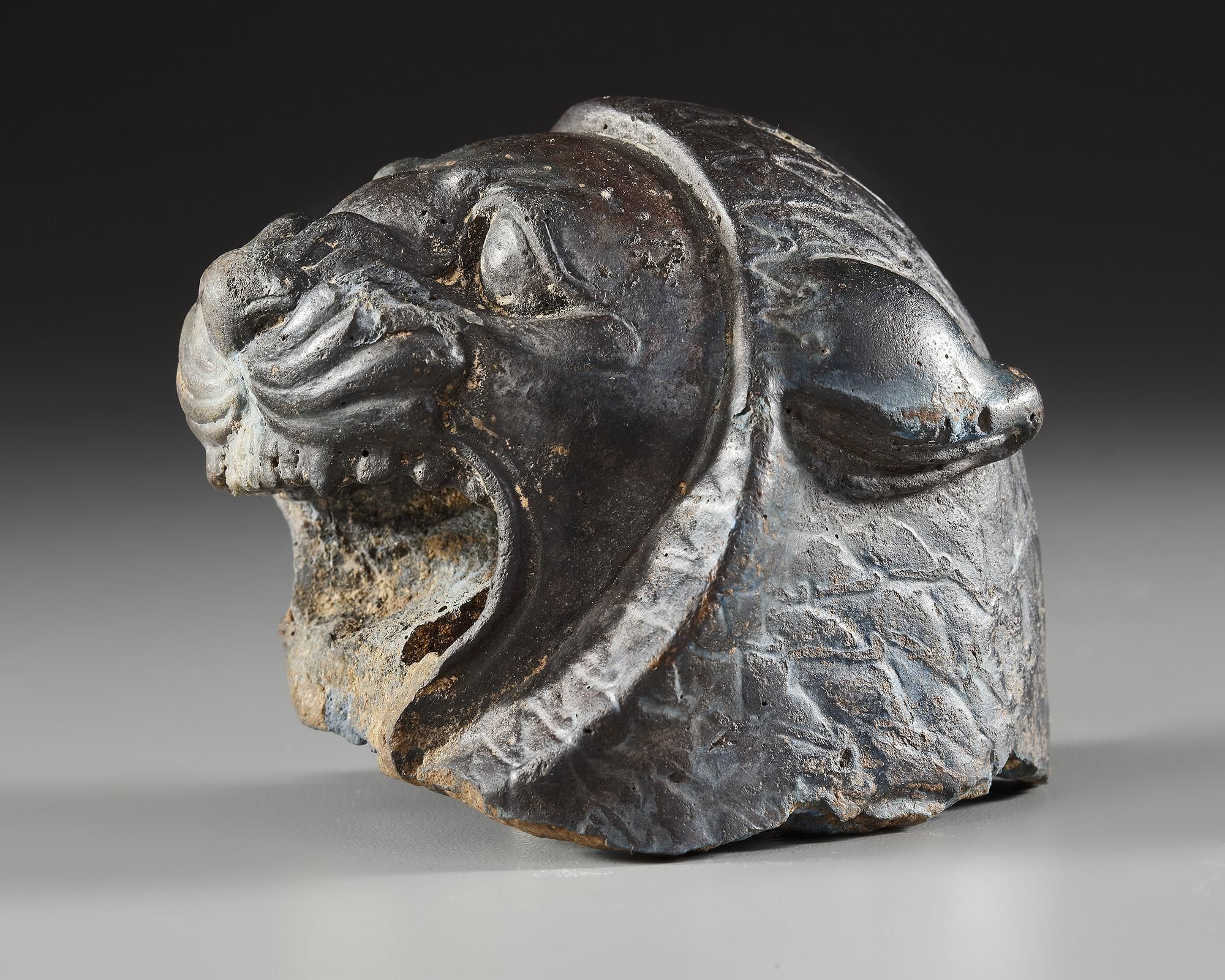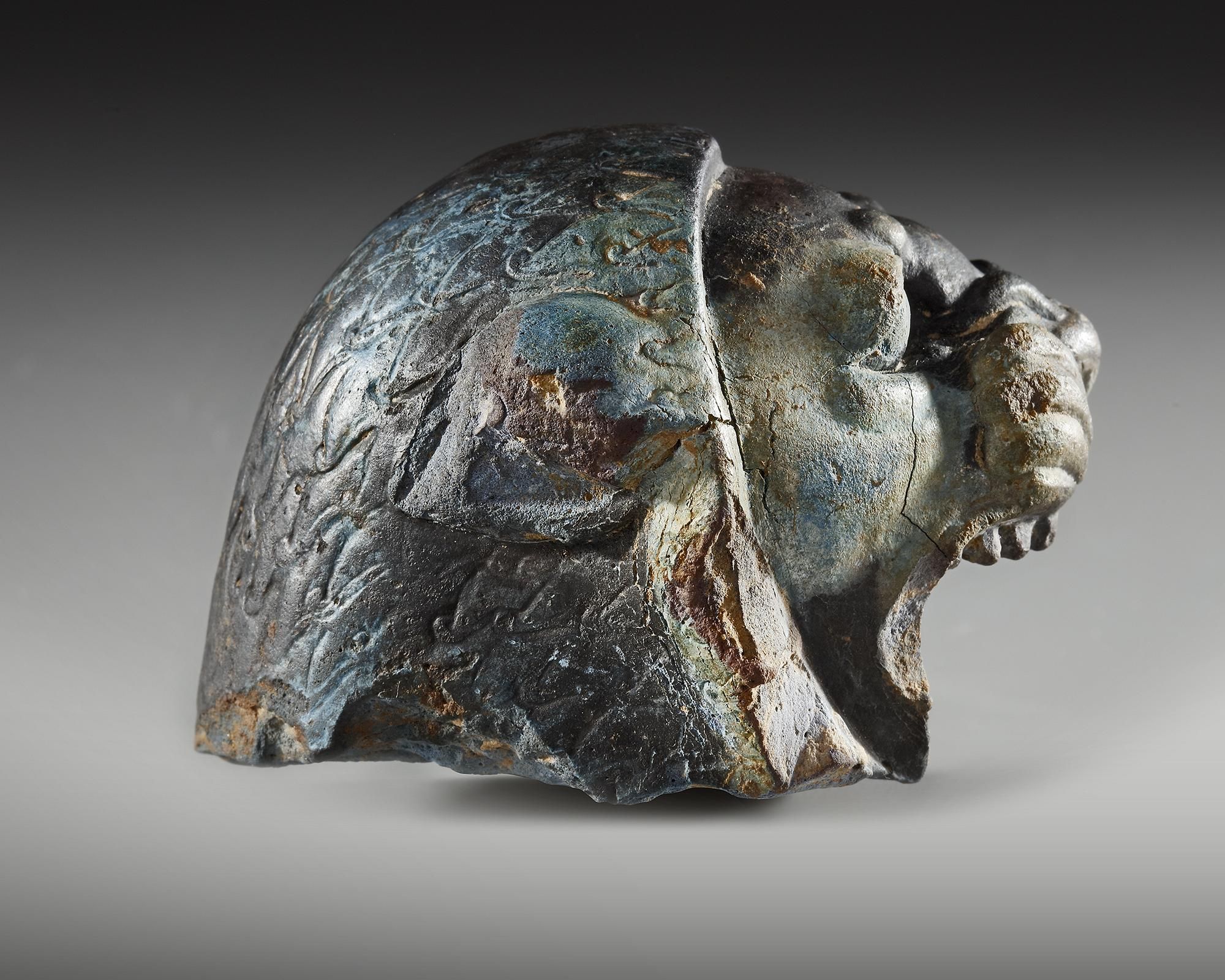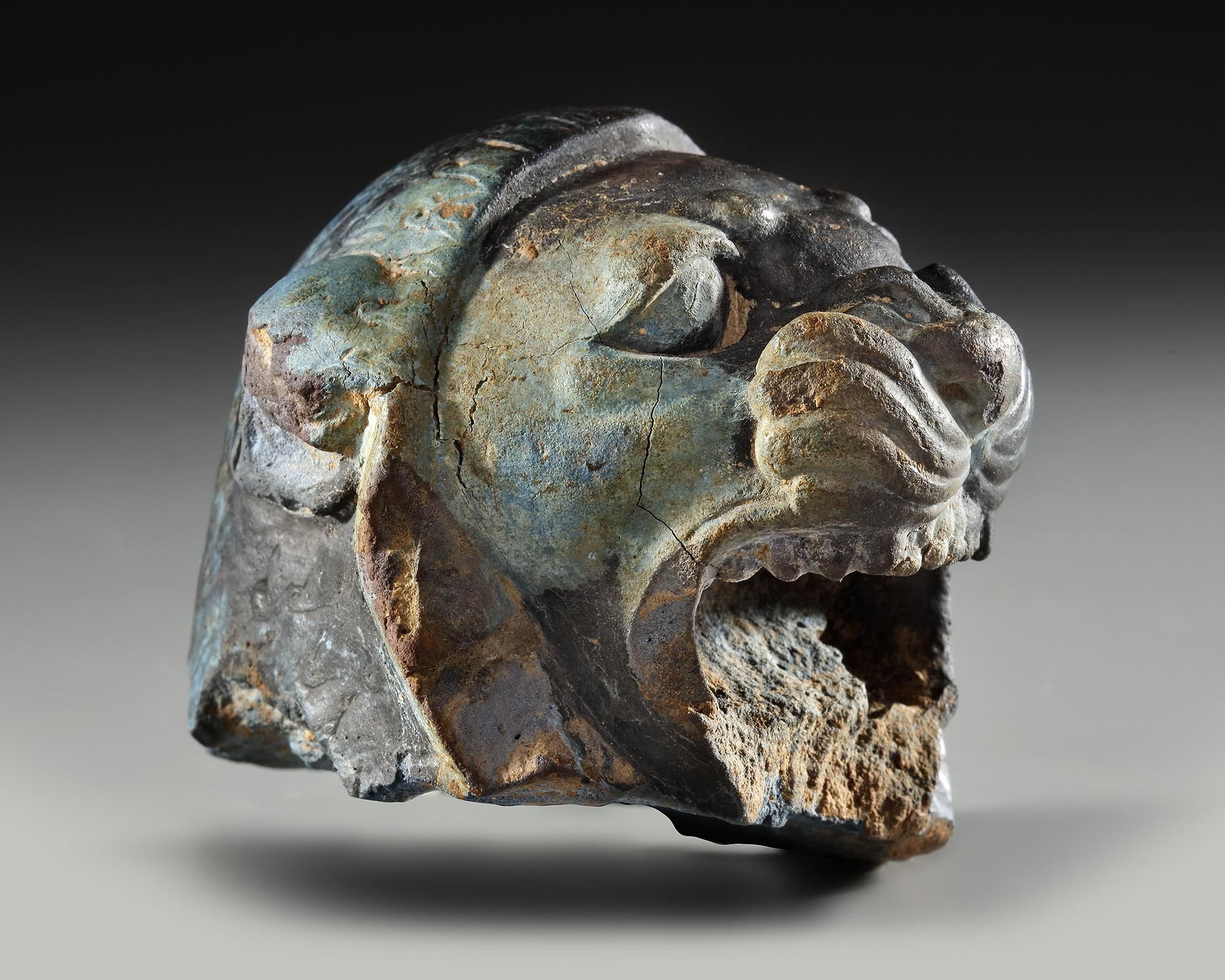 In form of a roaring lion made from "Egyptian blue" with semicircular eyes and stippled brows, the mouth open with the teeth bared, the whiskers incised and the fur on the nose indicated, an incised whorl at each brow, the ears folded back behind the radiating mane that forms a widow's peak on the forehead.