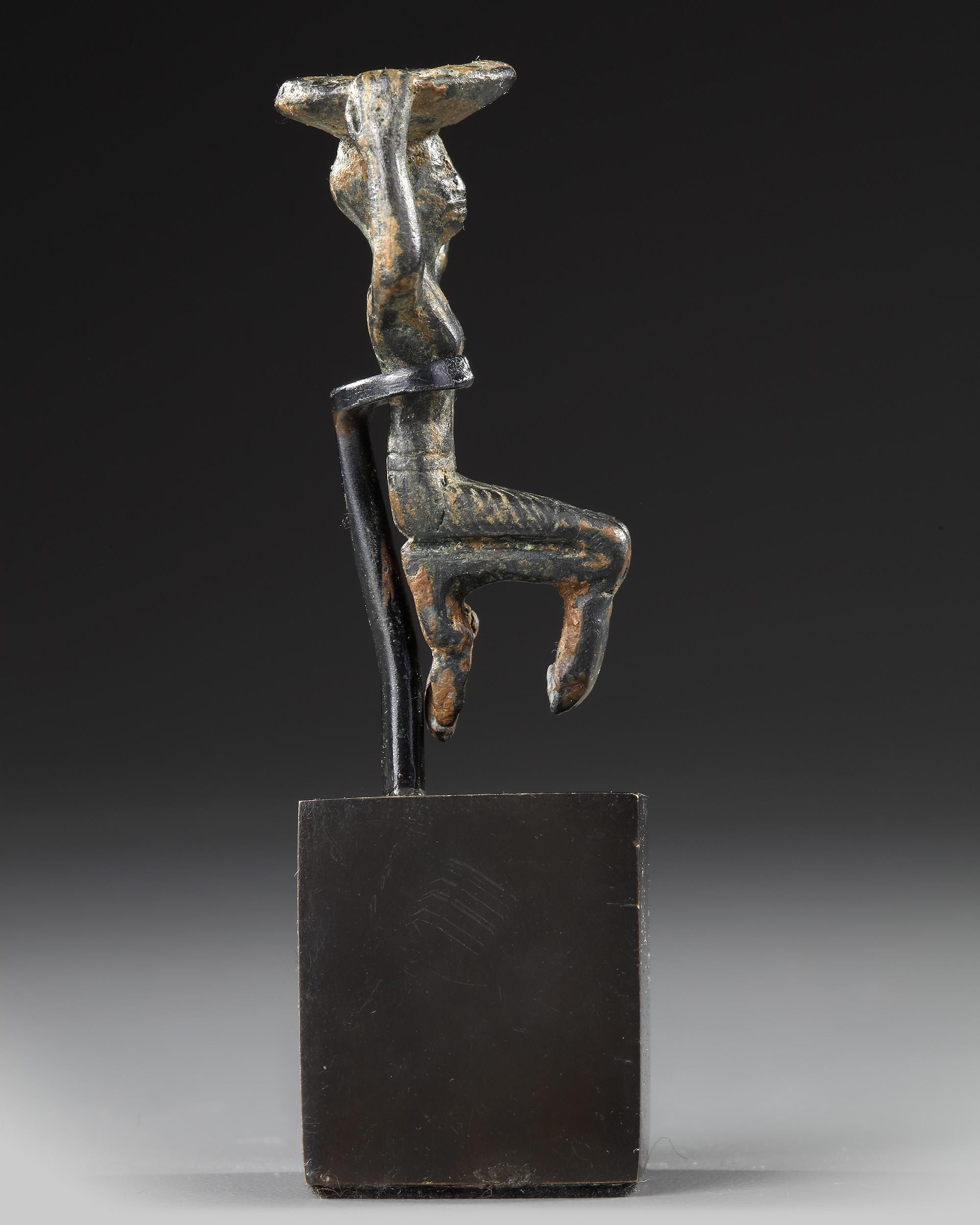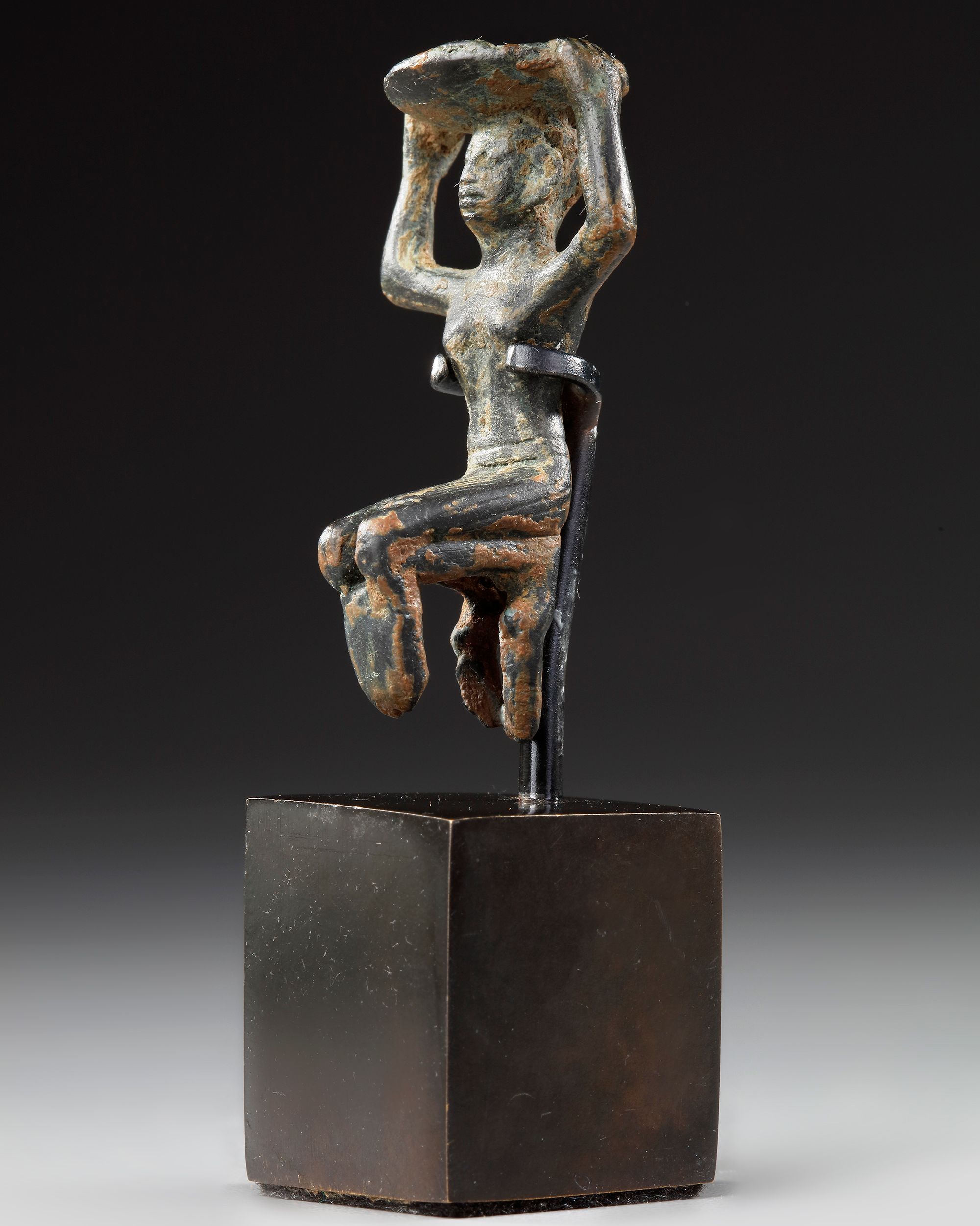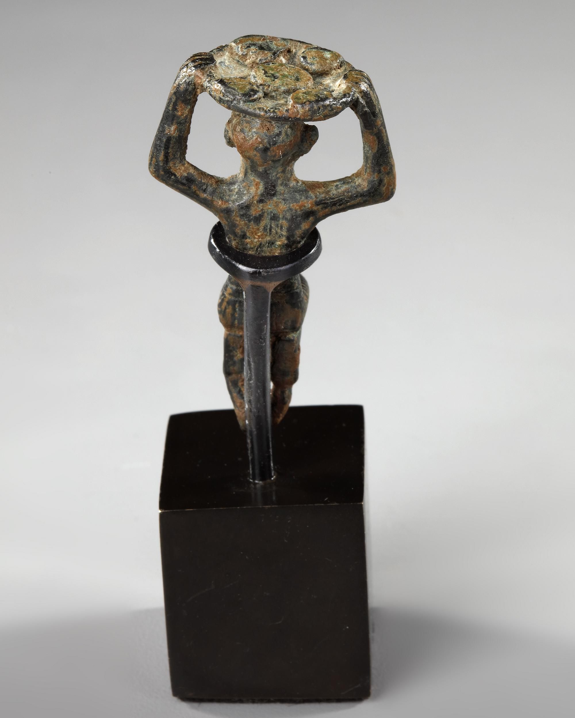 A bronze figure of a kneeling female wearing a knee-length skirt, supporting a dish with food offerings(?) above her head. Mounted on a custom-made stand.