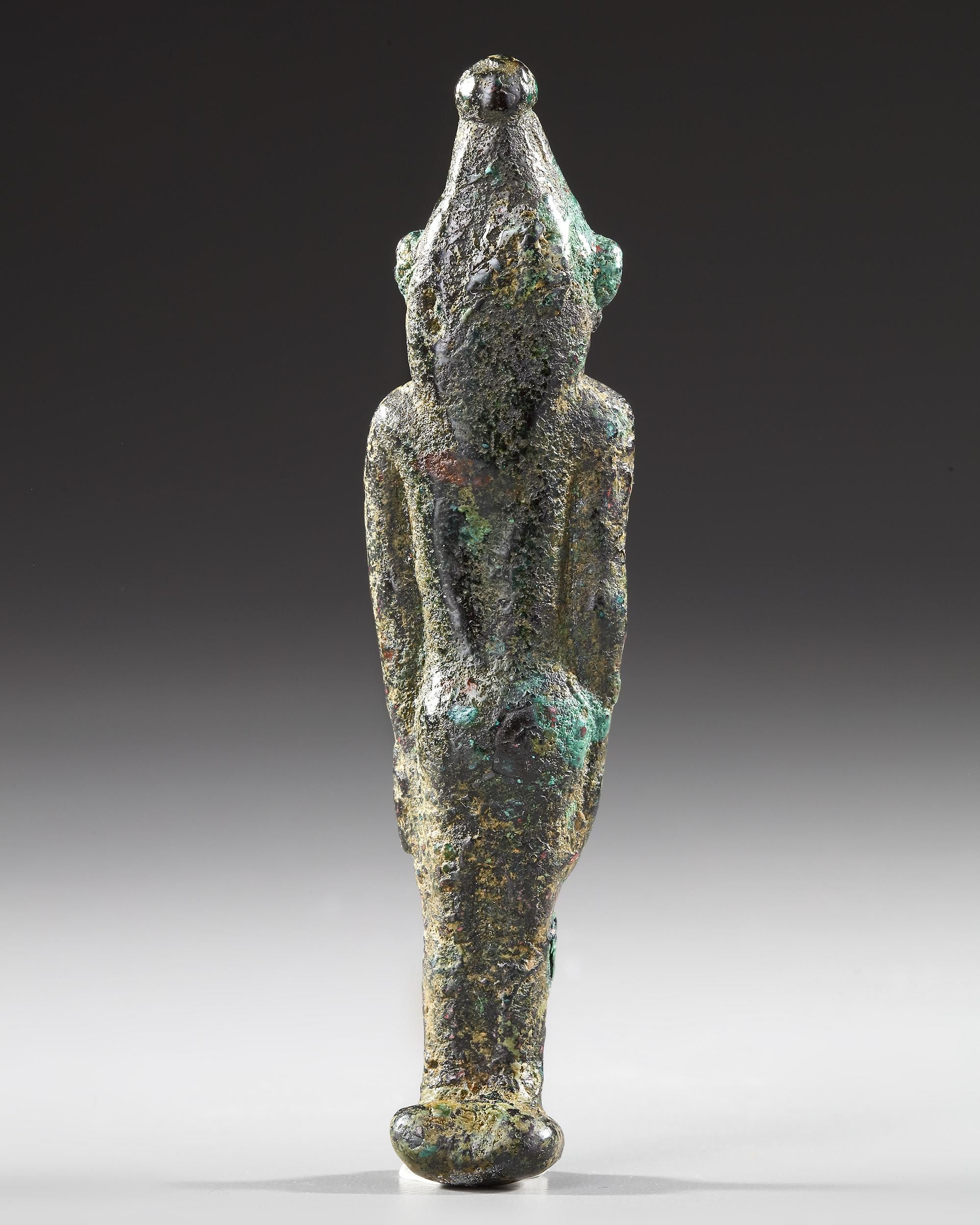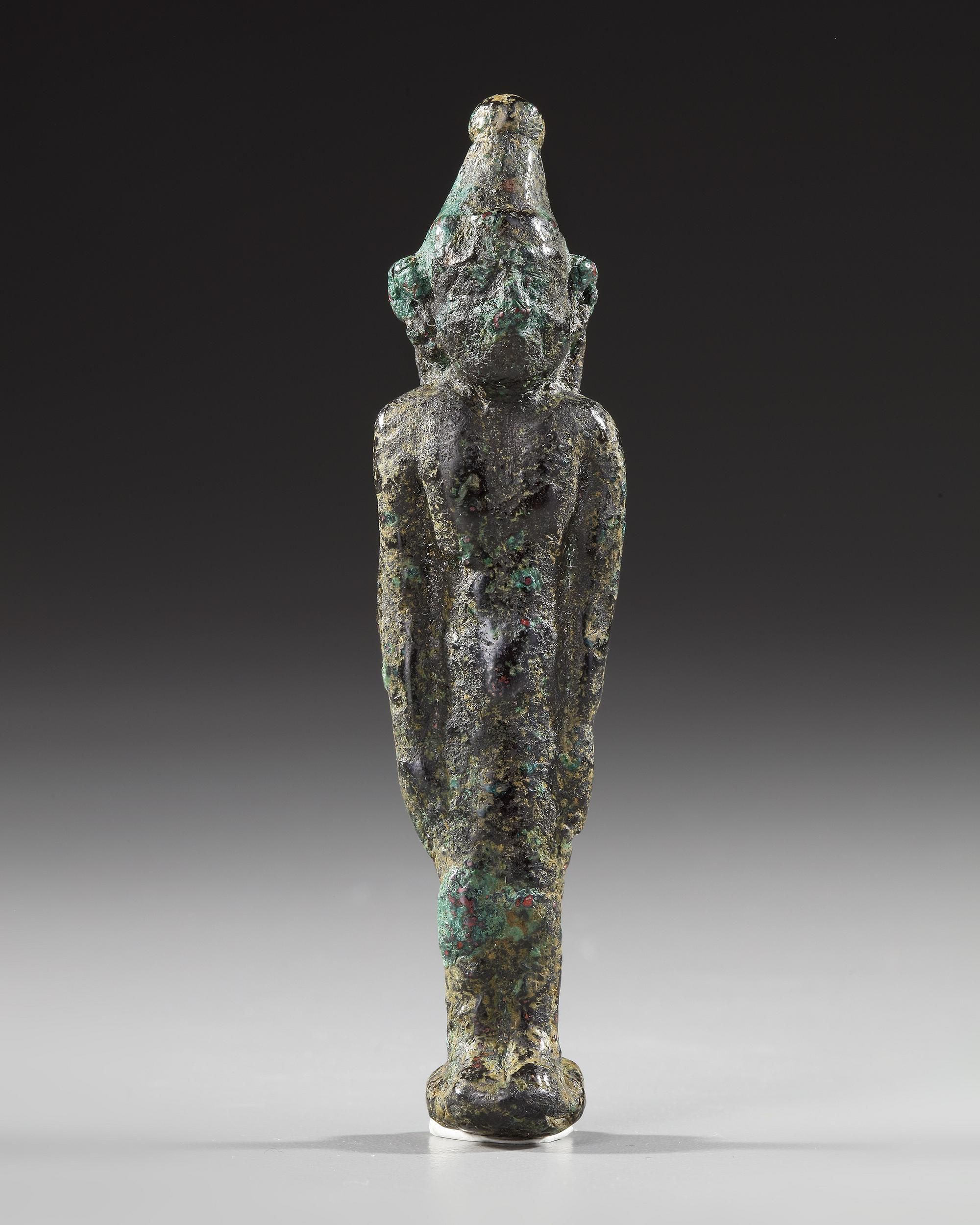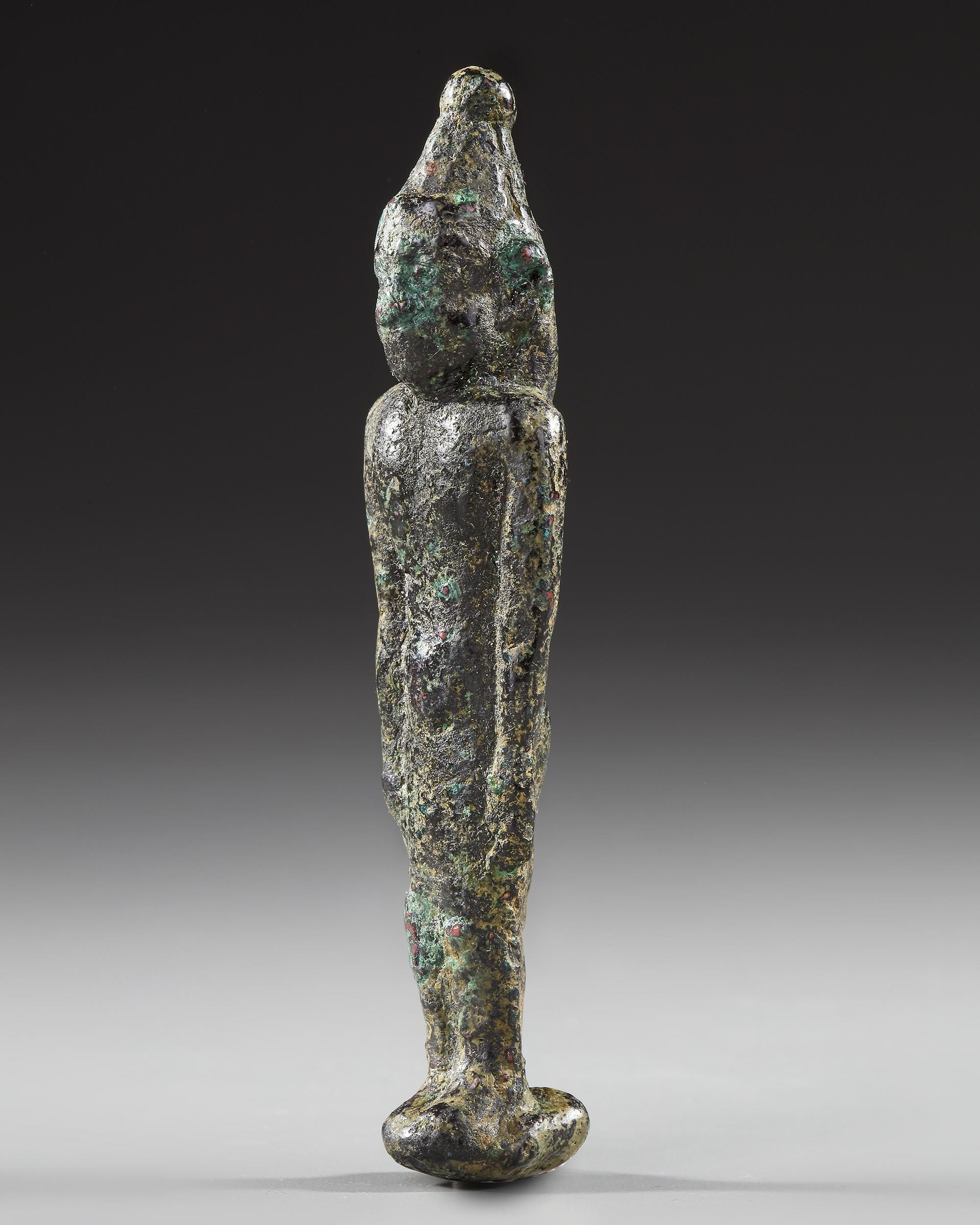 A Phoenician male diety (Melqart?) standing wearing a conical hat with arms at his side. Size: 9.5 cm. height. Weight: 96 grams.