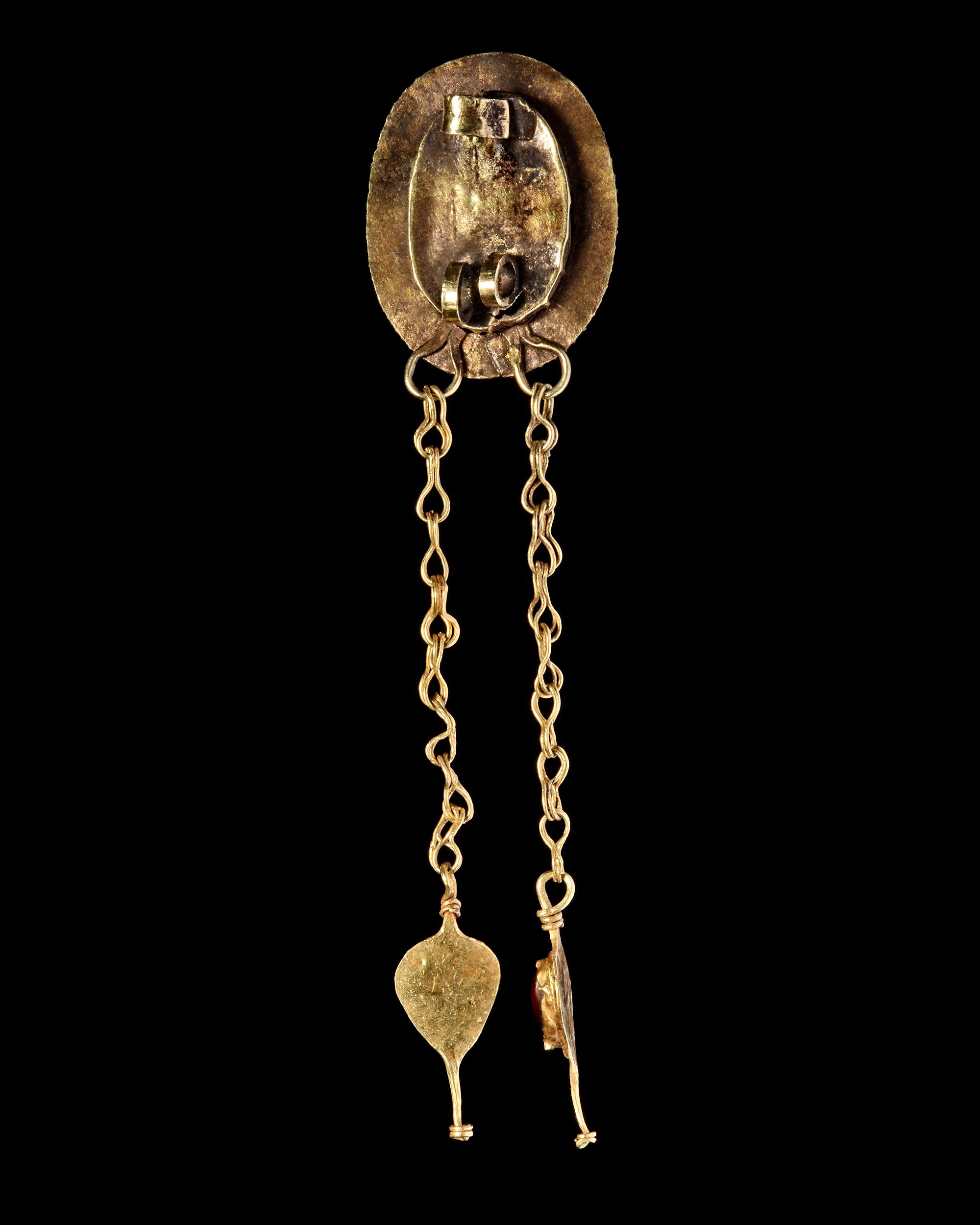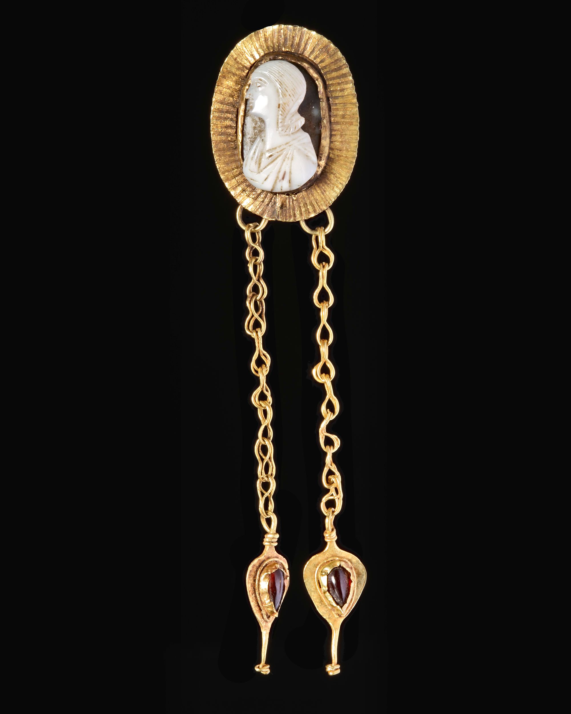 A Roman gold brooch from the Severan period showing a cameo mounted at the centre of a gold frame with radiating lines. The cameo shows a young woman facing left, draped and with a typical coiffure of the later Severan period, c.220- 240 AD. Two garnet inlaid elements hang from two chains. They end in wires which would have held river pearls. Gold, sardonyx and garnet. Oval mount: 22 by 16 mm. length of chains and mount: 74 mm.Such brooches might well have come in pairs and given the small size of their pins (now missing on this specimen) they would have adorned tunics made from fine, thin, cloth.