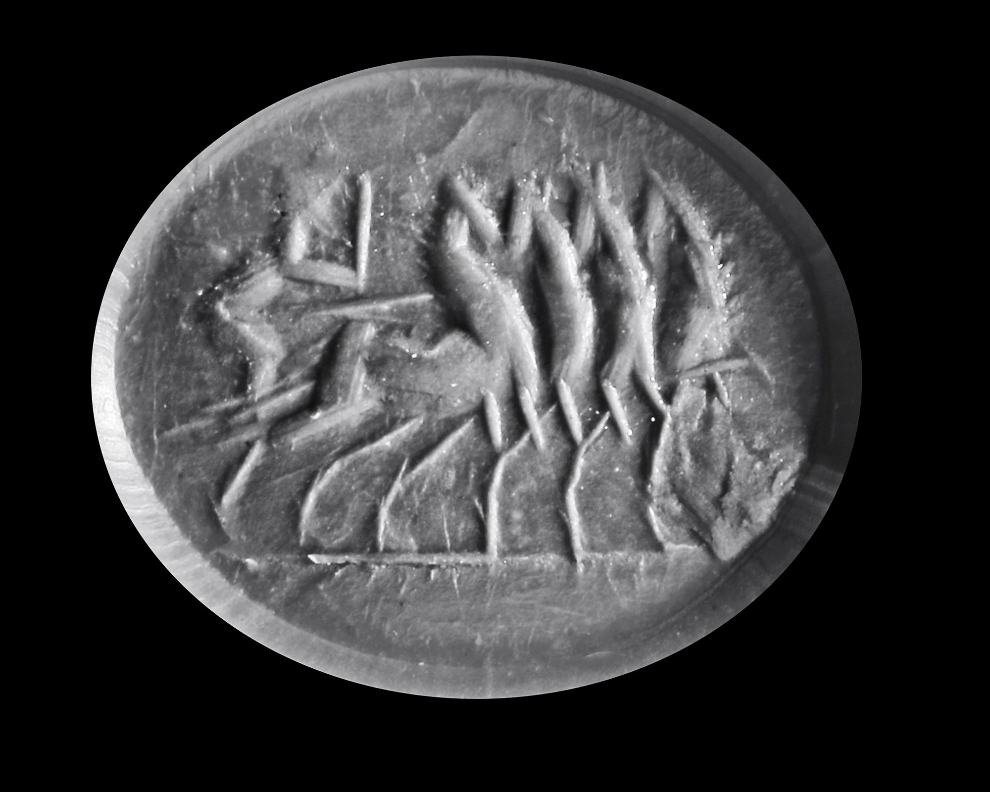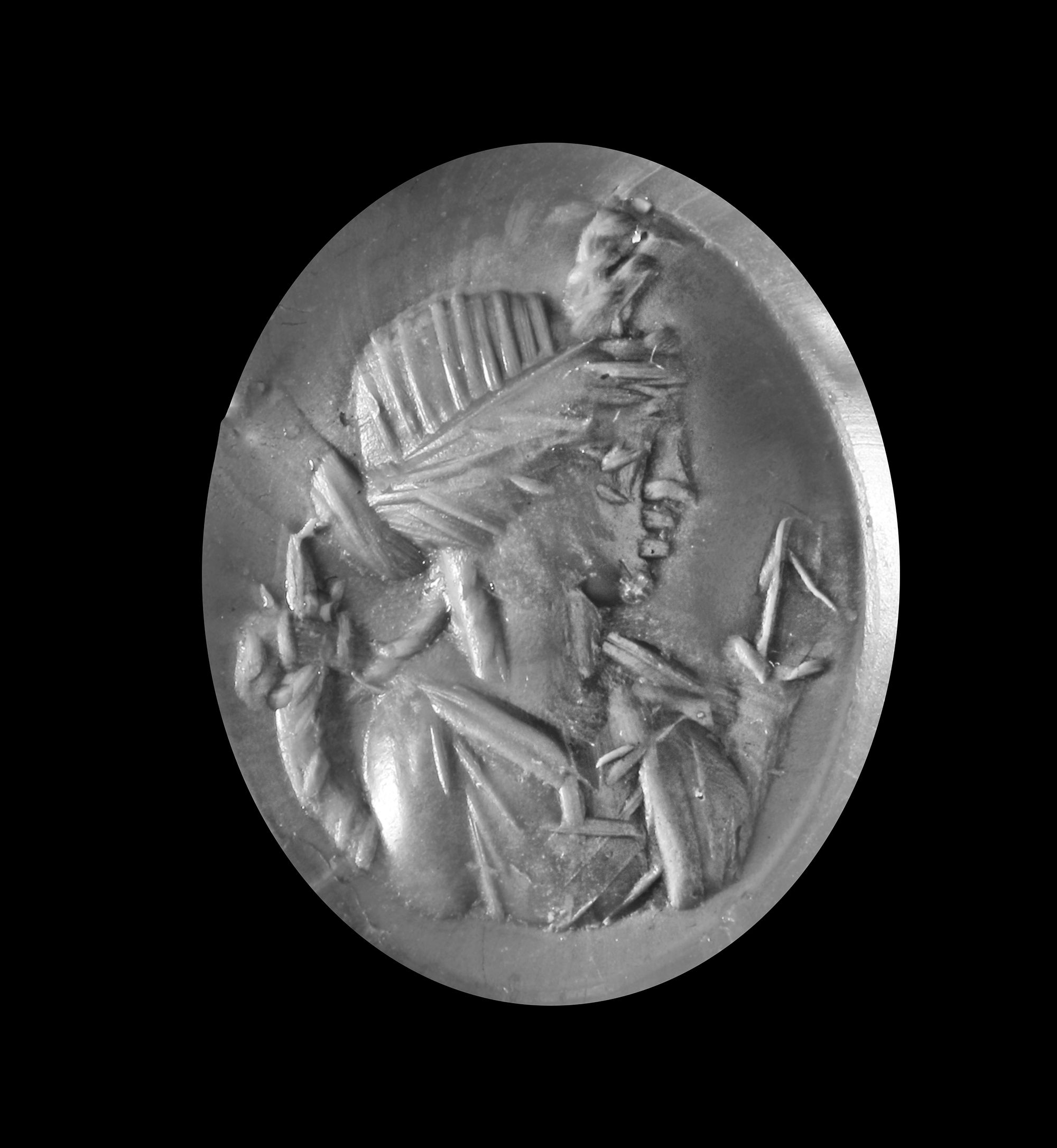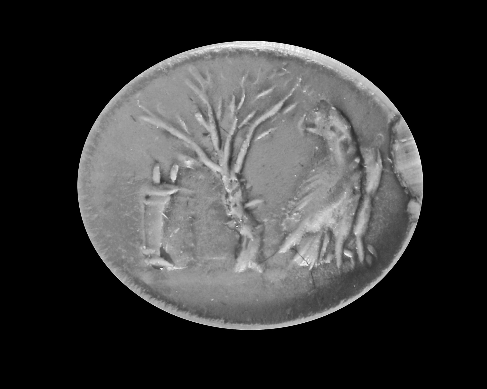 Three intaglios, one black agate with a cornucopia and a foot. One standing figure in chalcedony and a carnelian with a dolphin inscribed 'AT".