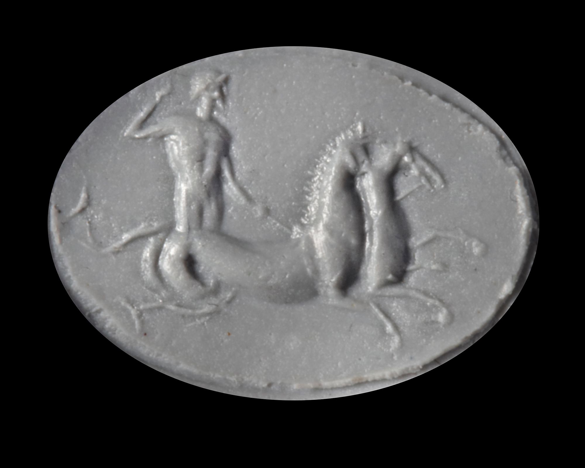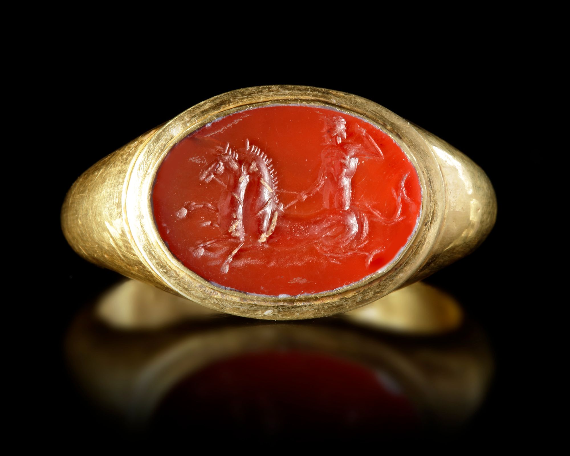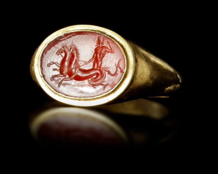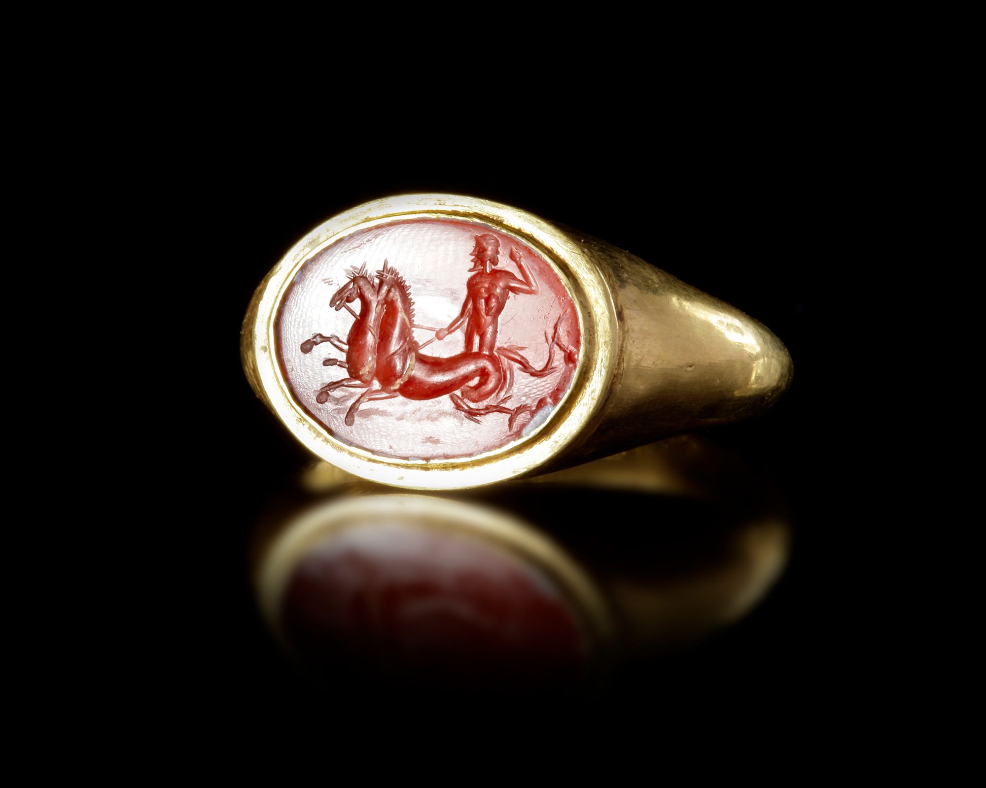 A Roman gold ring made from thick gold sheet holding an intaglio of Neptune/Poseidon being pulled by two Hippocamps. Of good work from the time of Augustus.