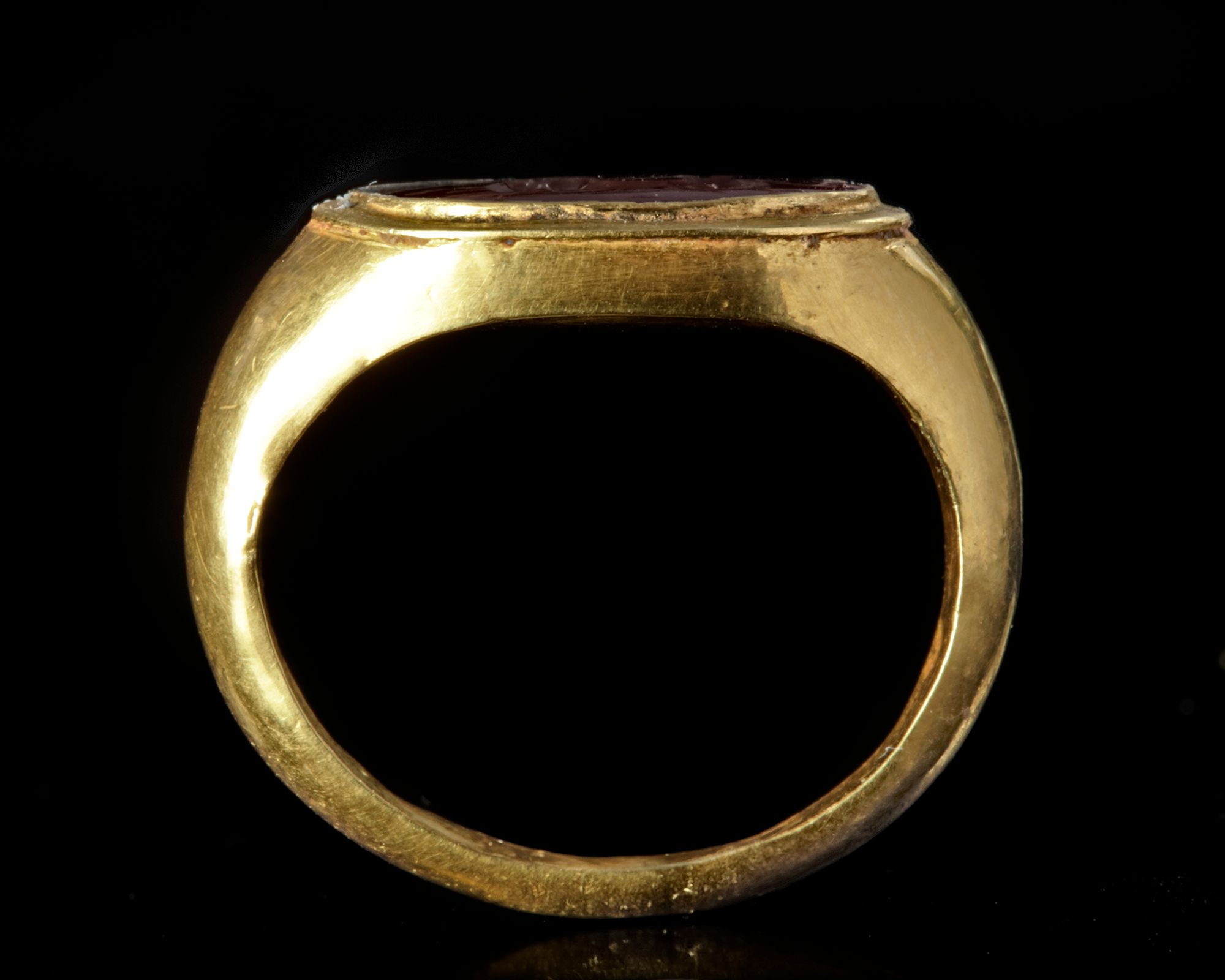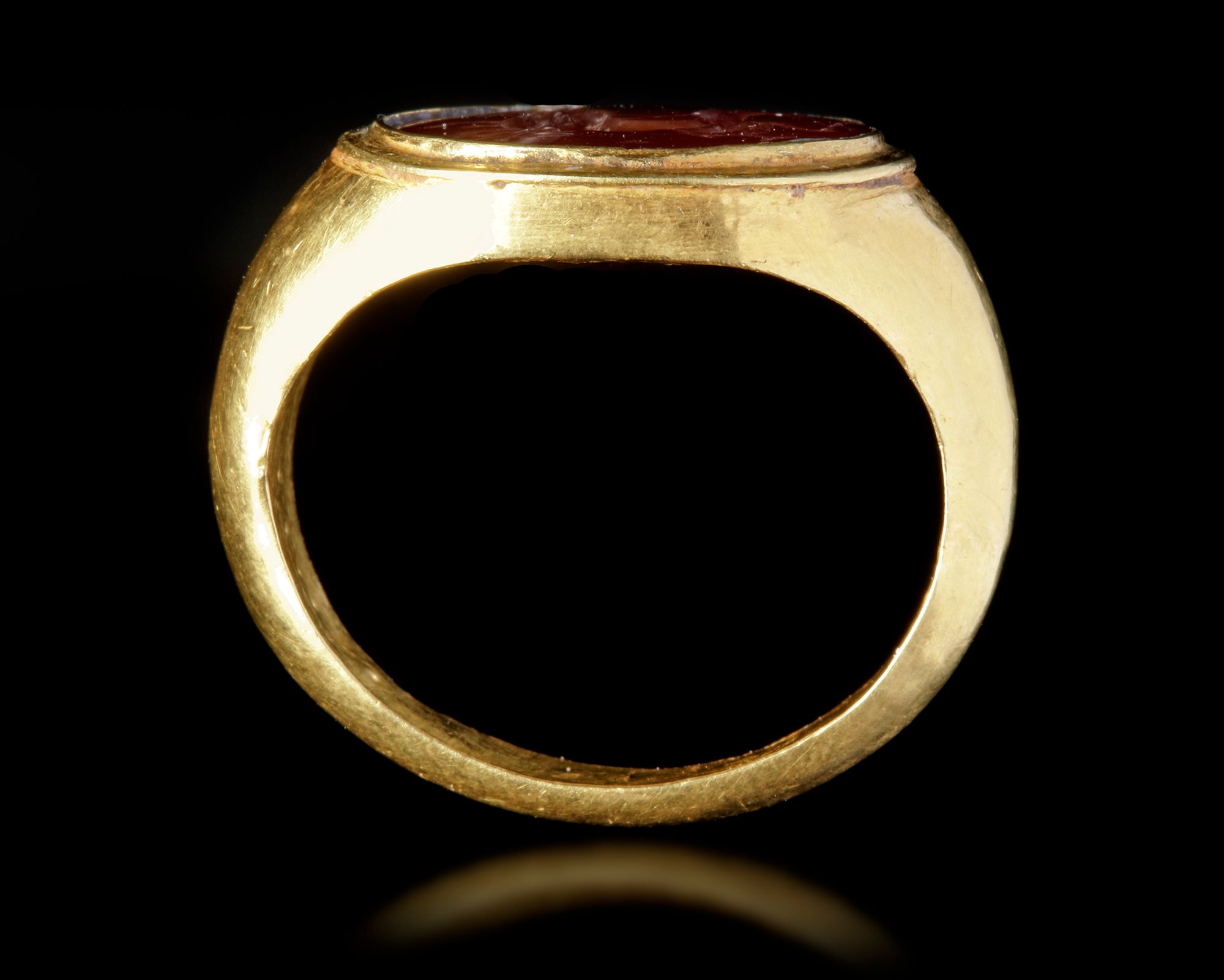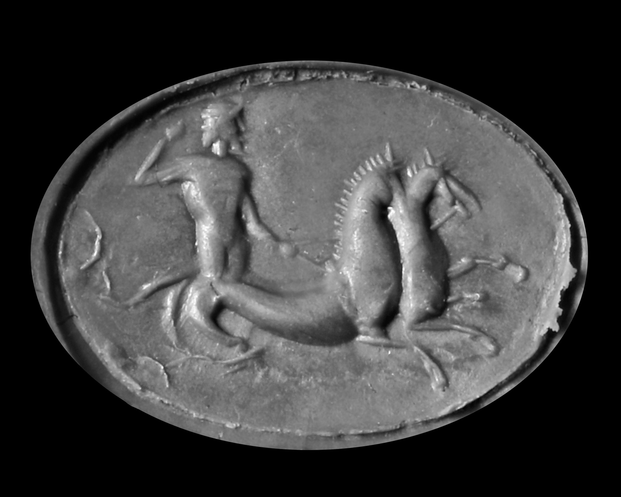 A Roman gold ring made from thick gold sheet holding an intaglio of Neptune/Poseidon being pulled by two Hippocamps. Of good work from the time of Augustus.