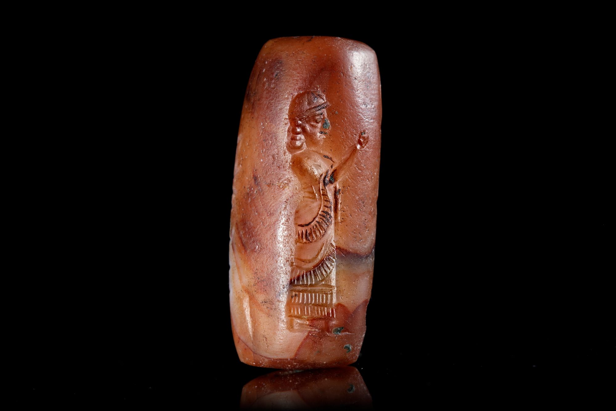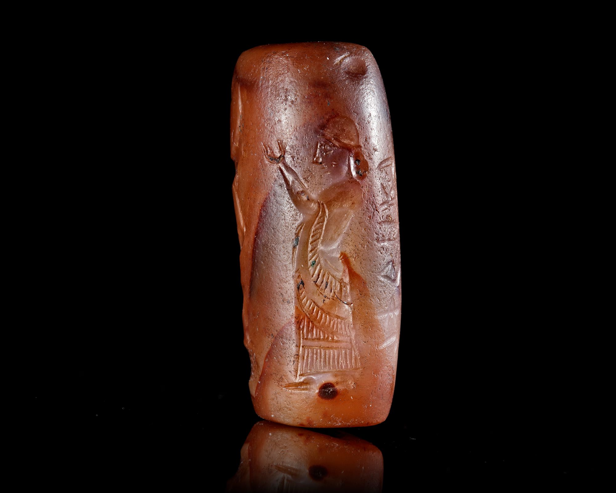 cylinder seal in banded orange/brown agate showing two attendants facing a kneeling figure holding a lunate symbol with a profile of a god shown in profile. A six letter Aramaic inscription is engraved in the space behind the backs of the adherents.