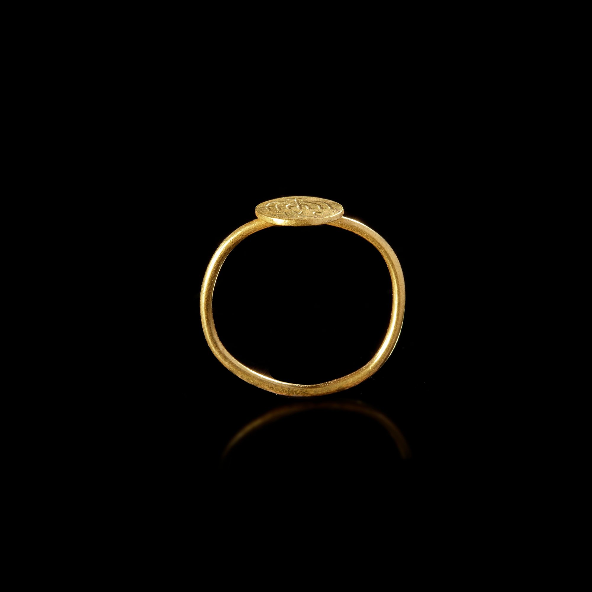 A Byzantine gold ring with a menorah and an Aramaic inscription. A typical early Byzantine ring made with soldered circular section wire and round bezel, engraved with a candelabra for seven lamps and three Aramaic letters.