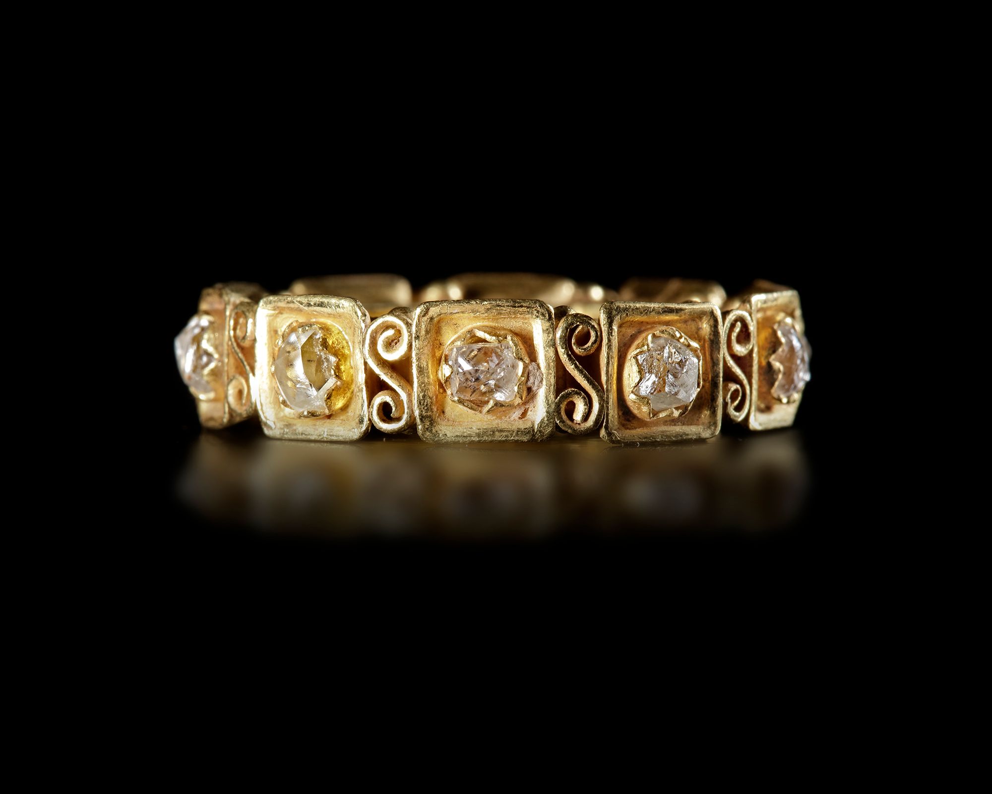 A highly important late Roman ring with ten uncut diamonds set in individual mounts which are soldered onto a ten faceted shank. The individual cells are then attached with 'S' shaped elements soldered between them while two golden spherical elements are soldered to the shank. The nearest parallels to this ring are the multi-celled rings which contain various semi precious stones, the best known example is from the 'Thetford Hoard'. Then there are early Byzantine bracelets which have similarly structured elements used to hold stones with similar claw mounts.