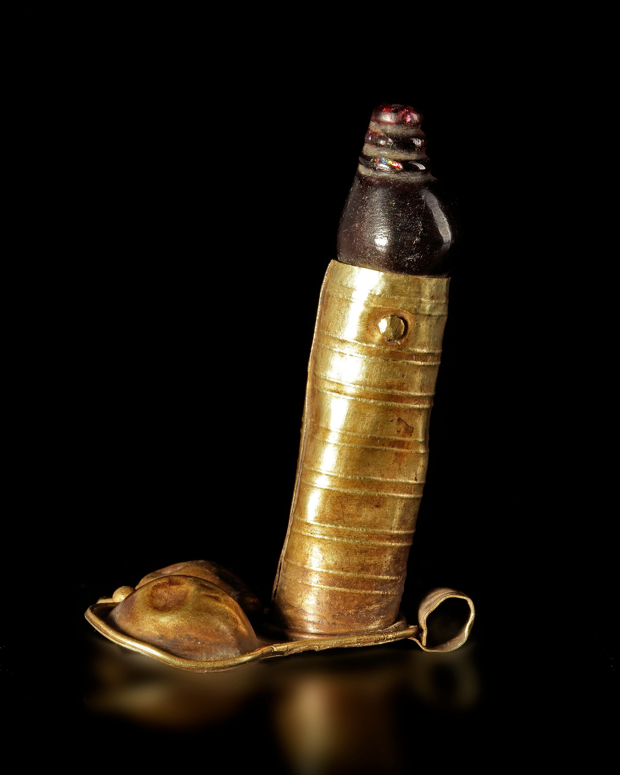 The glans is fashioned from garnet which is attached by a pin which runs through the pierced base of the inlay.