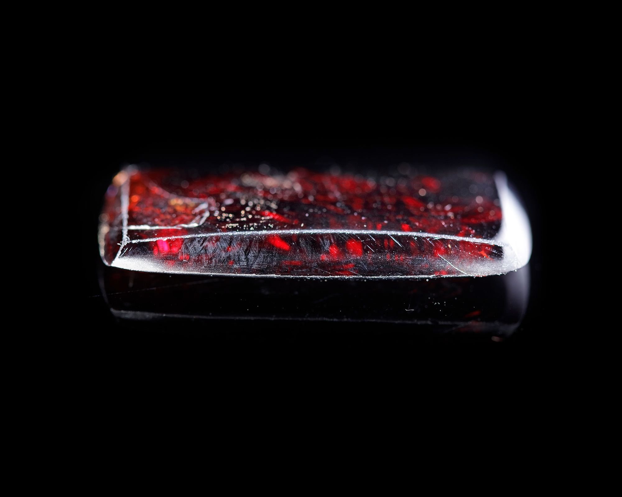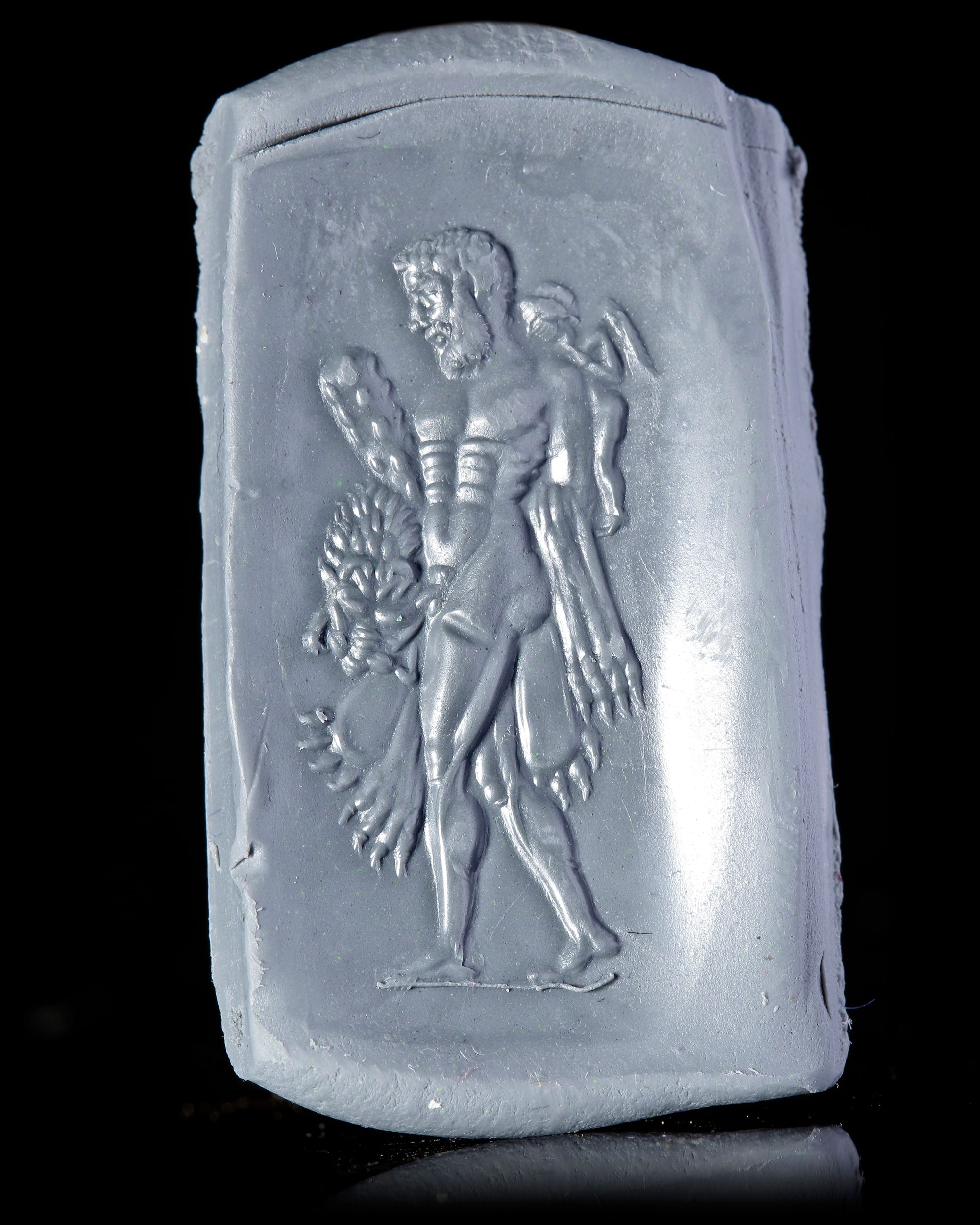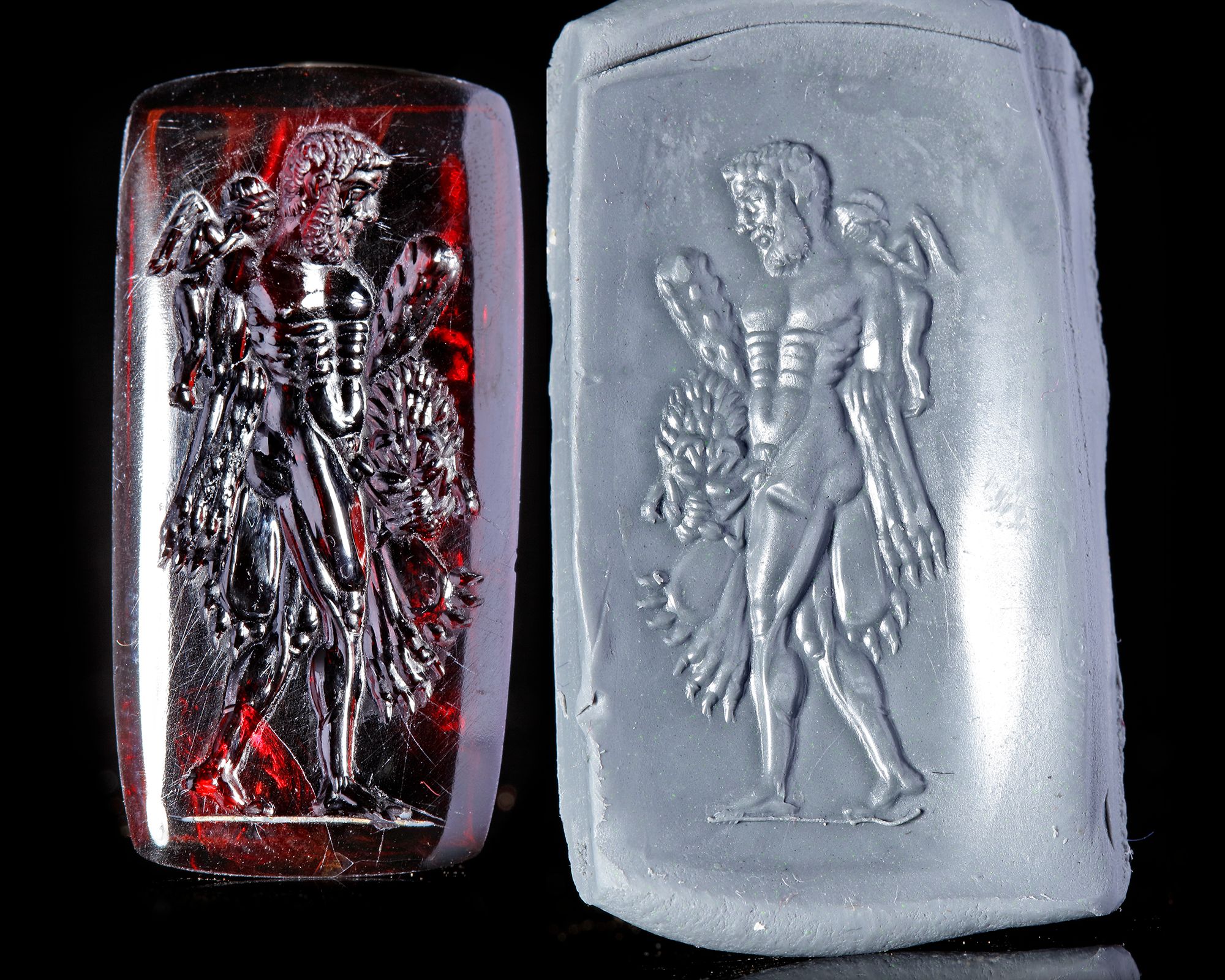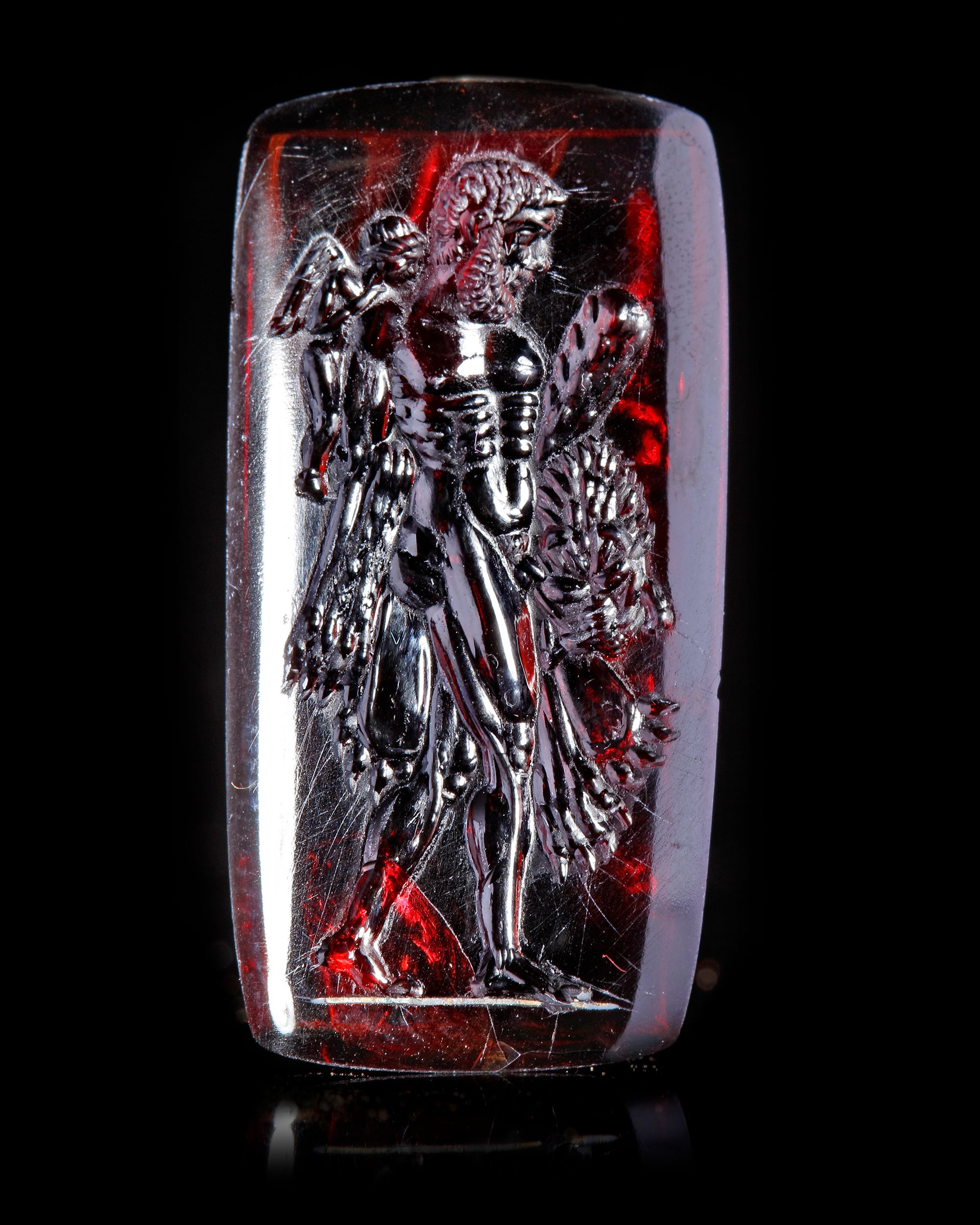 A large garnet intaglio showing Heracles walking to the right holding his club and lion skin on his left arm. A flying putto rests on his right shoulder. While the association of Hercules with putti often appears in later art here we have an example from antiquity. The oblong shape of this intaglio is encountered in in Hellenistic times till the early first century AD. Garnet 2nd c.BC.
