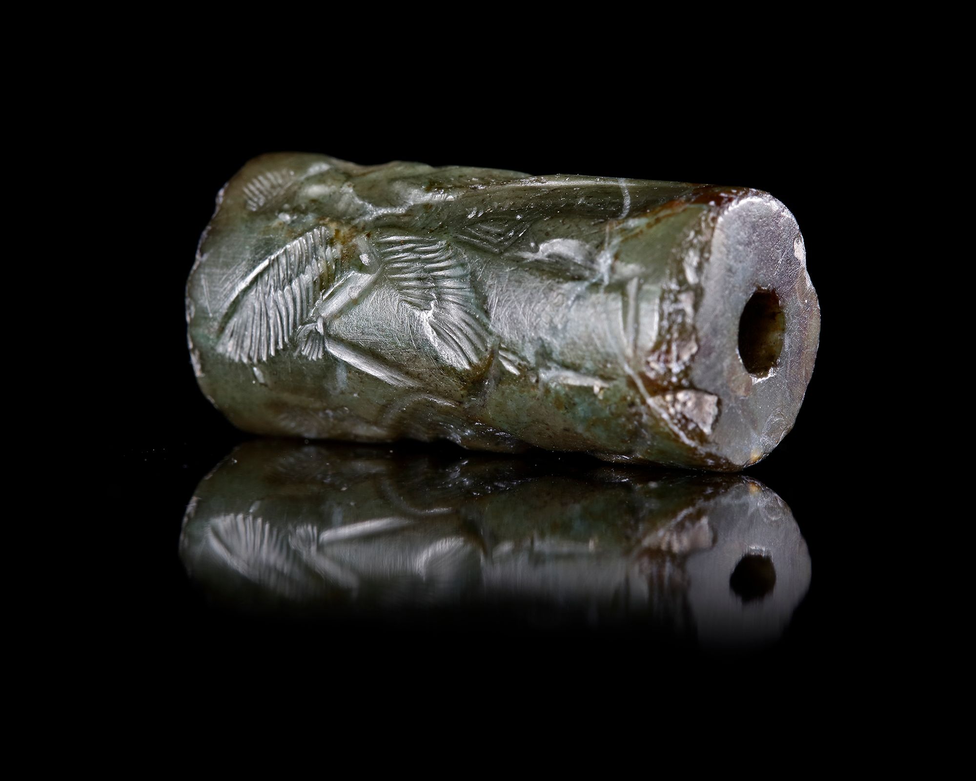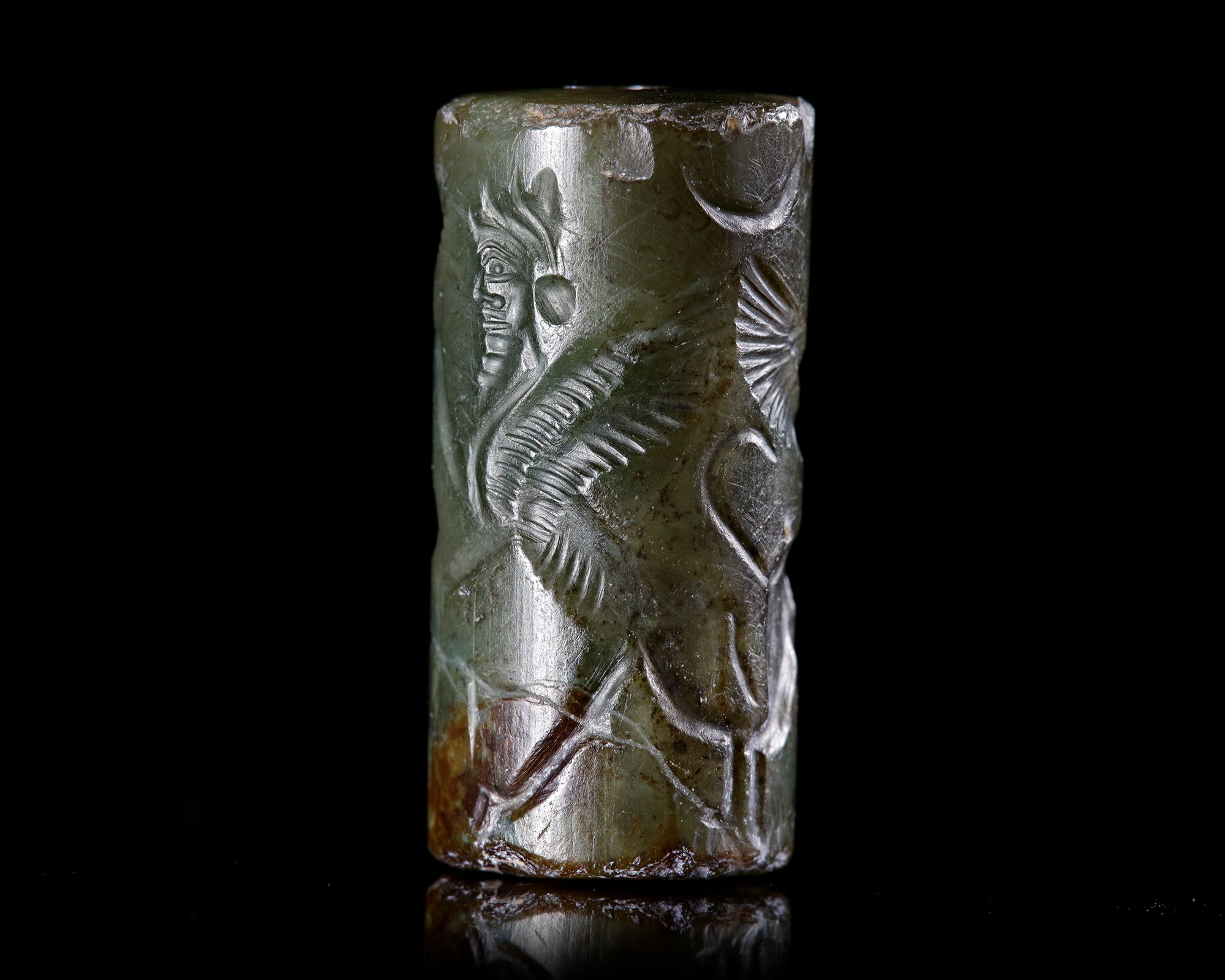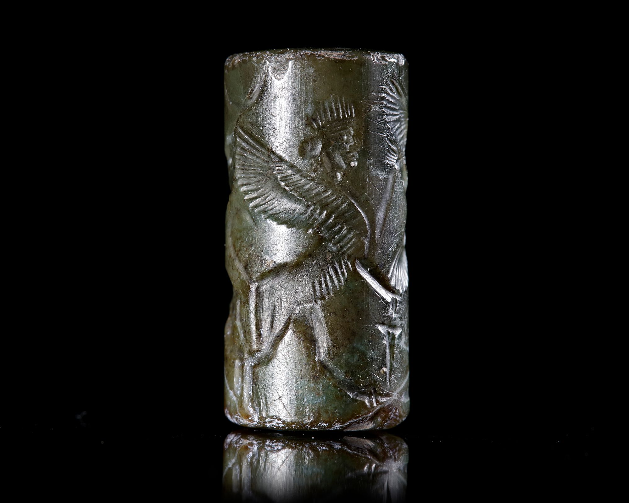 A green chalcedony cylinder seal, engraved with a winged bearded genius standing between two rearing winged sphinxes. Three cuneiform darts are added in the lower spaces of the seal, do doubt donating the name. ??? 27 by 12 mm.