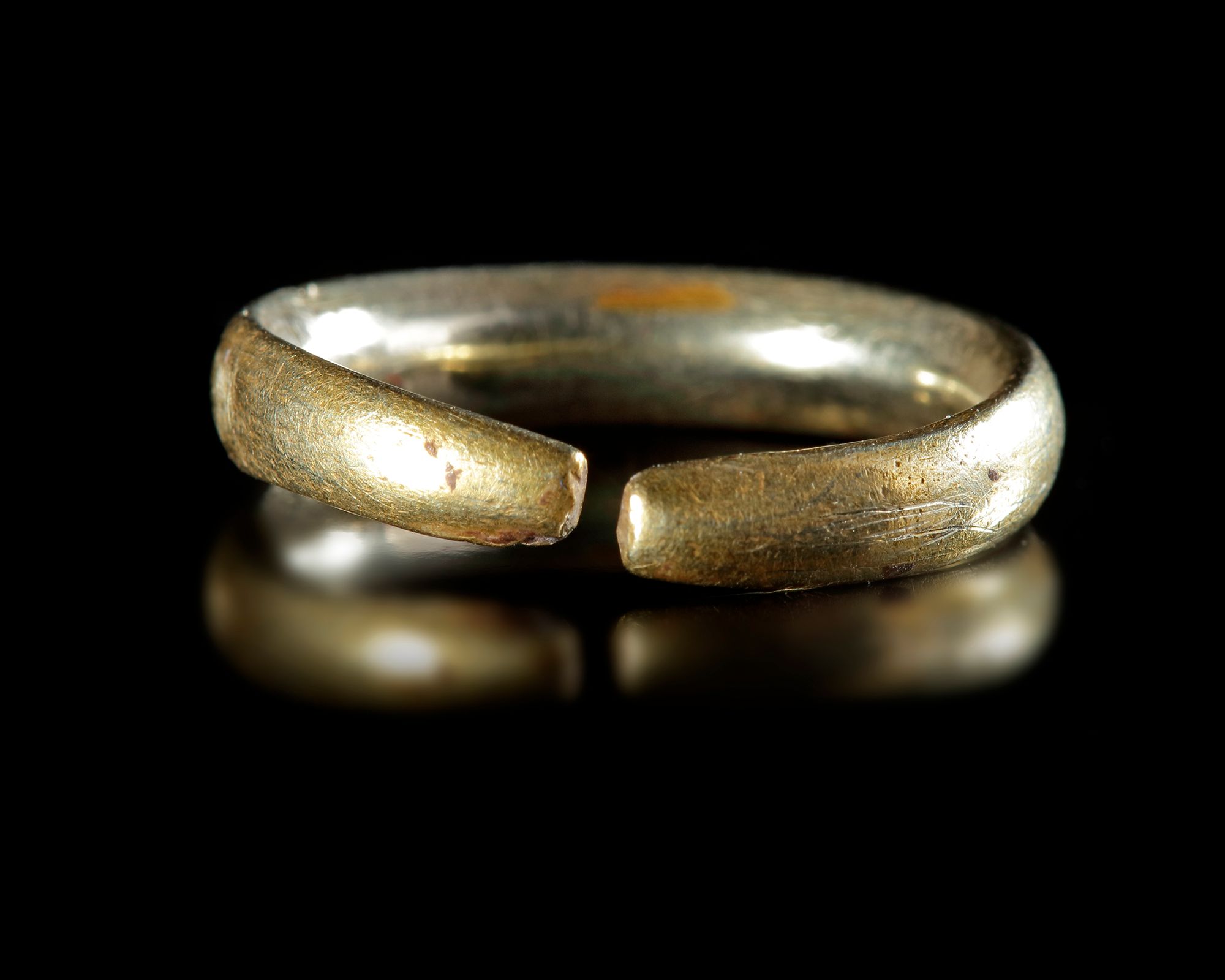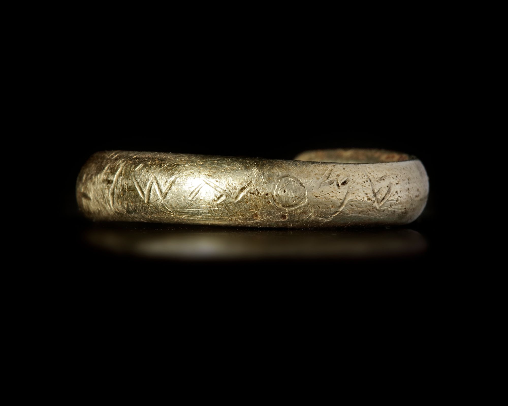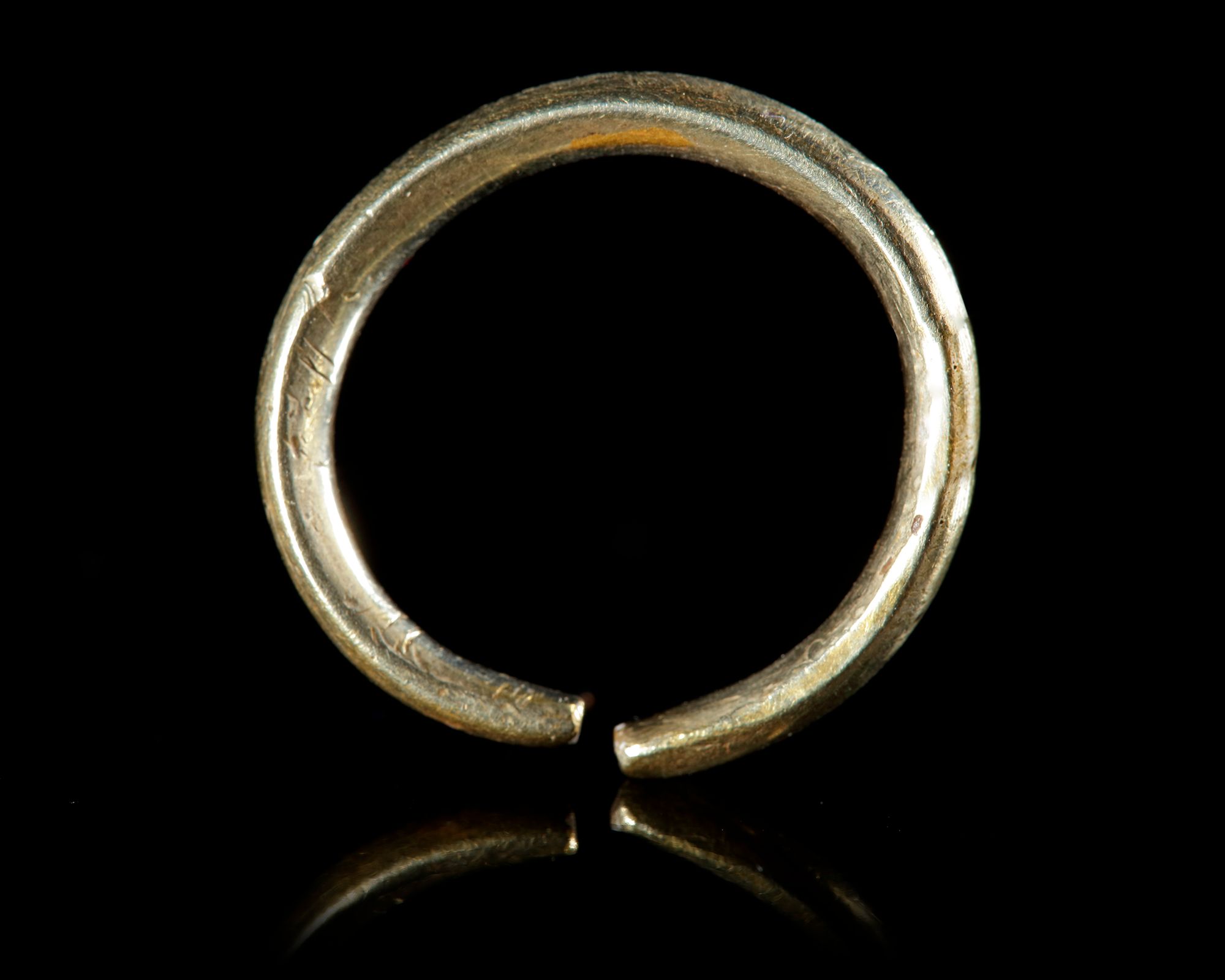 An electrum ring fashioned from a bevelled bar bent into a circle. Engraved onto the outer surfaces are eight letters, 'LamdAlephNunSin(?)AinMem(?), two letters are difficult to read. We would assume that the present piece is from the Levant from the Biblical period. While the letters are well formed a further reading and translation of the inscription will help us with identification.