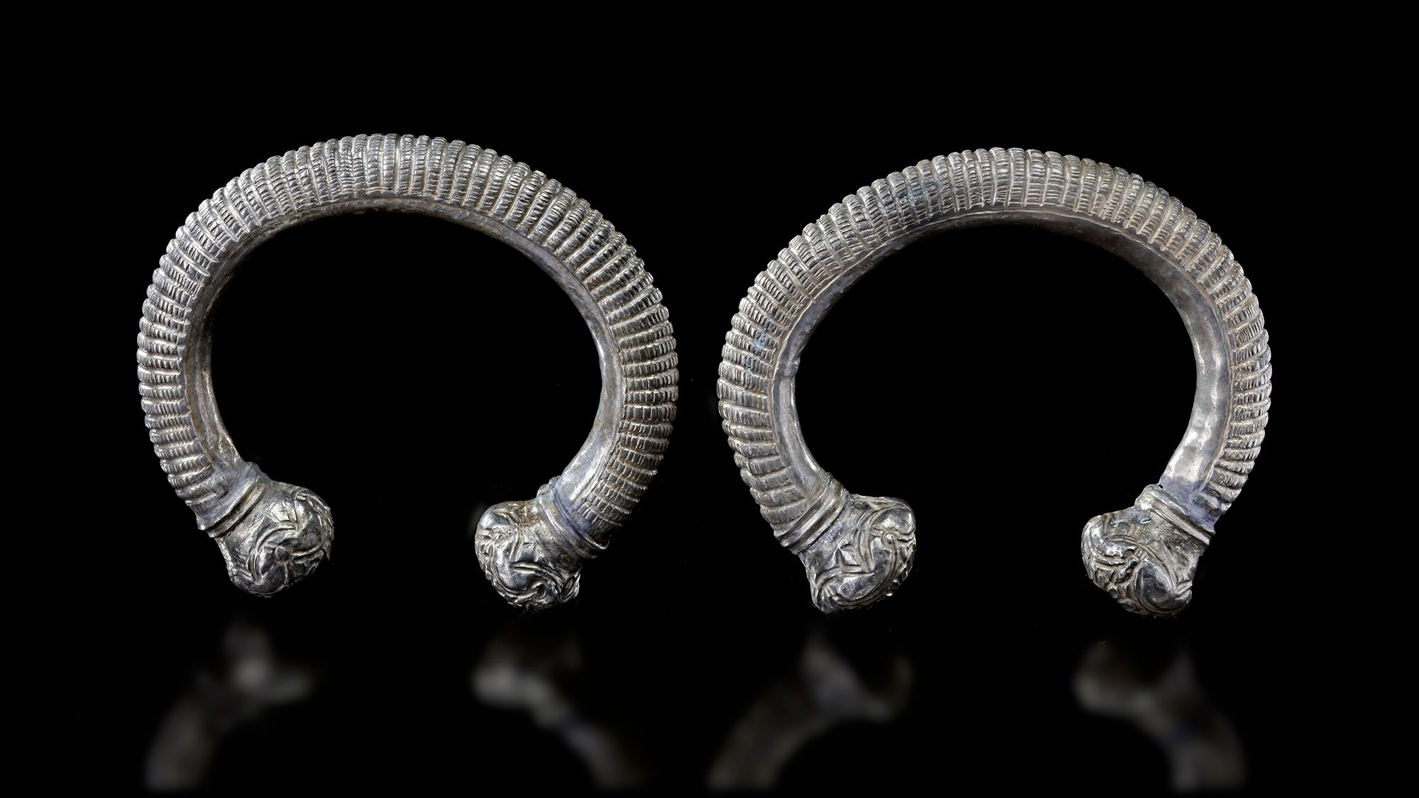 Two intact silver bracelets with club-shape and engraved decoration. Diameter: 8/8.3 cm. Thickness: 1 cm.