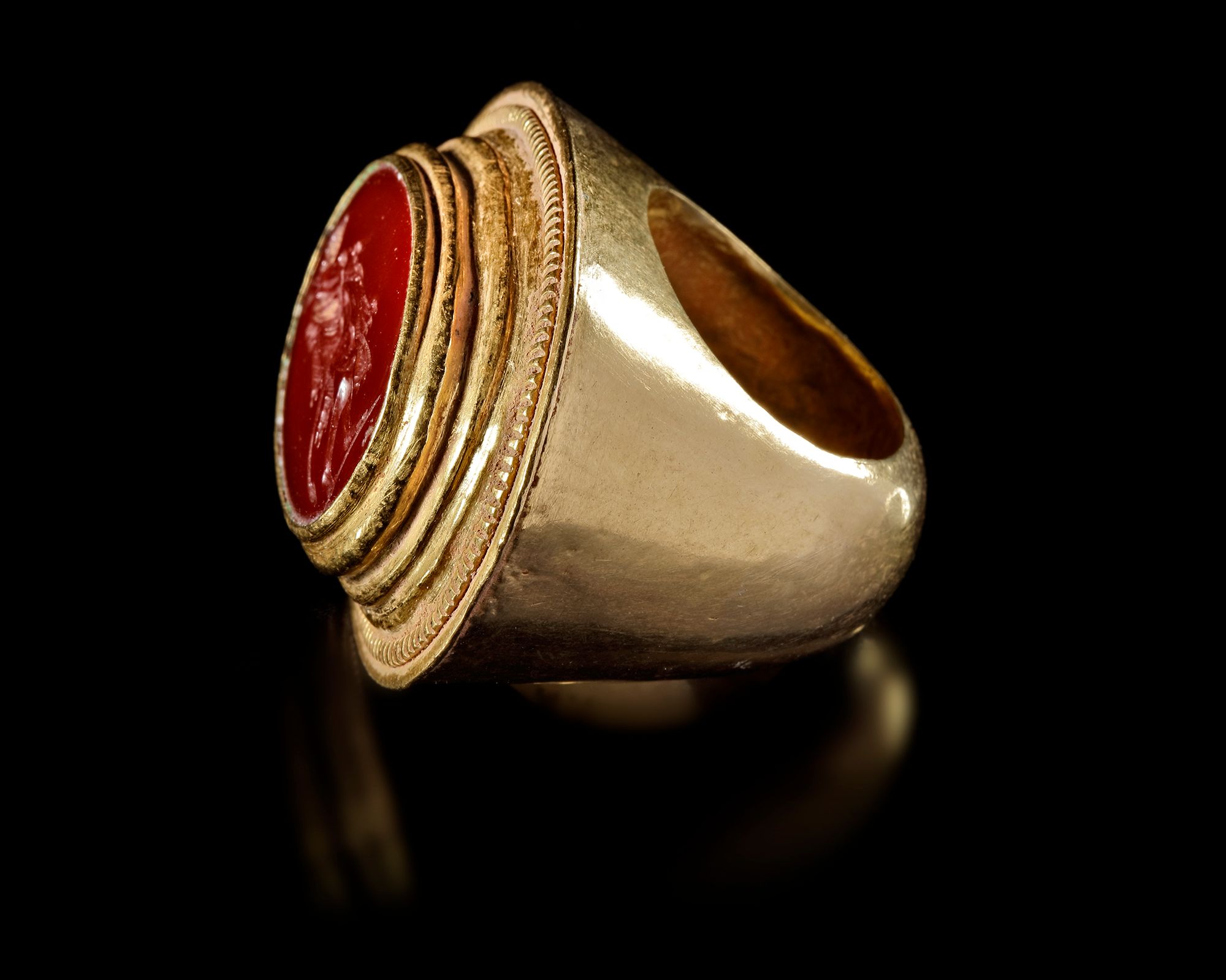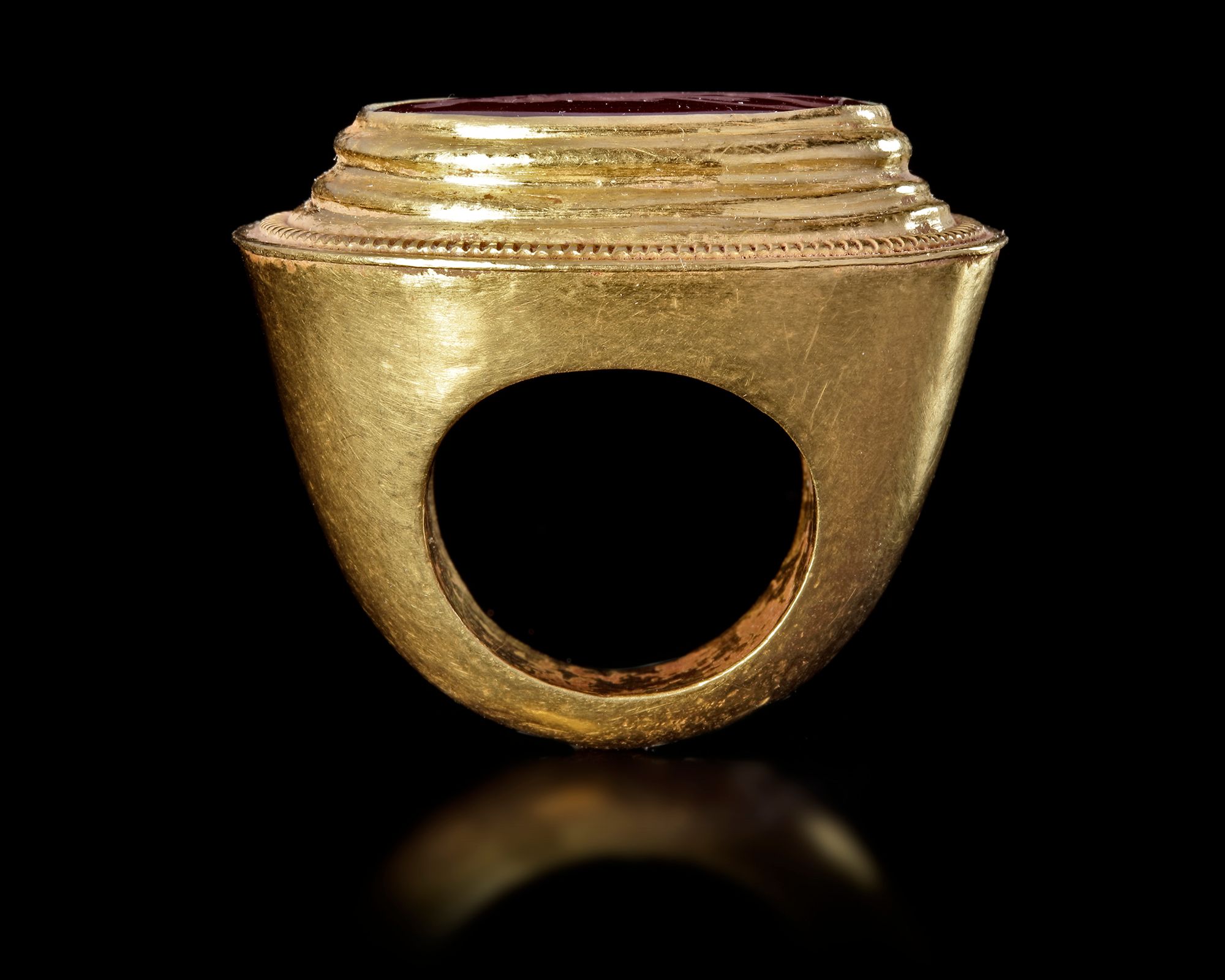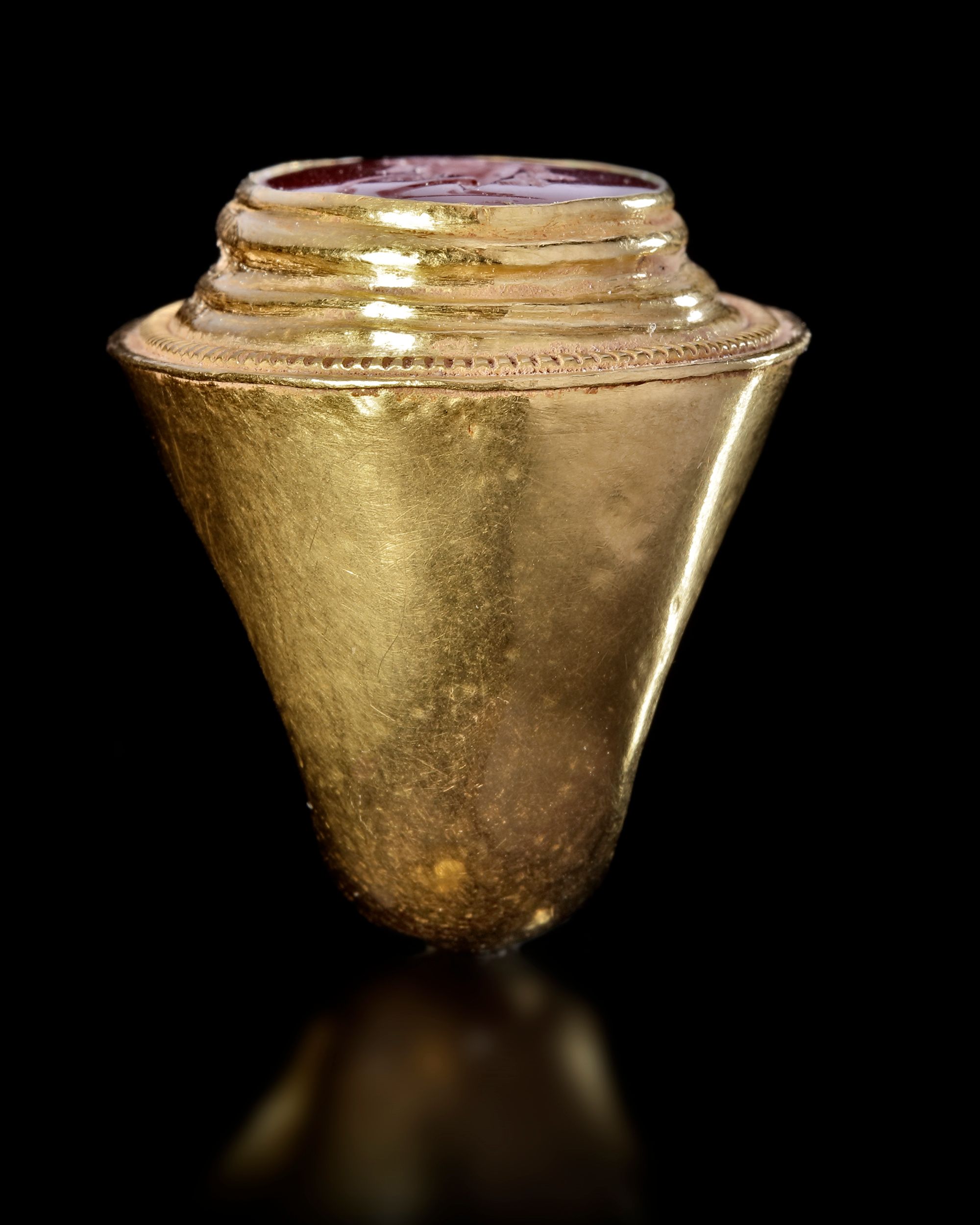A large Hellenistic gold ring with an intaglio of Omphale standing to the right. The ring is of a type common in Ptolemaic Egypt and the Hellenized orient from the third century BC onwards. They are usually hollow of solid construction, made to be worn. This specimen has an elaborate stepped setting for the stone, an elegant solution for the size of the seal. Omphale was a very popular subject at this period and is often shown with the attributes of Herakles, an allusion to having to swap clothes with Omphale which she owned him as a slave for three years. Gold and carnelian Hellenistic.