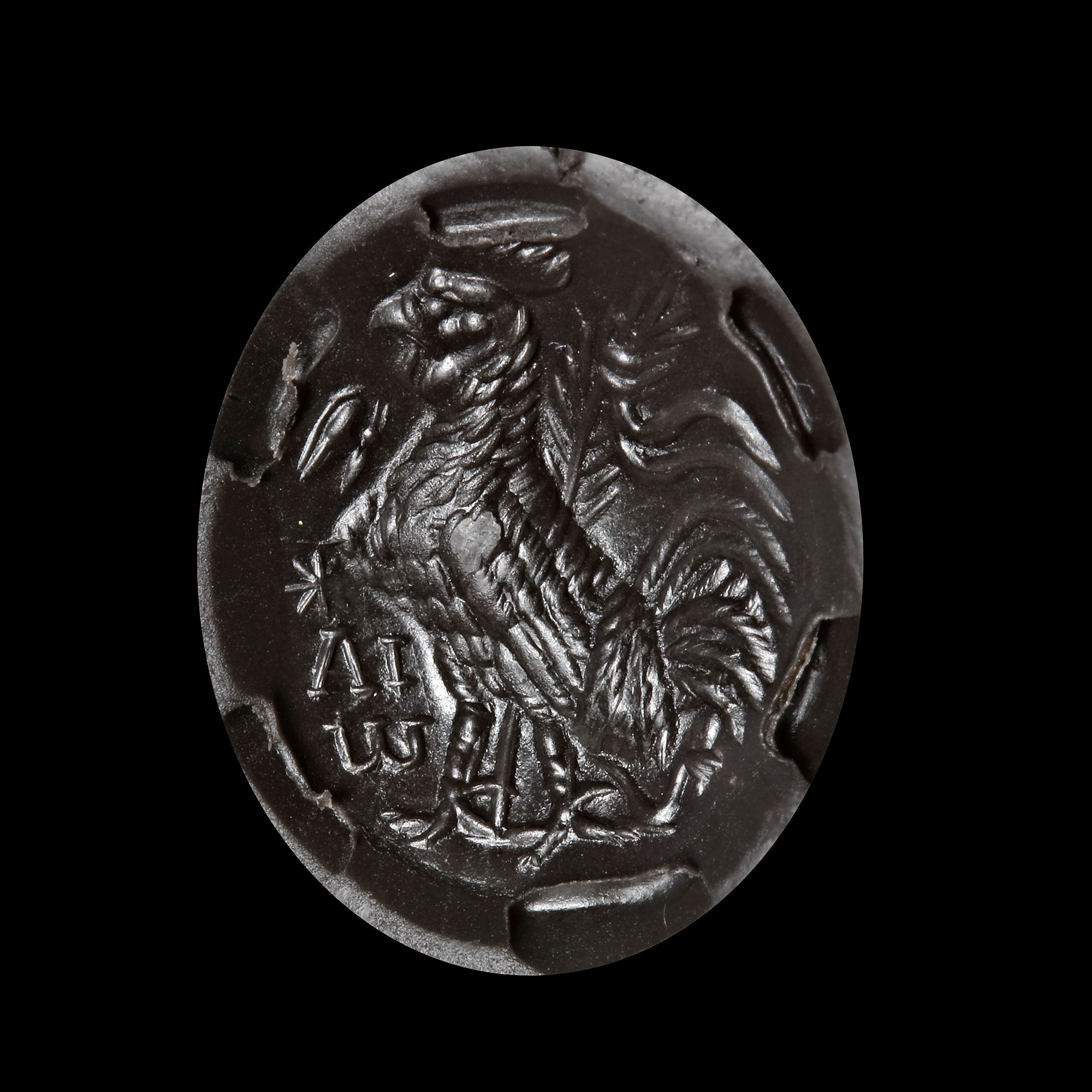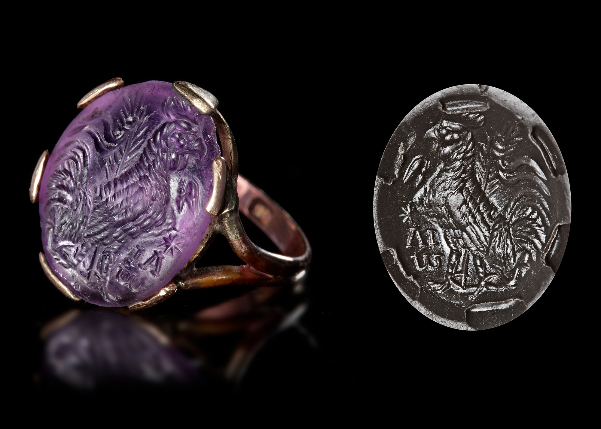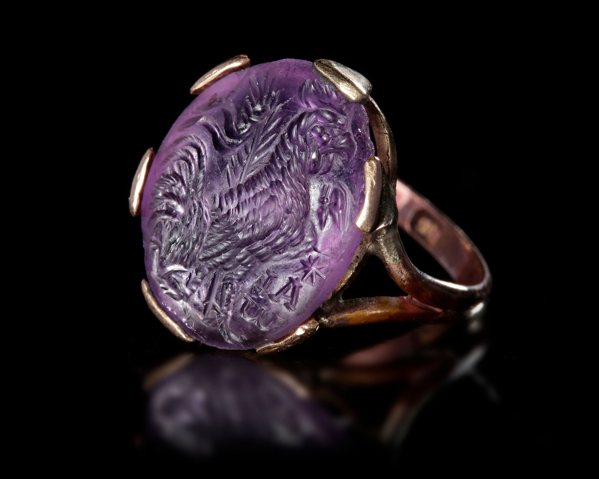 An amethyst double faced intaglio with a standing cockerel to the right with a palm frond behind and inscribed 'IAW' with a star. The reverse shows an ibis with an inscription above.