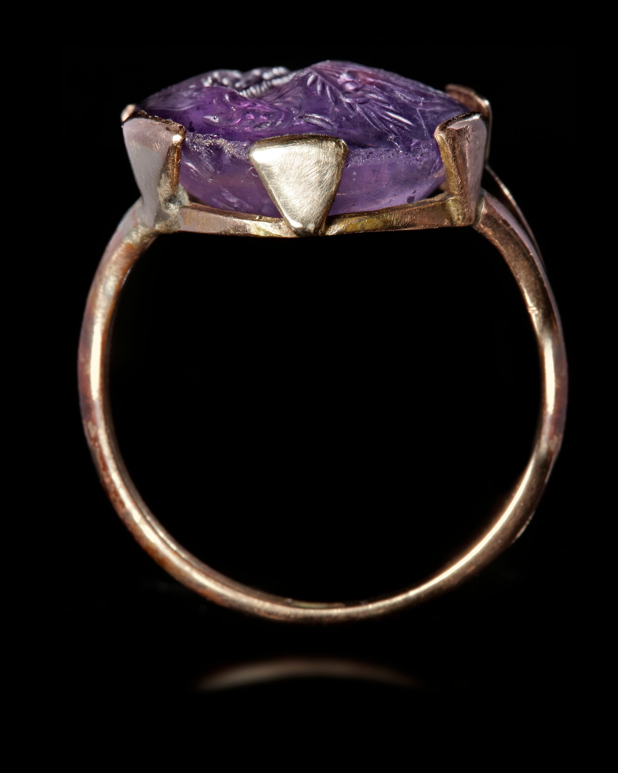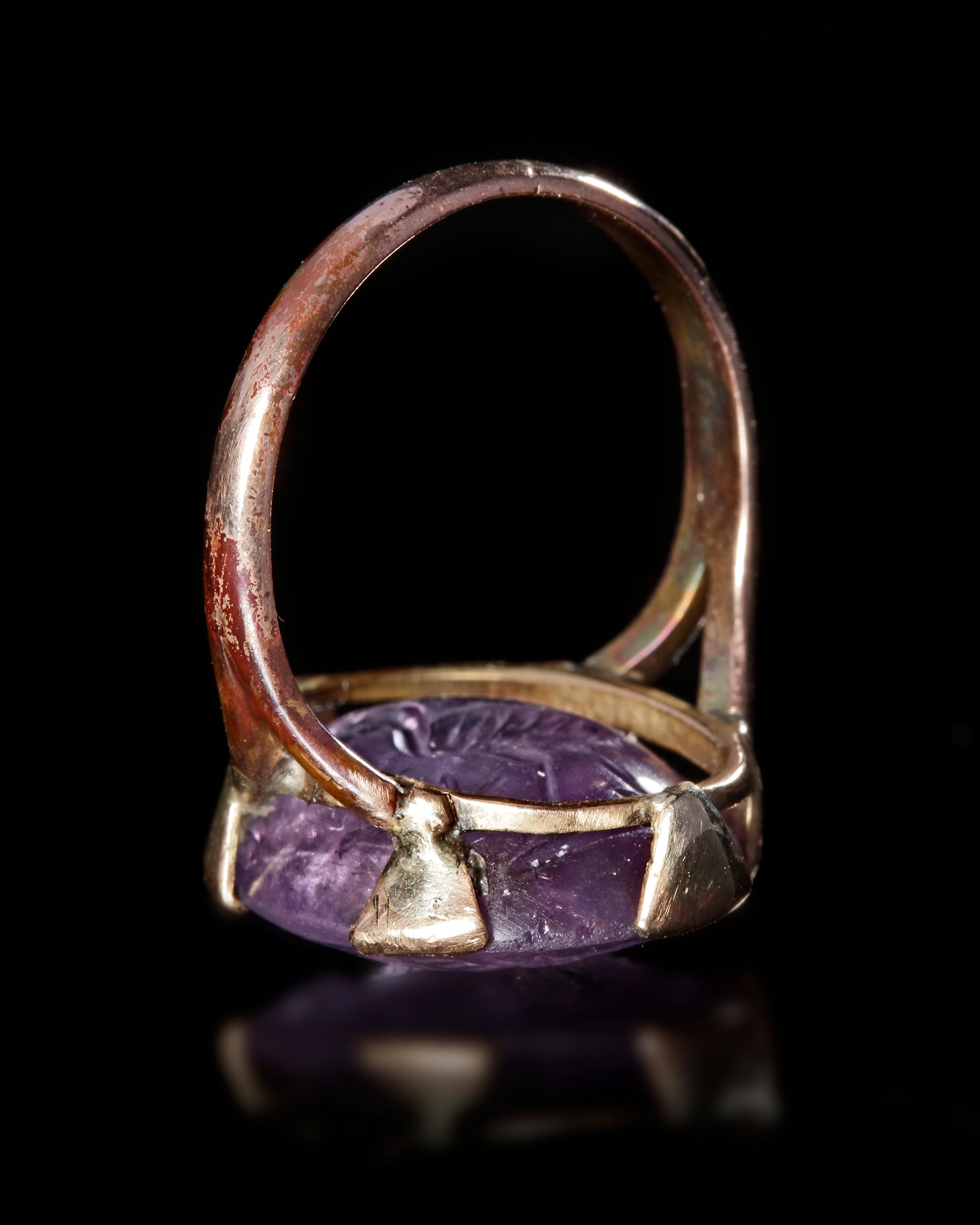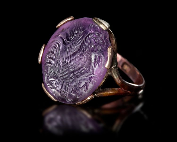 An amethyst double faced intaglio with a standing cockerel to the right with a palm frond behind and inscribed 'IAW' with a star. The reverse shows an ibis with an inscription above.