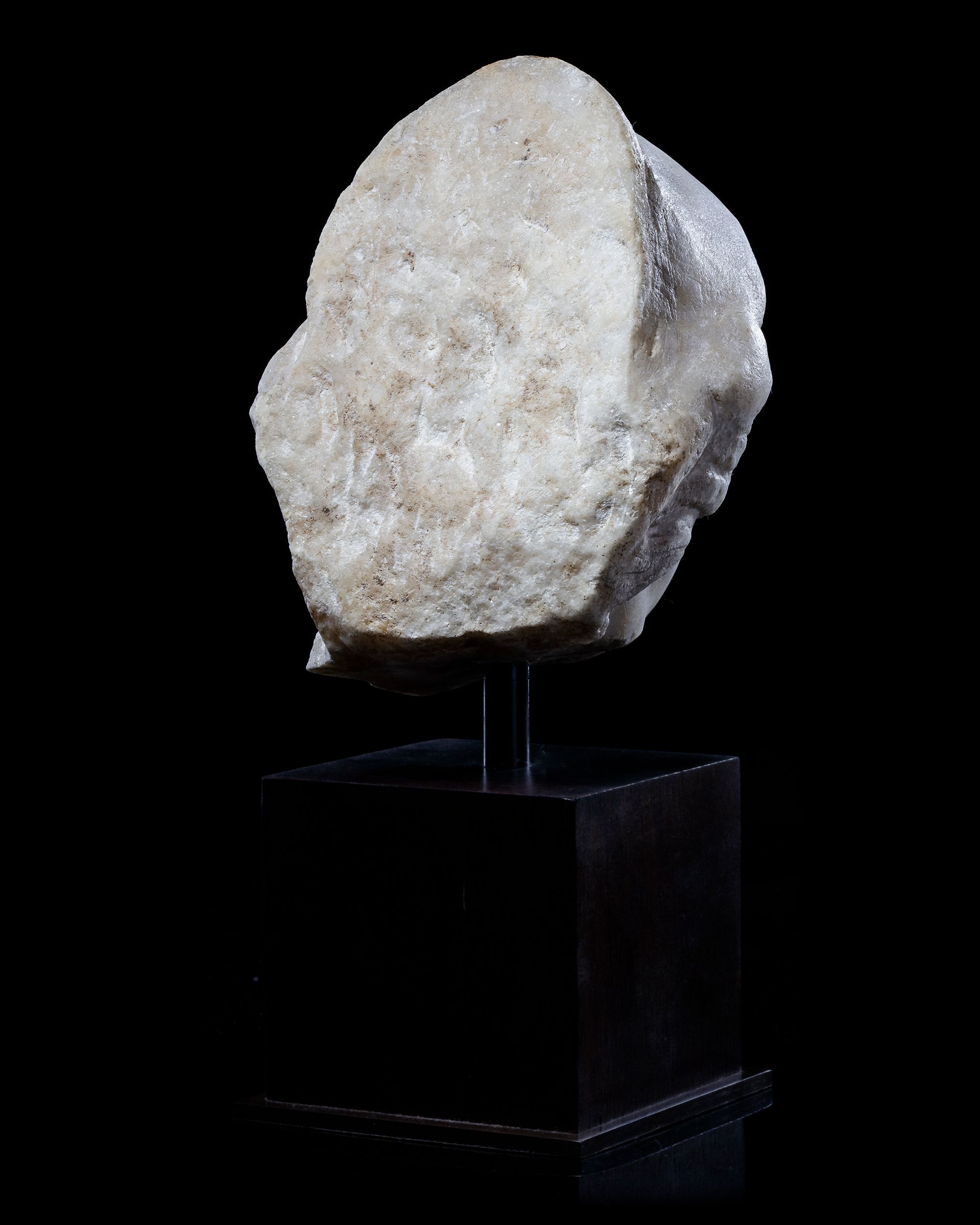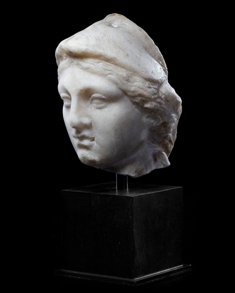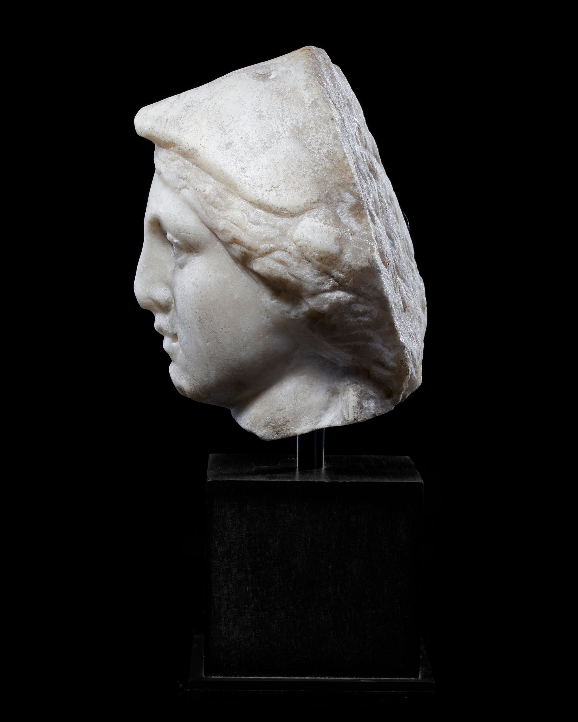 A well preserved head of Minerva/Athena in white marble. This pleasant head of Minerva/Athena, one of the Capitoline gods of Rome, would have been a popular choice of subject for the statuary which adorned the houses and villas of the wealthy. Normally this would have been part of a bust or more likely, a large statuette, of the goddess. As the work has no signs of a running drill being used so one would date this the first century AD.