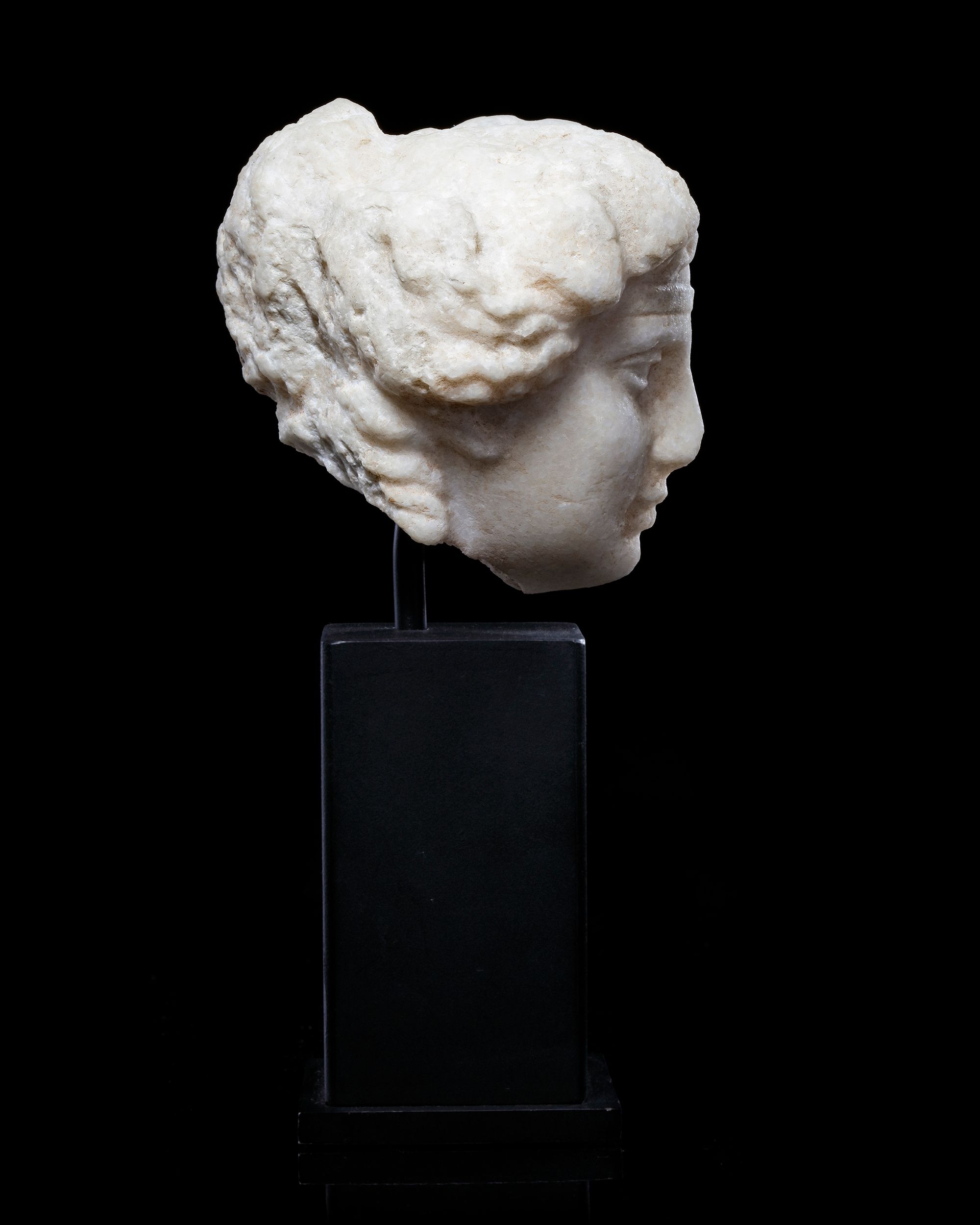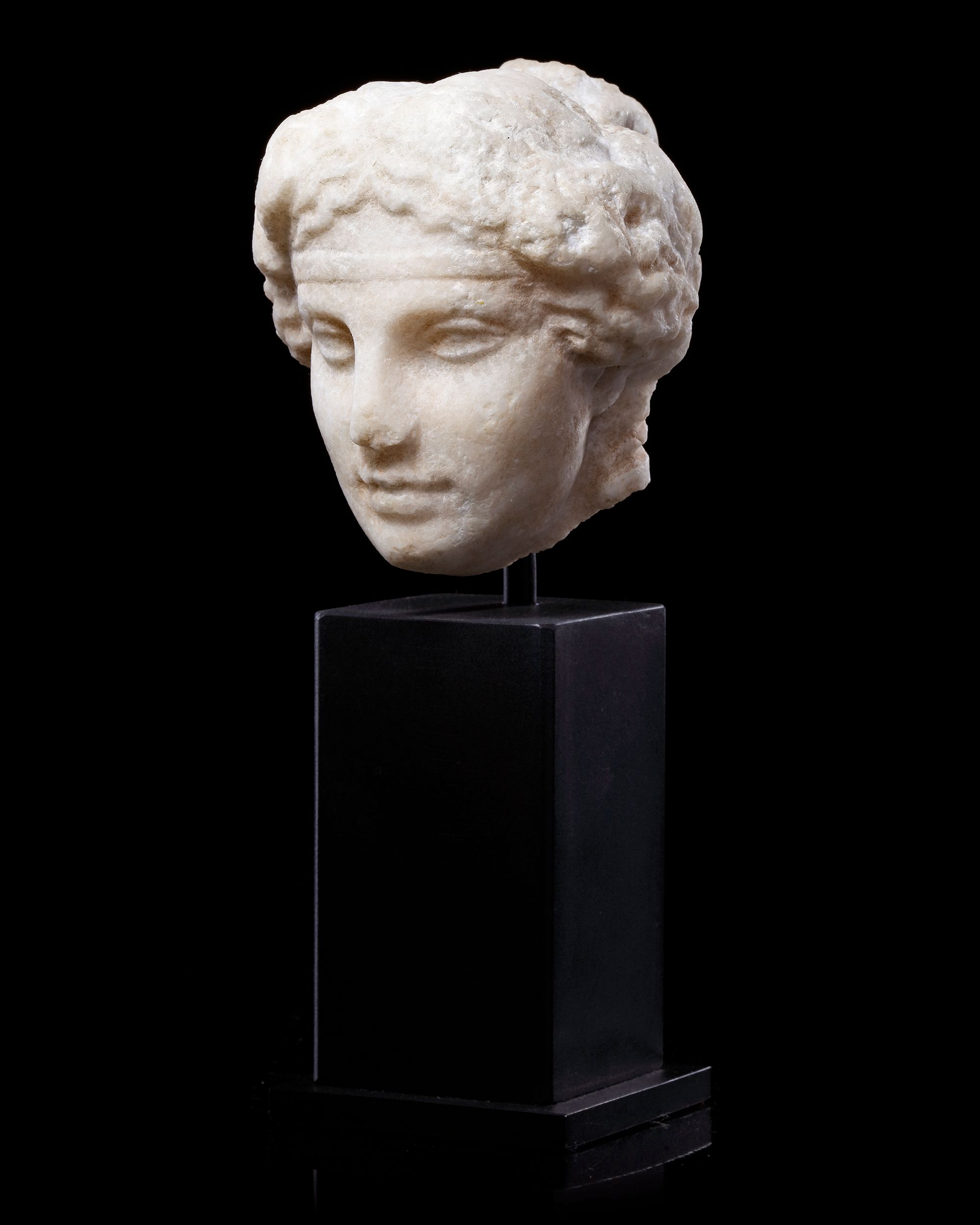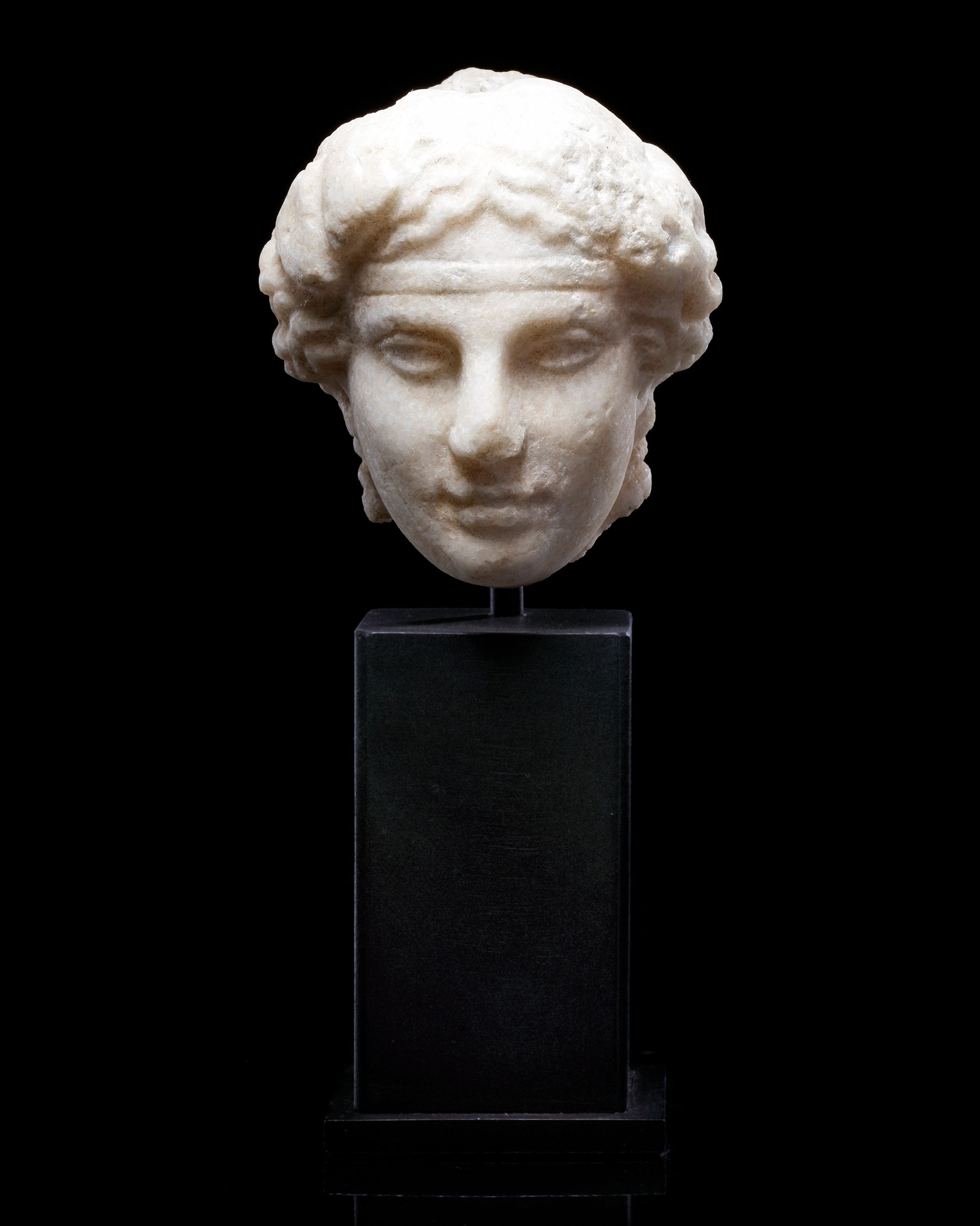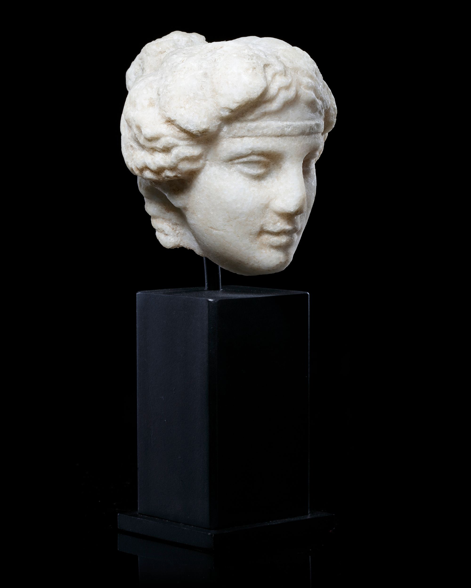 A small marble head of Apollo from the late classical period, circa 400 BC. This small head is a head of Apollo with a head band crossing his forehead. Well preserved and intact it would have come from a small cult figure, probably votive.