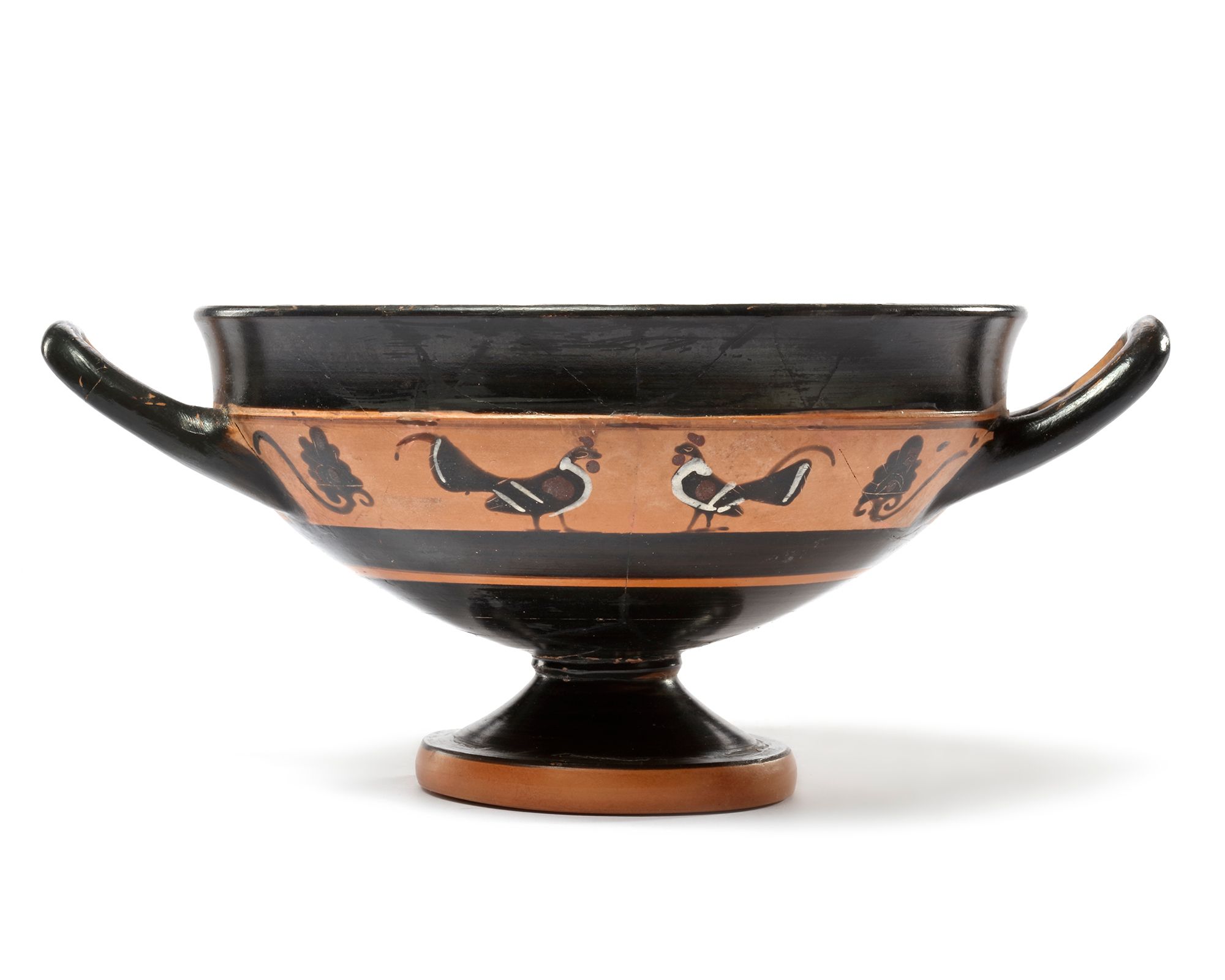 A charming small Kylie/cup often called 'Little-master cups' from the well known Tleson painter. Here we have a very good example of his work with both sides showing facing cockerels, one of his favorite subjects. The piece is assembled from fragments but is otherwise in good condition. There is a possible grafitto on the inside, perhaps Phoenician.