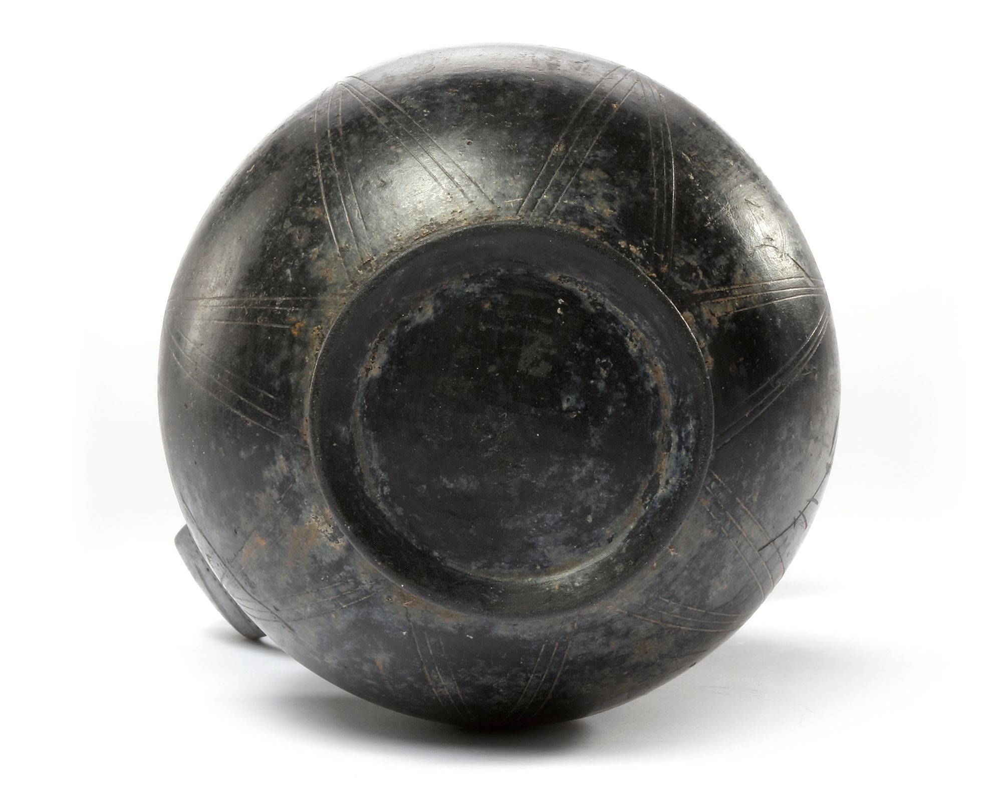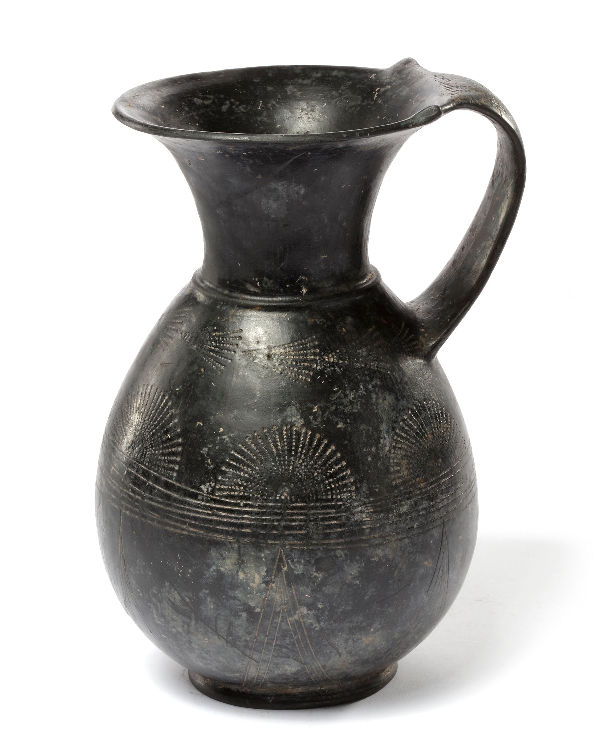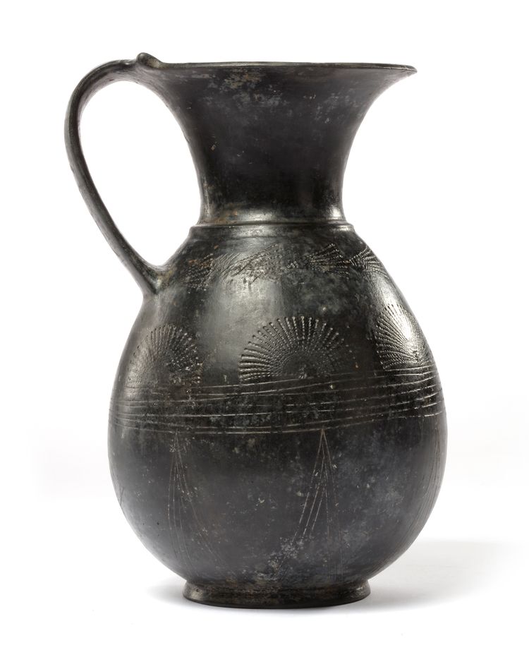 A very fine 'Bucchero' ware pinochle from the archaic period in Etruria. Decorated with very fine geometric patterns made with thin walls, a very elegant vessel from this period and culture. Bucchero ware ceramics were fired in sealed ovens in order for the oxygen to be reduced in order to obtain the black finish to the vessels.