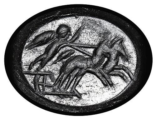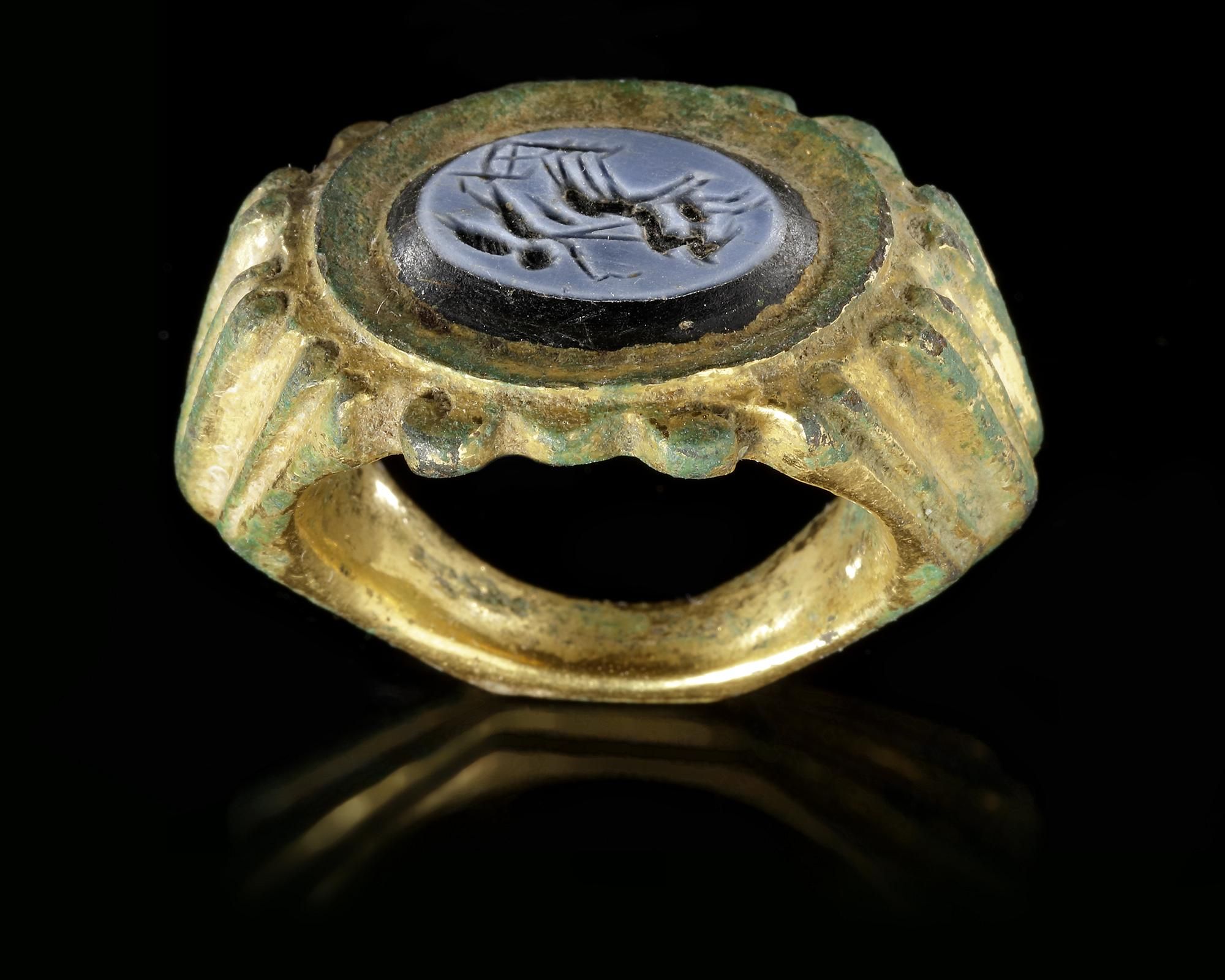 A Late Roman gilded bronze ring with glass paste intaglio, showing a victory driving a biga.